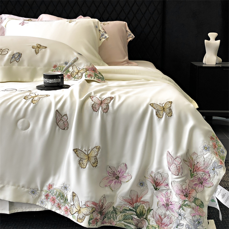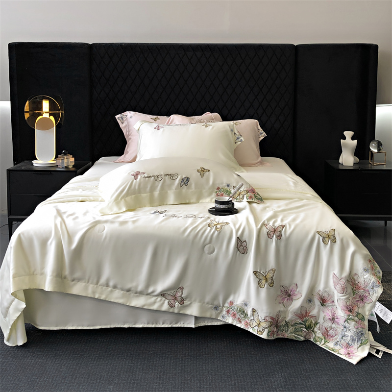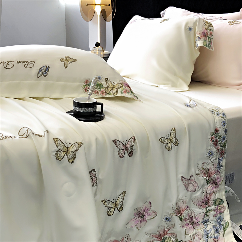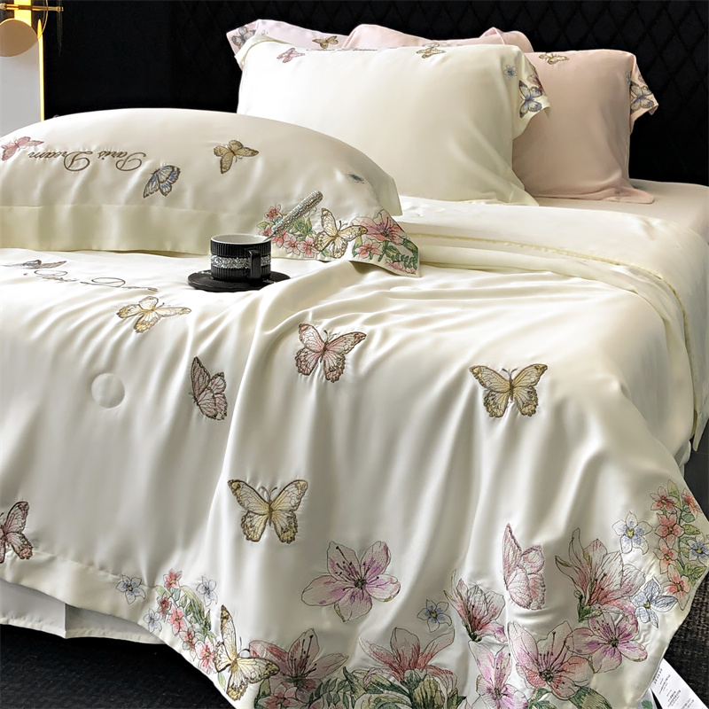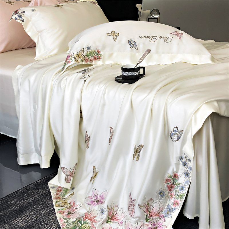 馨蕊家居 2024新款80s兰精天丝刺绣夏被四件套-蝶舞花间 蝶舞花间-元气白桃