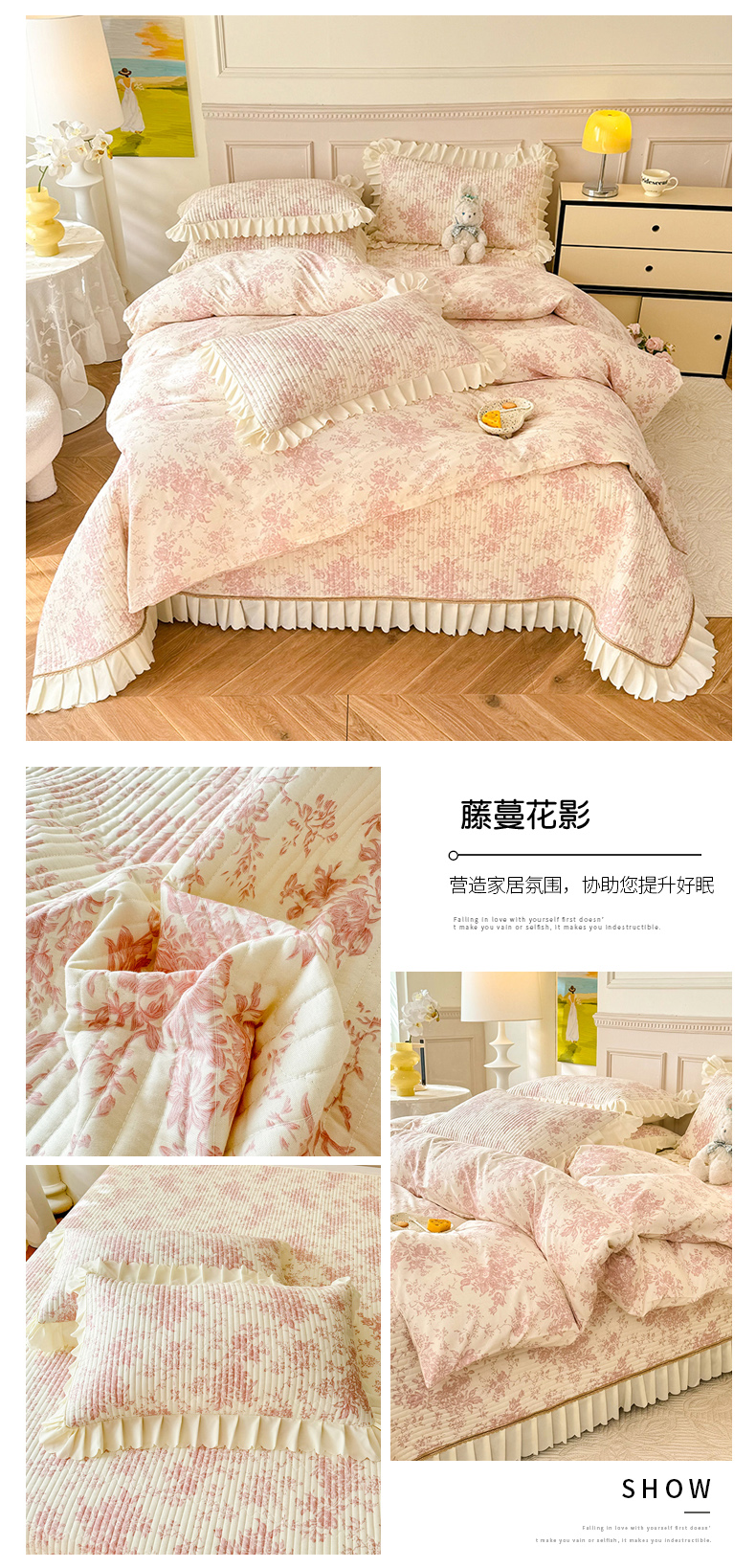 商品名称:美达家纺 2025新款全棉半夹棉花边床盖四件套 藤蔓花影