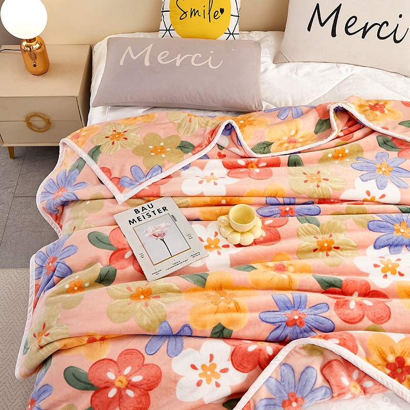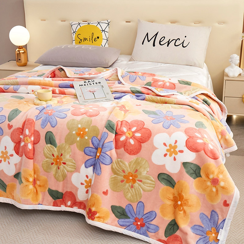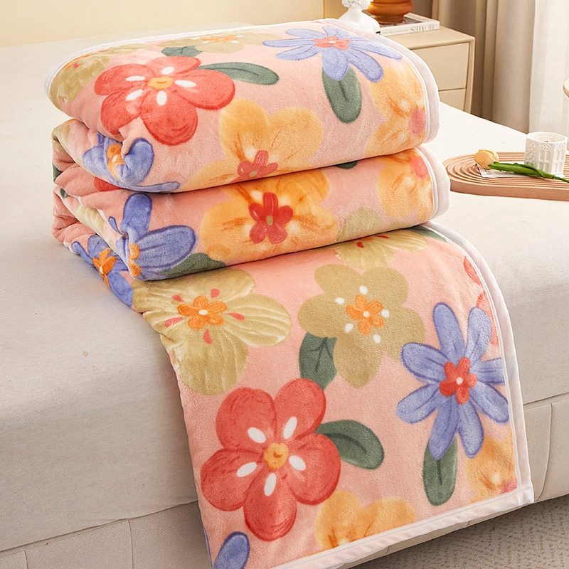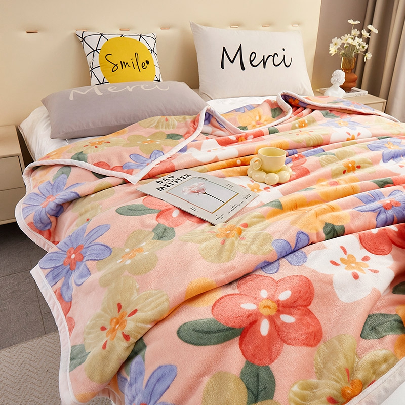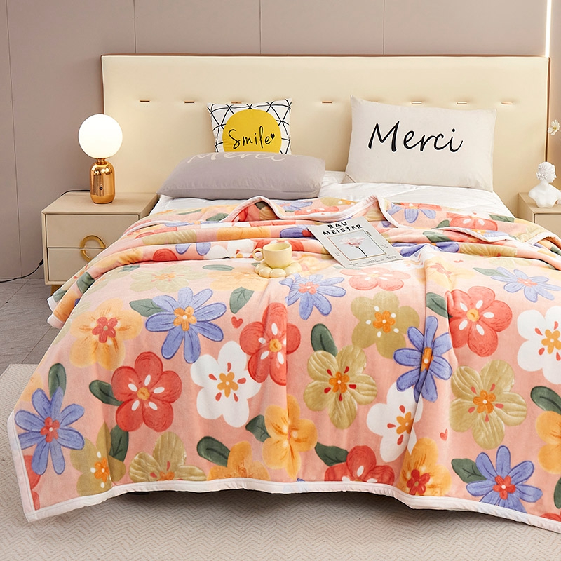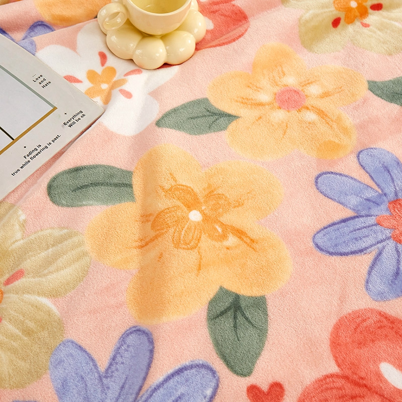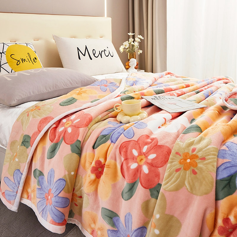 悦织湾家纺 2025新款加厚云貂绒双面毛毯盖毯 缤纷花朵-粉