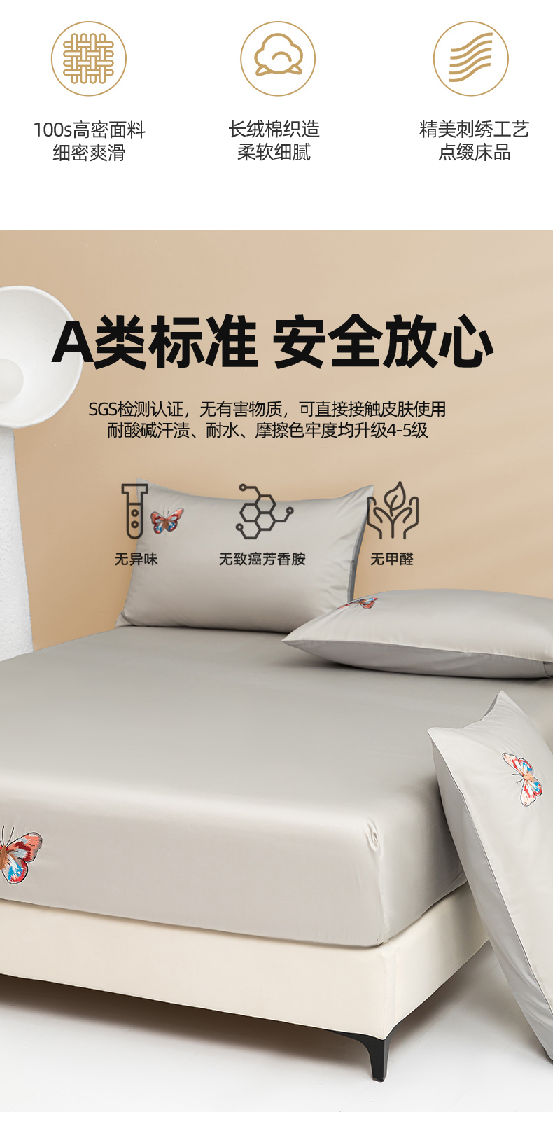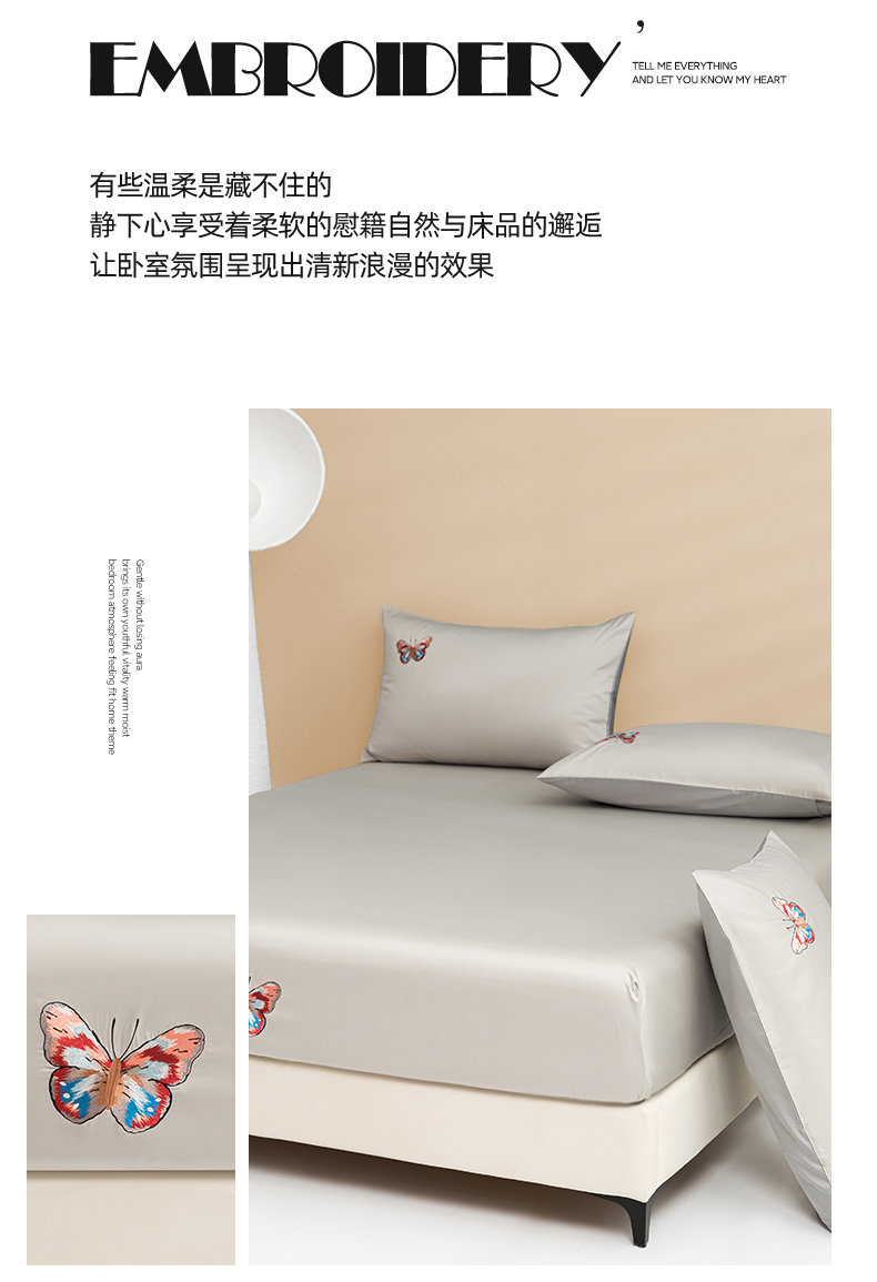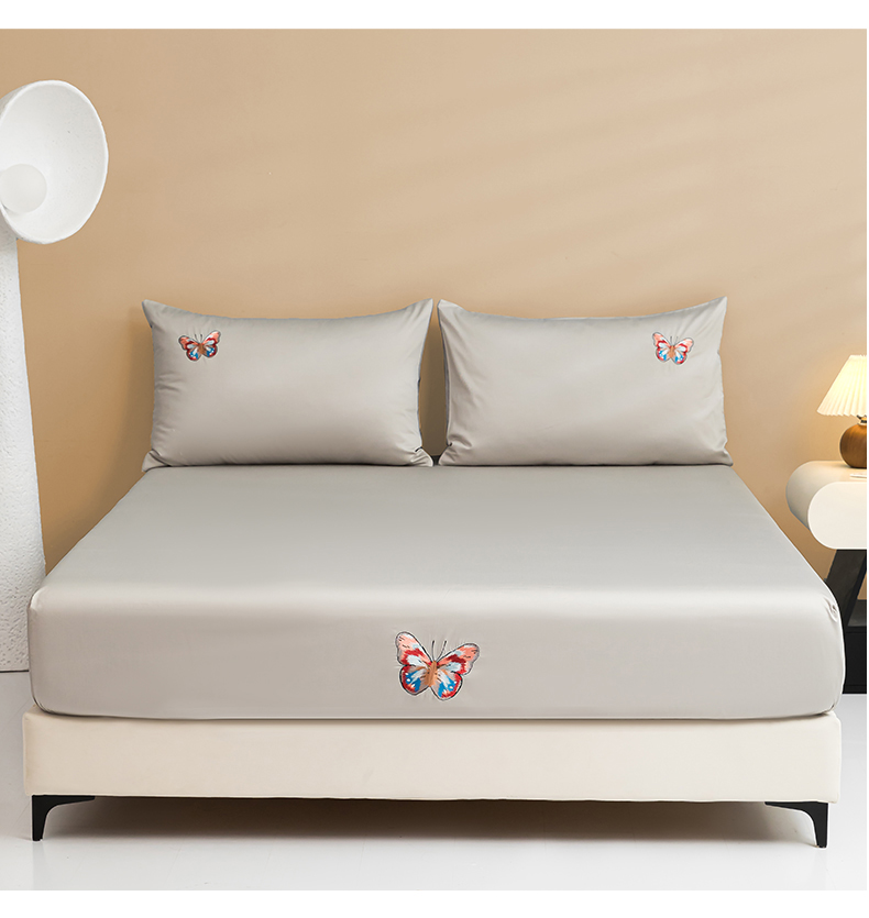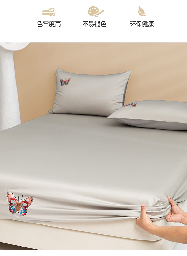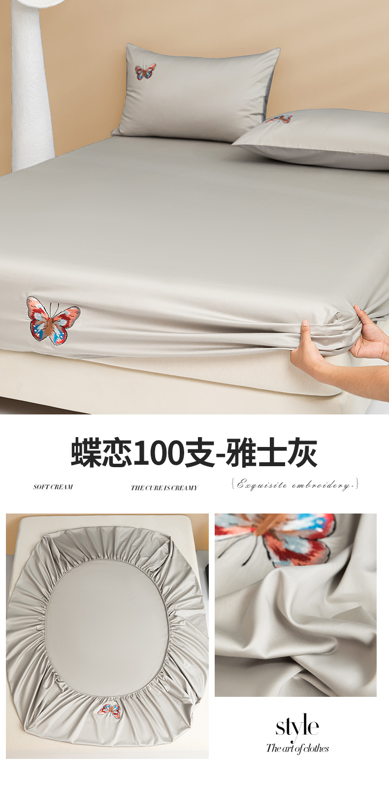 • 91家纺网 家纺一手货源 找家纺 蓝米卡夫 2024新款A类100支全棉刺绣蝶恋系列单床笠三件套 蝶恋100支-雅士灰