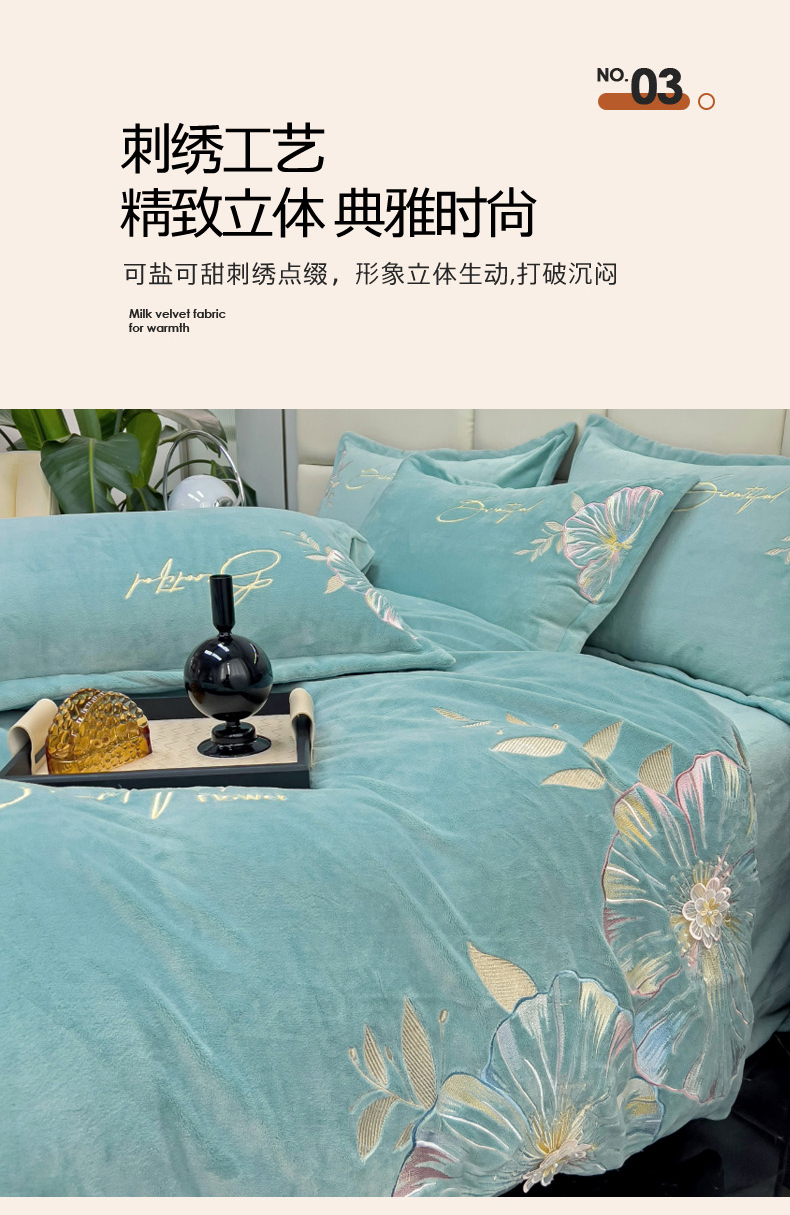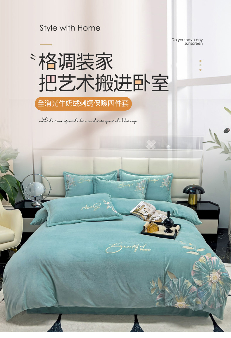 (总)星尚家纺 2024新款保暖全消光A类230g牛奶绒绣花绒四件套-曼妙花园,豆沙粉,孔雀蓝,清新绿,绅士灰,香芋紫,樱花粉