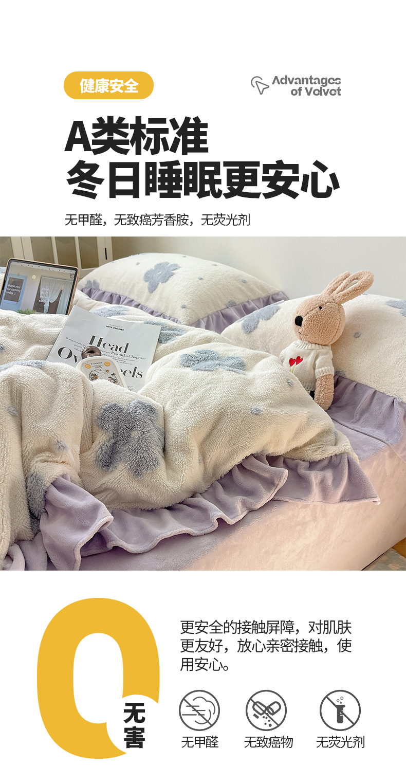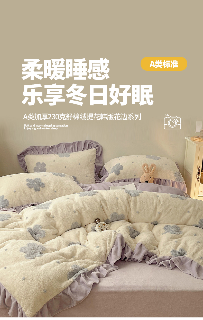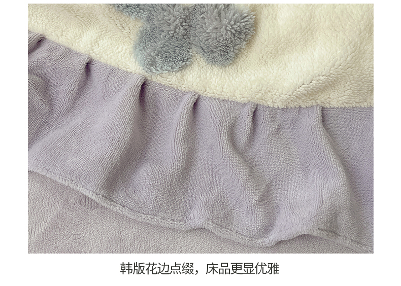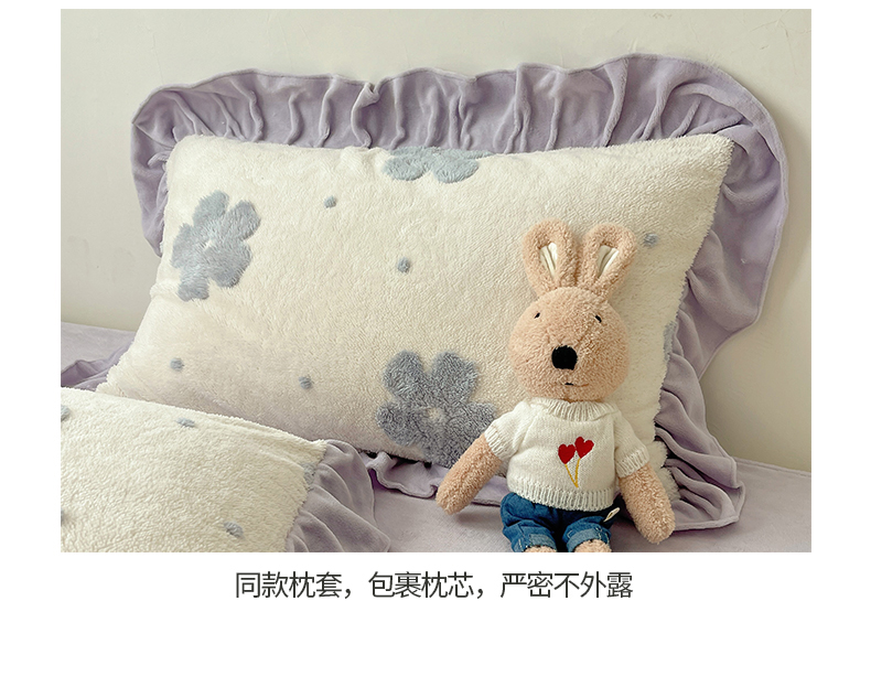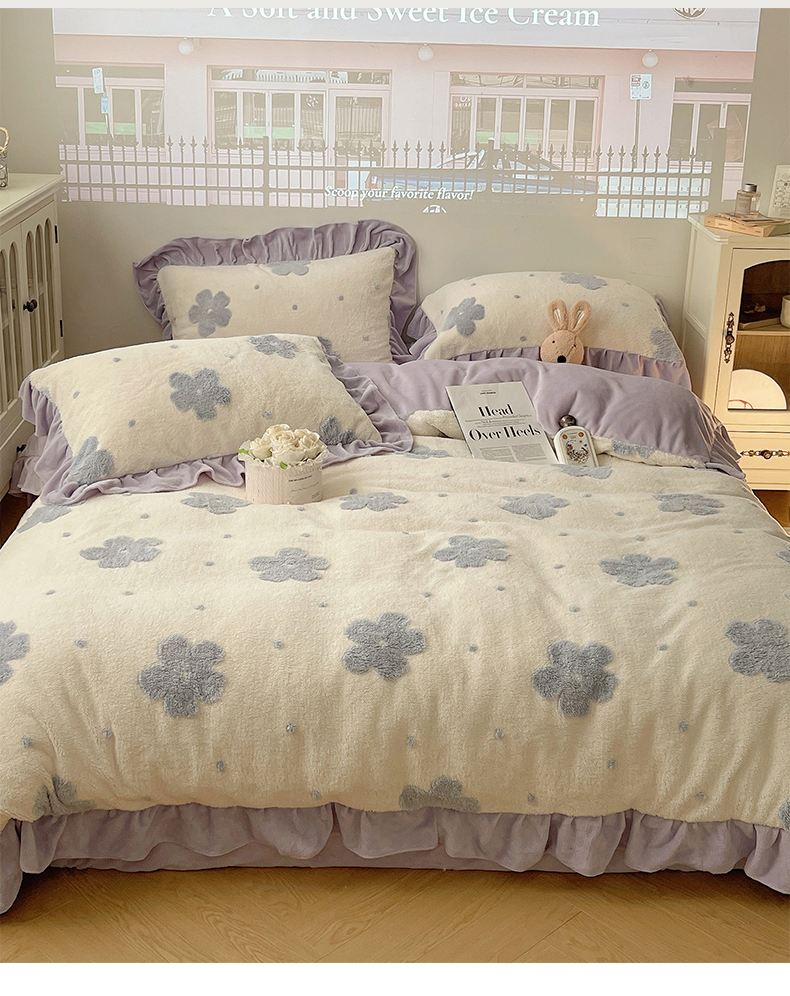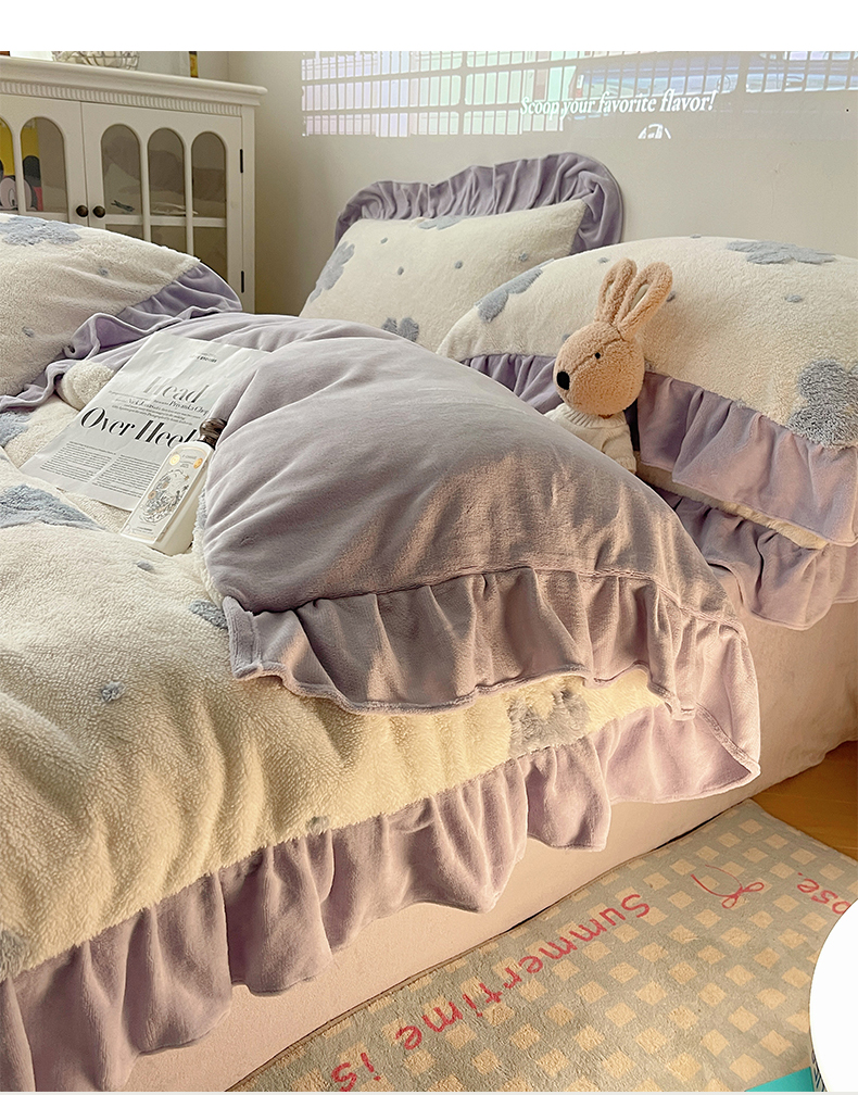 当前位置: 91家纺网 > 商品网购 > 床品套件 > 四件套 > 牛奶绒四件套 > 桃子家居 2024新款A类加厚230克色纱提花蝴蝶少女花花韩版花边舒棉绒牛奶绒系列四件套 舒棉绒花边-少女花花白紫
