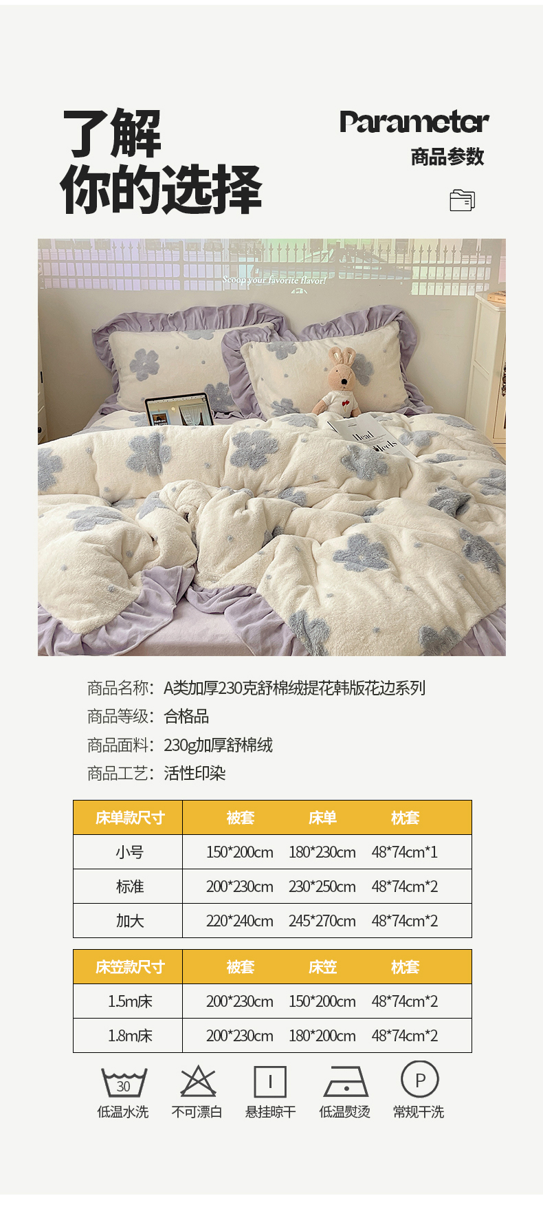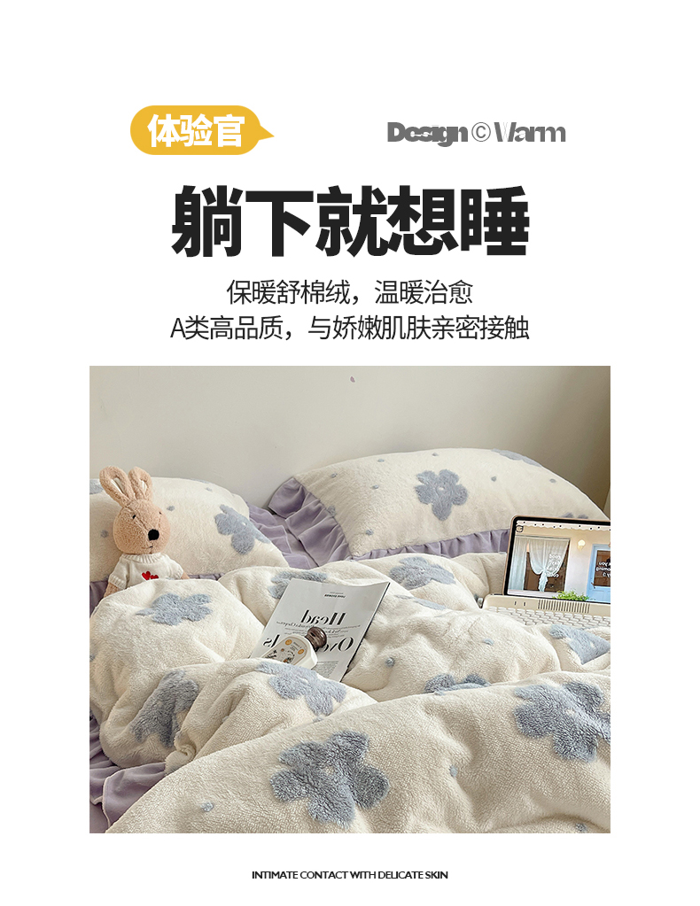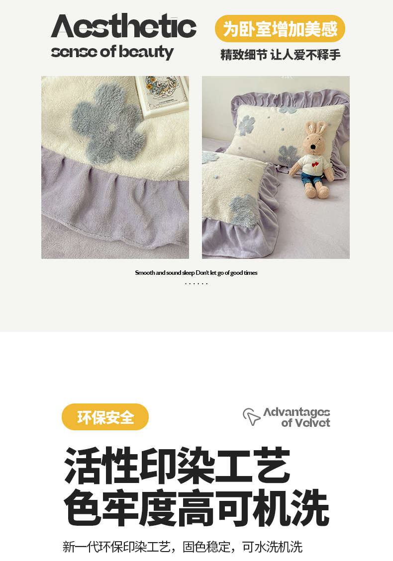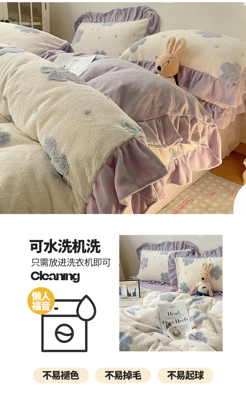 当前位置: 91家纺网 > 商品网购 > 床品套件 > 四件套 > 牛奶绒四件套 > 桃子家居 2024新款A类加厚230克色纱提花蝴蝶少女花花韩版花边舒棉绒牛奶绒系列四件套 舒棉绒花边-少女花花白紫