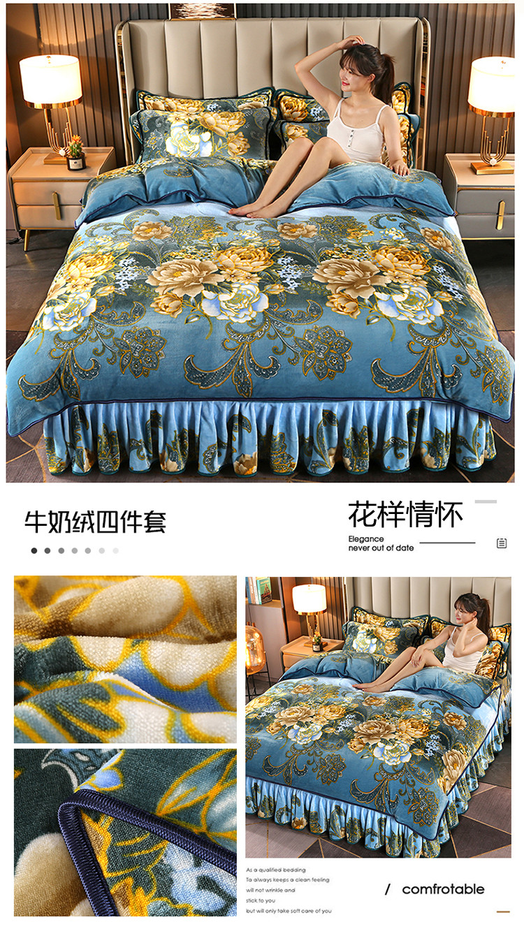 商品名称:橘姿 2024新款8斤床裙款牛奶绒四件套 花样情怀