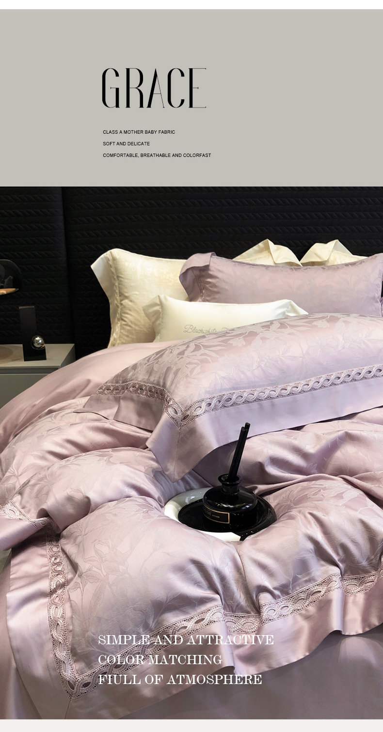 (总)黑白森林2024款 80X80S高支天丝棉四件套镂空蕾丝花边天丝全棉,尚美-晨夕粉,尚美-古象白,尚美-青砂绿,尚美-银雪灰