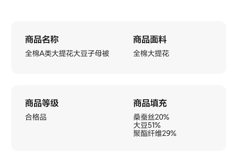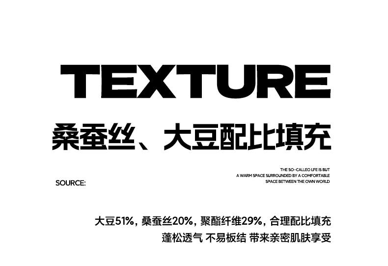 • 填充纤维种类: 大豆蛋白改性聚酯纤维
