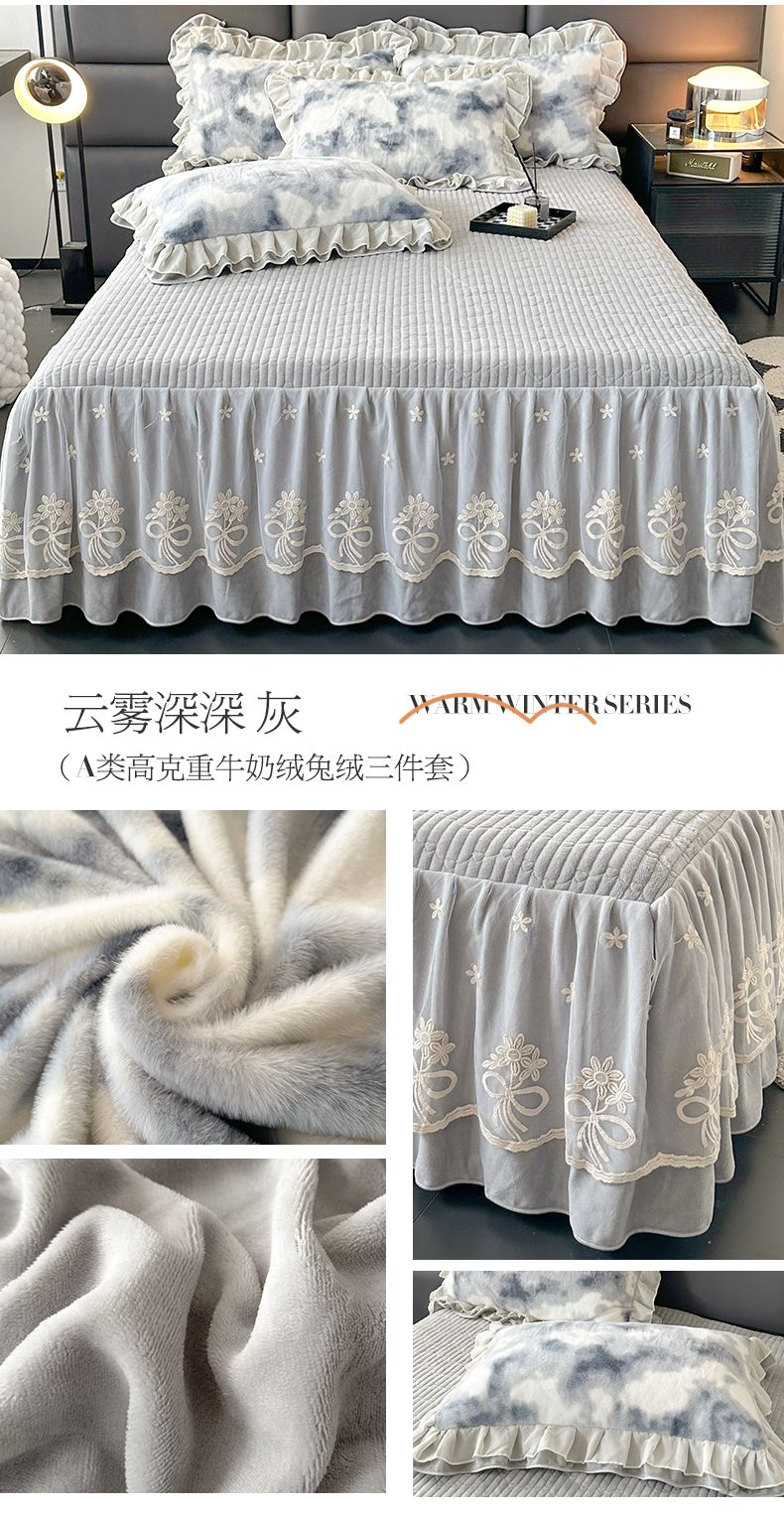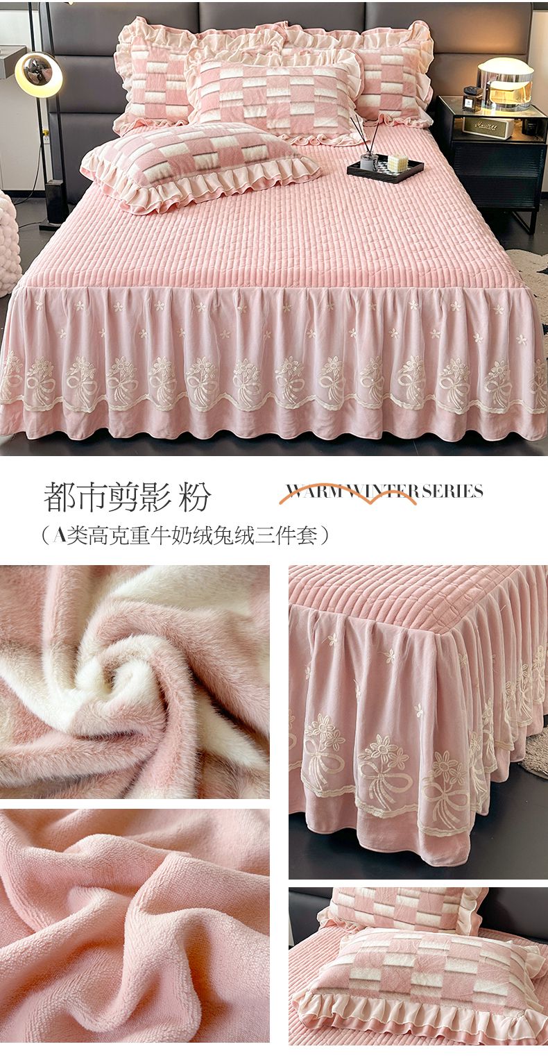 当前位置: 91家纺网 > 商品网购 > 床品套件 > 三件套 > 宜凡家纺 2024新款高克重牛奶绒兔绒床裙三件套 云雾深深 粉
