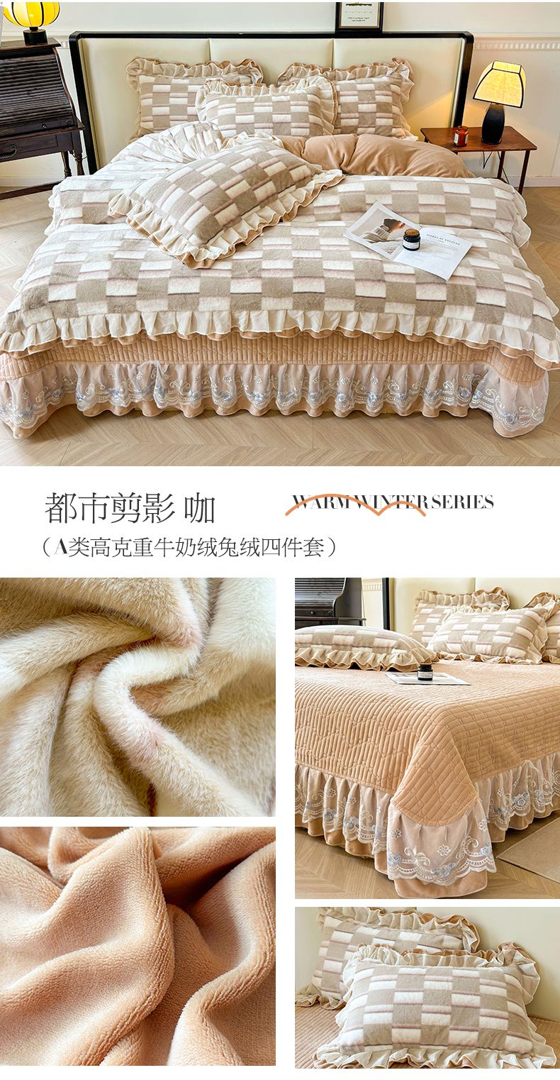宜凡家纺 2024新款高克重牛奶绒兔绒床盖四件套 都市剪影 咖