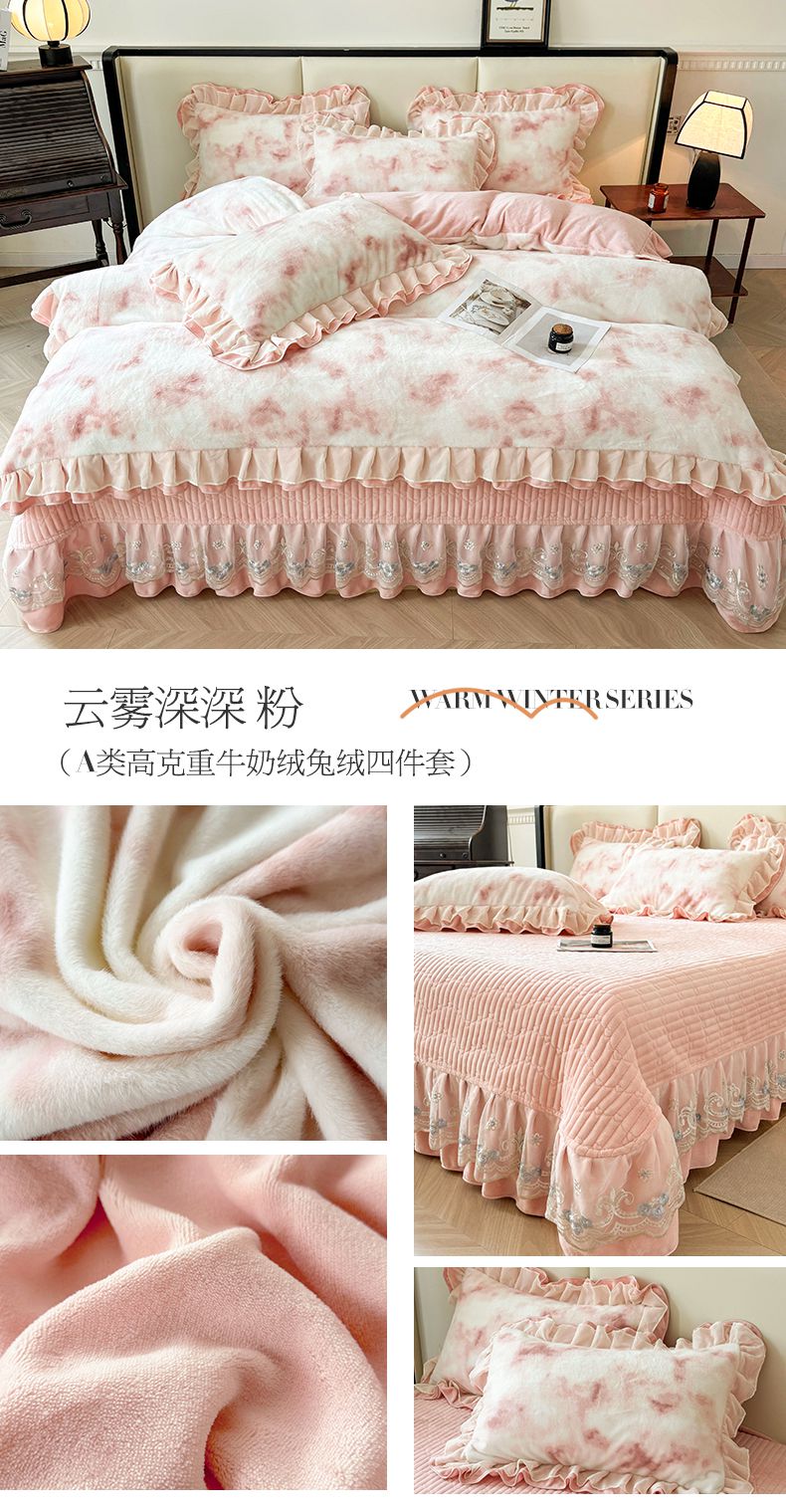 (总)宜凡家纺 2025新款兔绒提花牛奶绒夹棉床裙四件套,爱心 少女粉,爱心 粉紫,爱心 驼色,蝶舞 大红,蝶舞 米色,蝶舞 浅紫,蝶舞 玉色,简爱 苍青,简爱 豆沙紫,简爱 玉色,樱桃 苍青,樱桃 豆沙紫,樱桃 奶油白