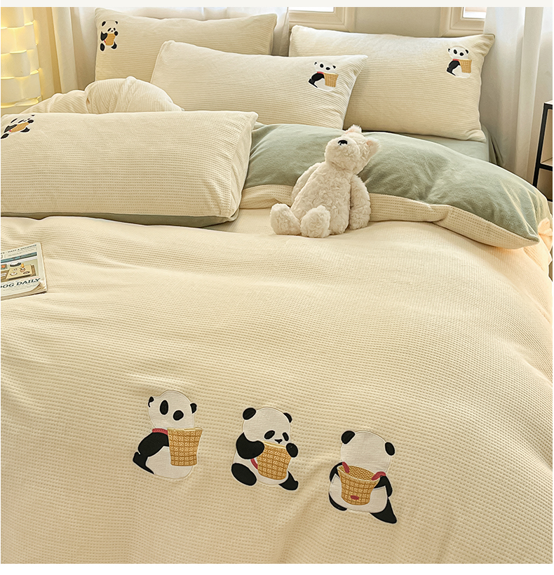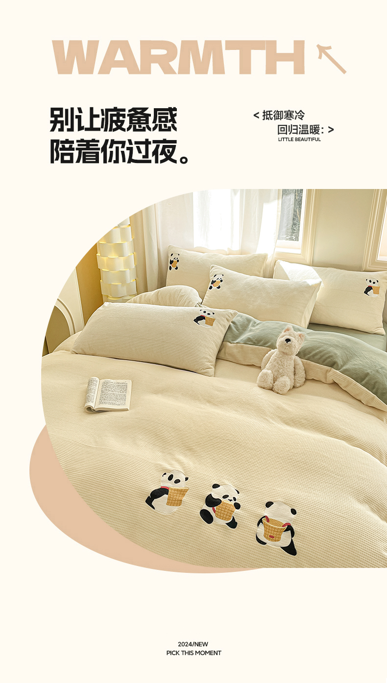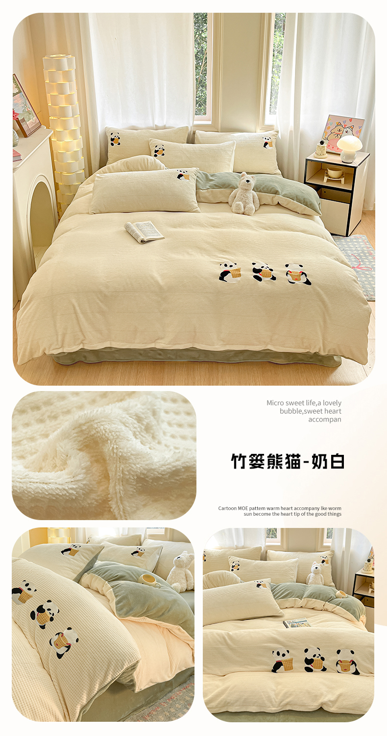 丽涵家纺 2024秋冬新品立体烂花牛奶绒刺绣四件套-竹篓熊猫 竹篓熊猫-奶白