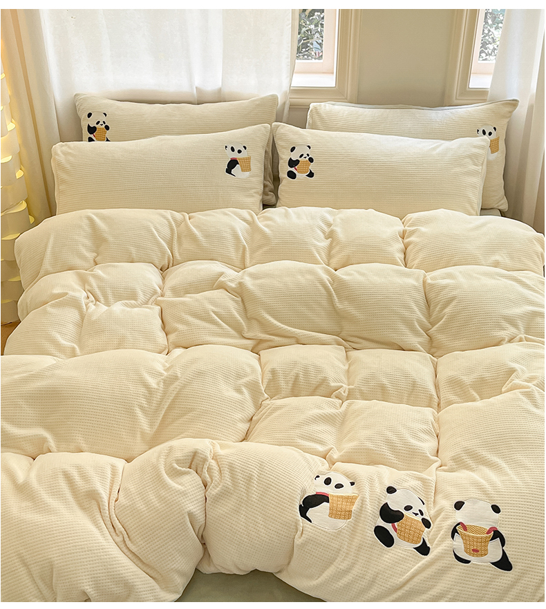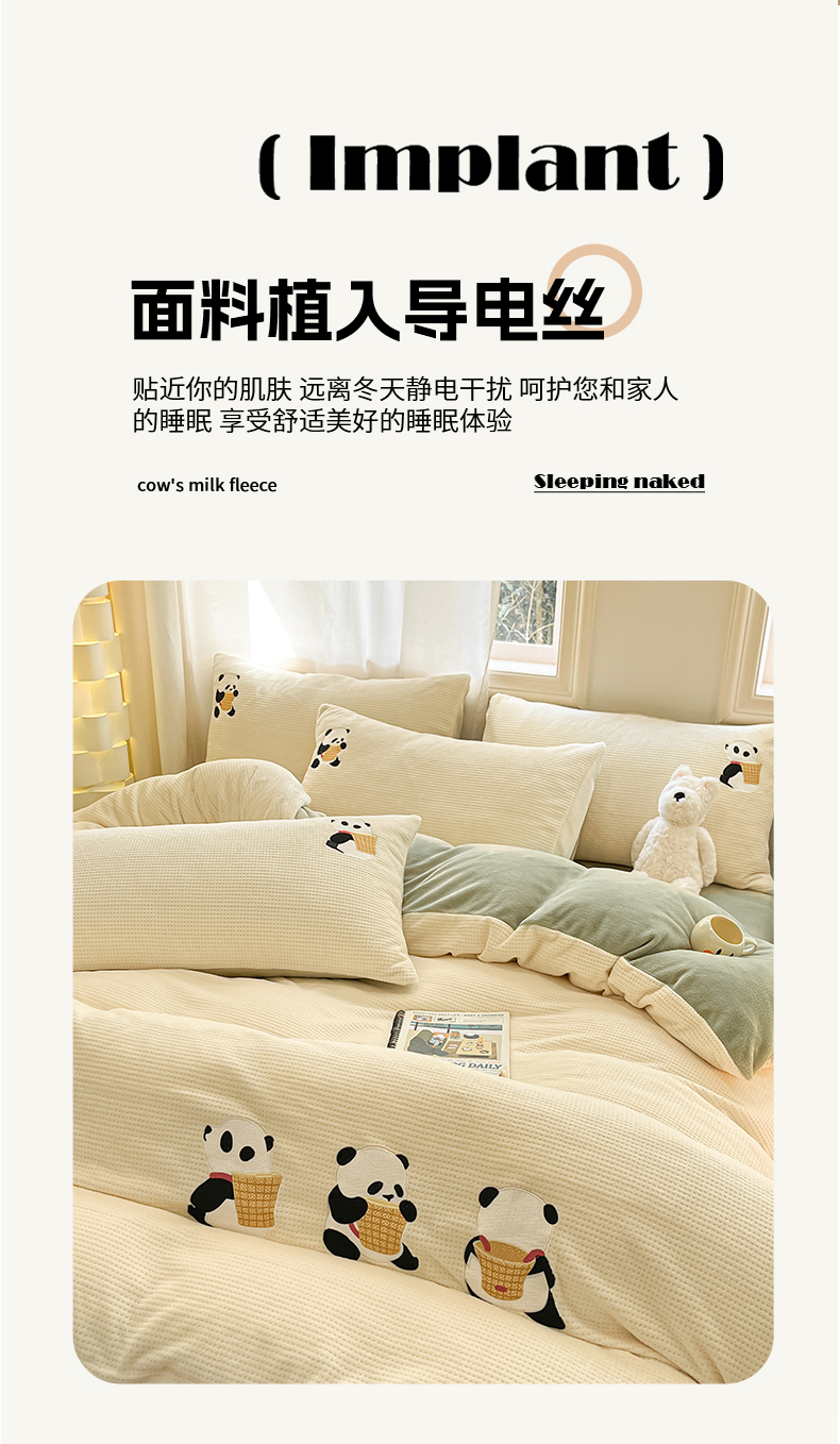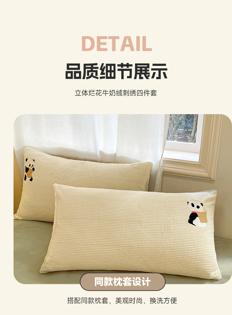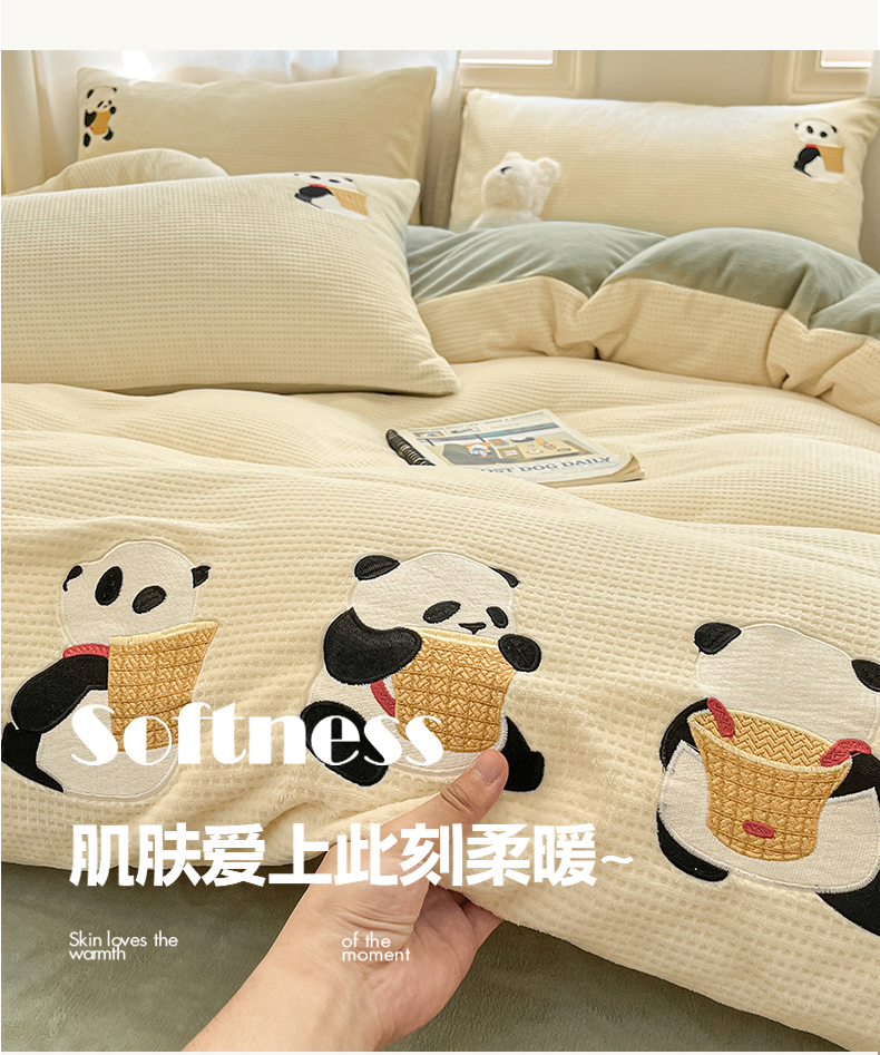 商品名称:丽涵家纺 2024秋冬新品立体烂花牛奶绒刺绣四件套-竹篓熊猫 竹篓熊猫-奶白