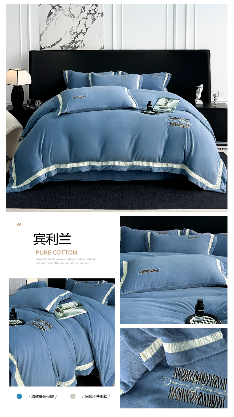 商品名称:子曰 2024新款高克重牛奶绒大拼角刺绣轻奢工艺款四件套-罗马假日 宾利兰
