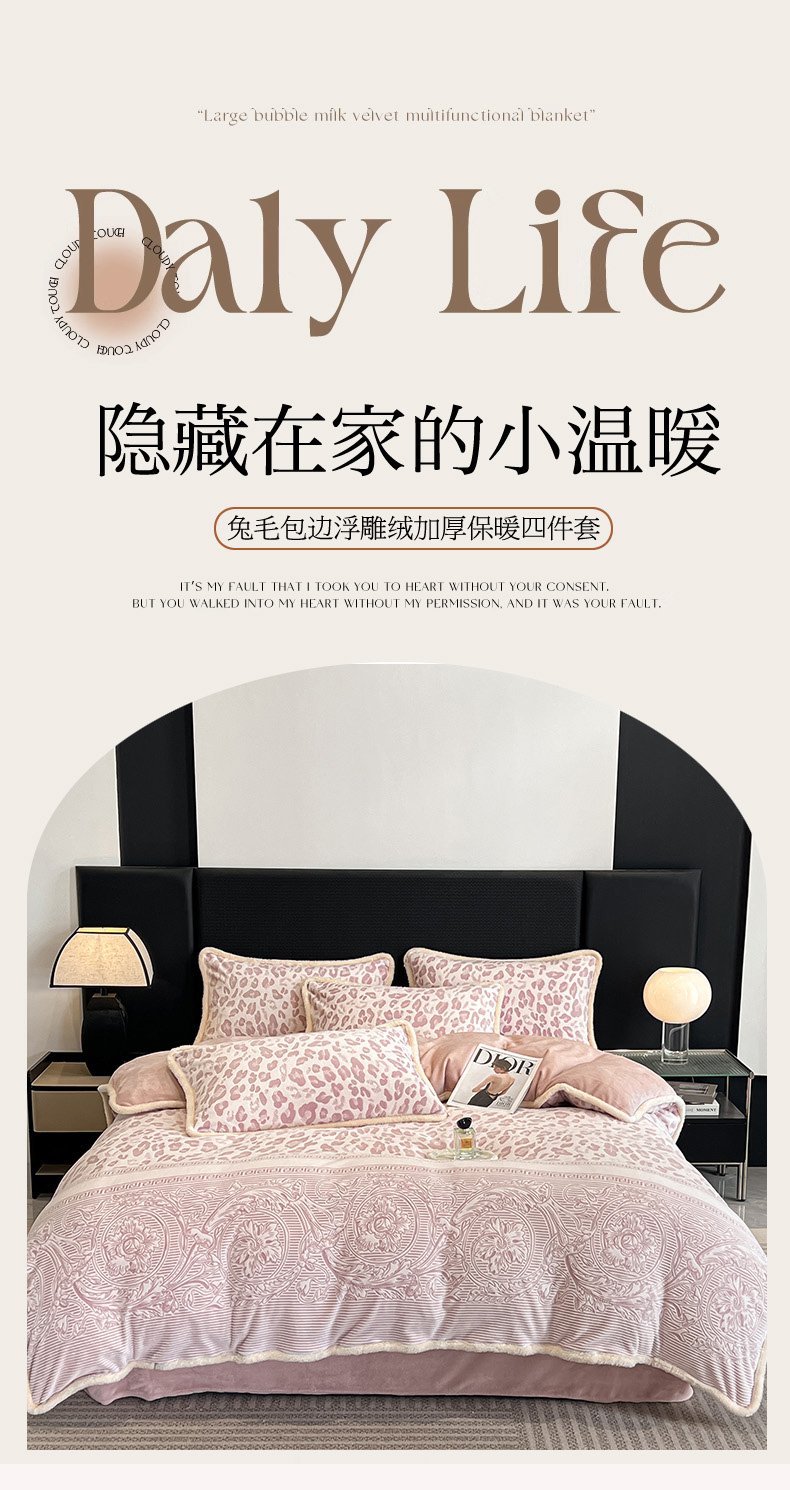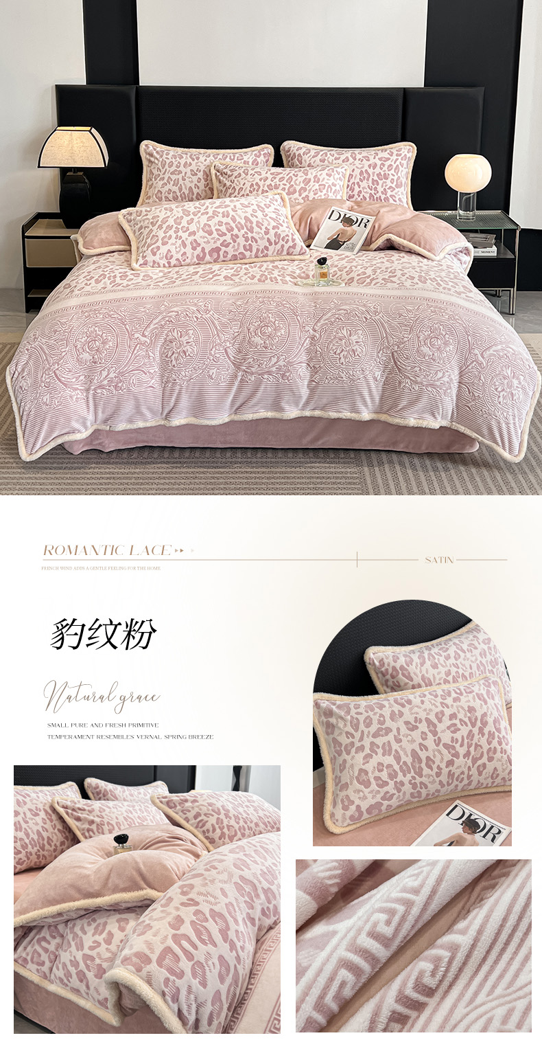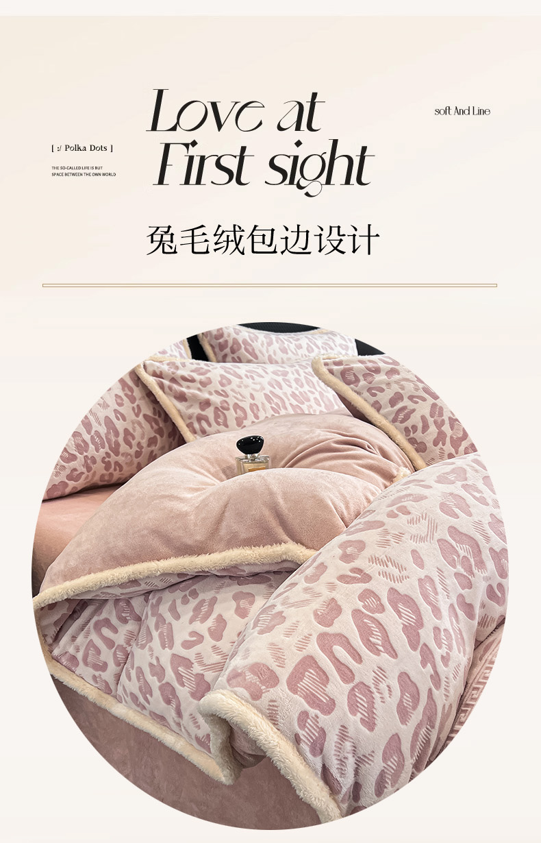 • 91家纺网 家纺一手货源 找家纺 倾慕家纺 2024新款兔毛包边浮雕绒套件单被套 兔毛包边豹纹粉