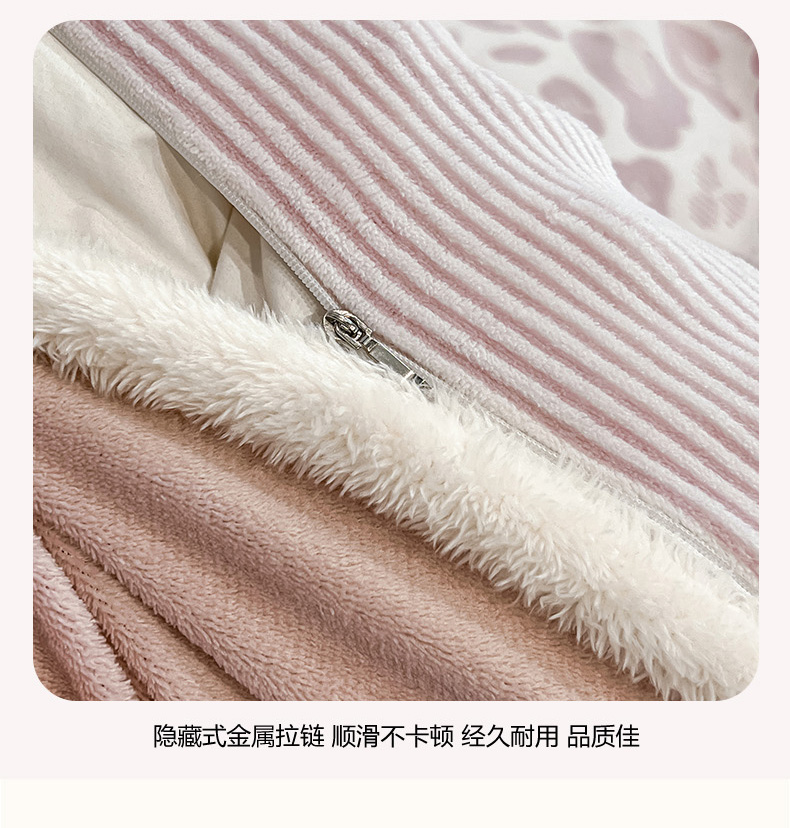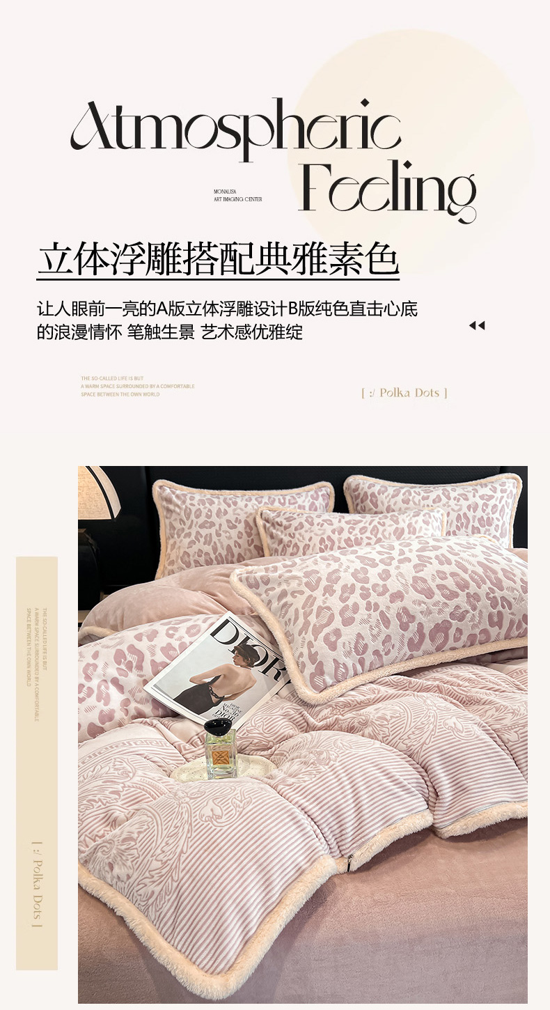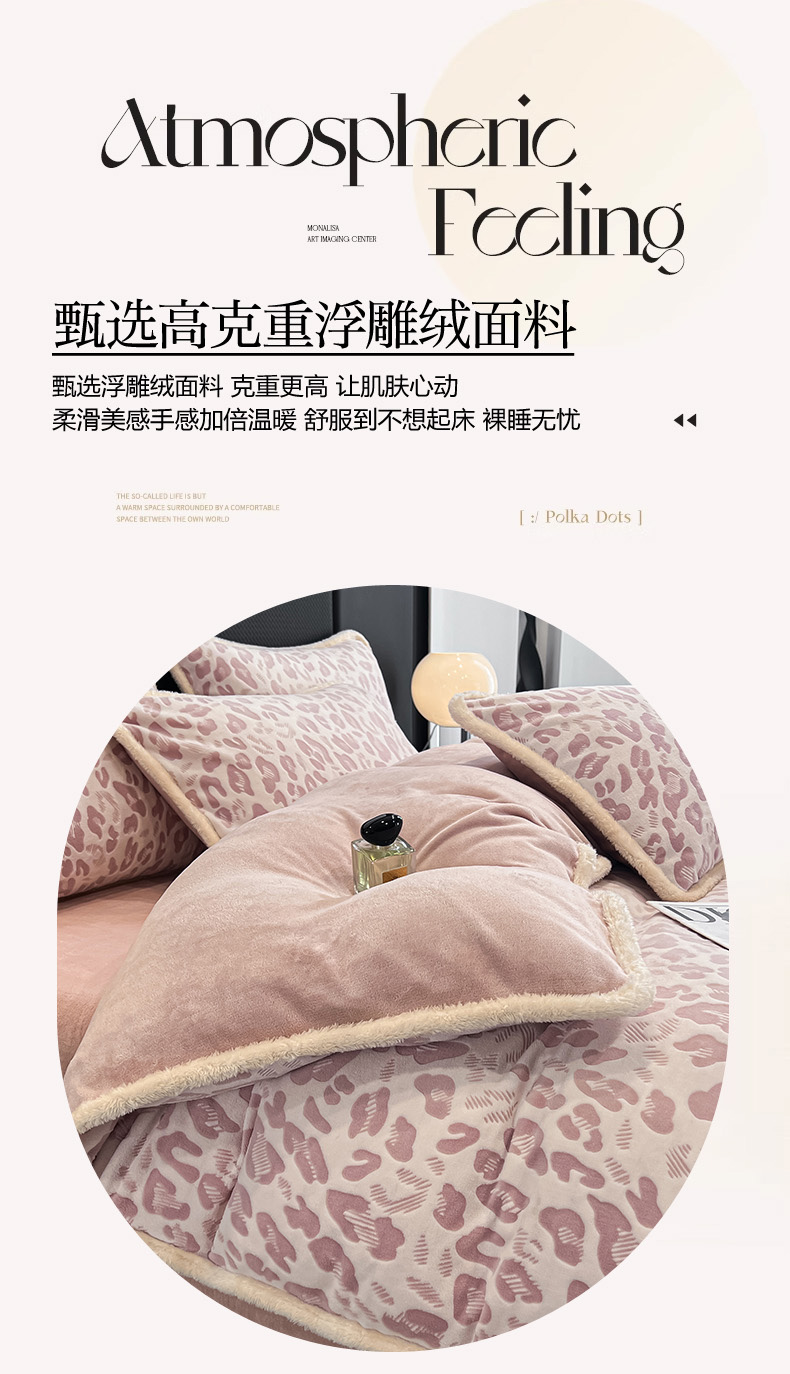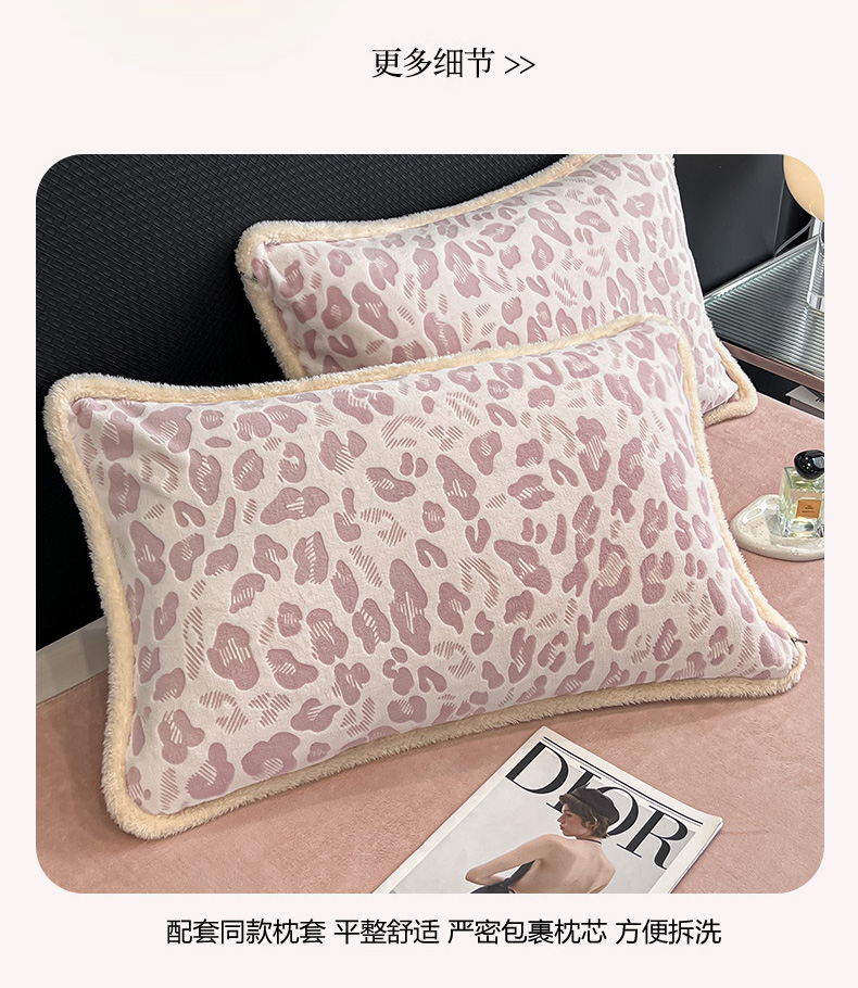 • 91家纺网 家纺一手货源 找家纺 倾慕家纺 2024新款兔毛包边浮雕绒套件单被套 兔毛包边豹纹粉