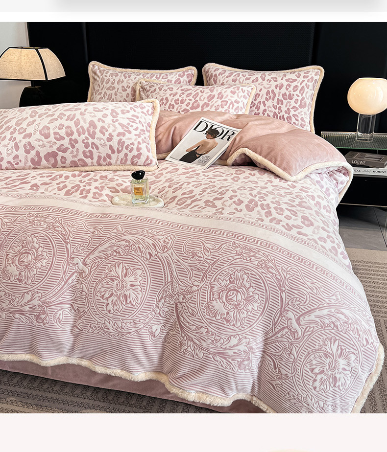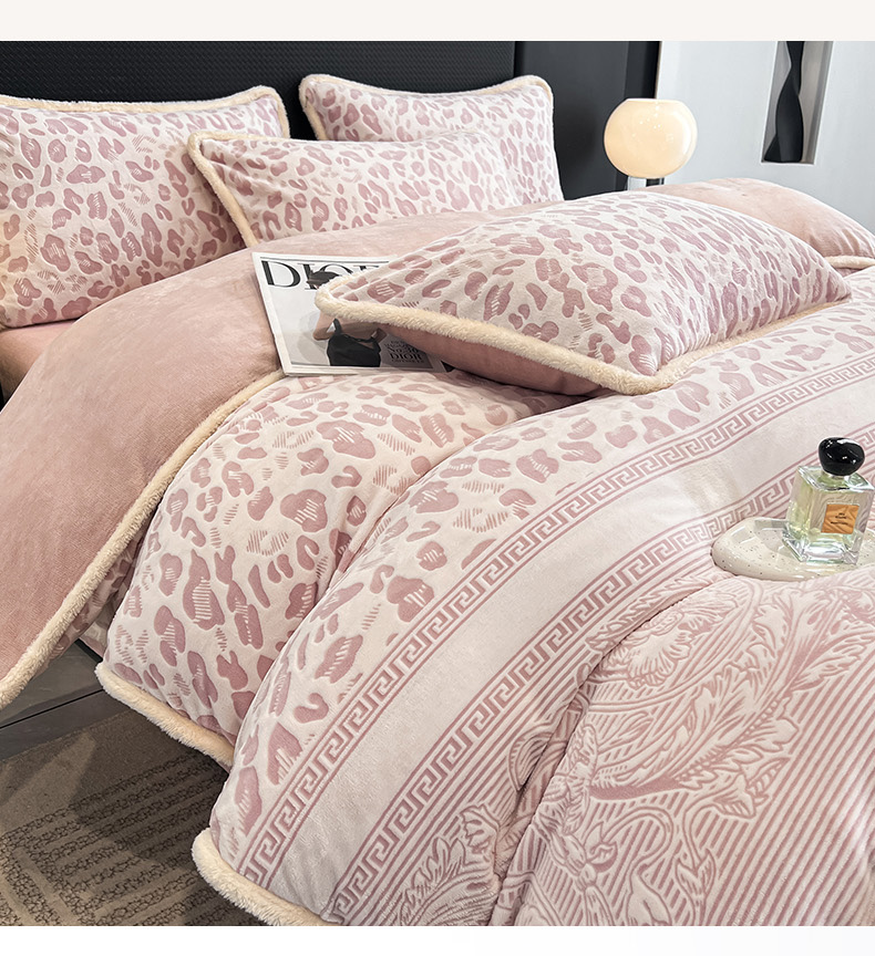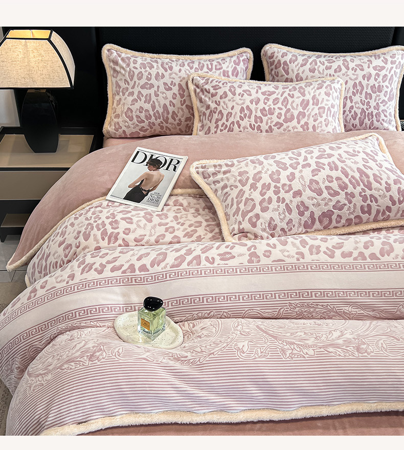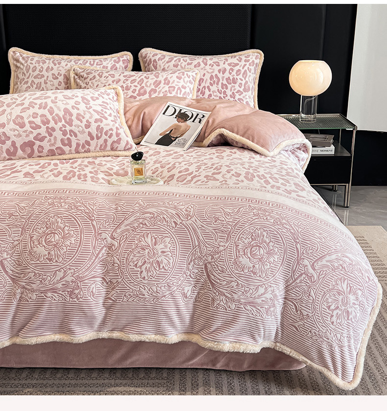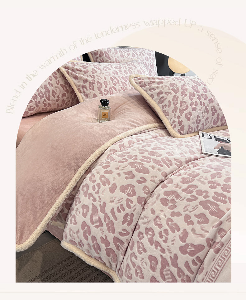 倾慕家纺 2024新款兔毛包边浮雕绒套件单被套 兔毛包边豹纹粉