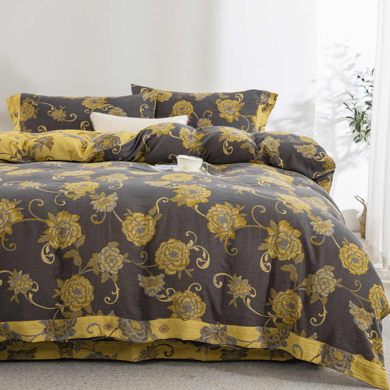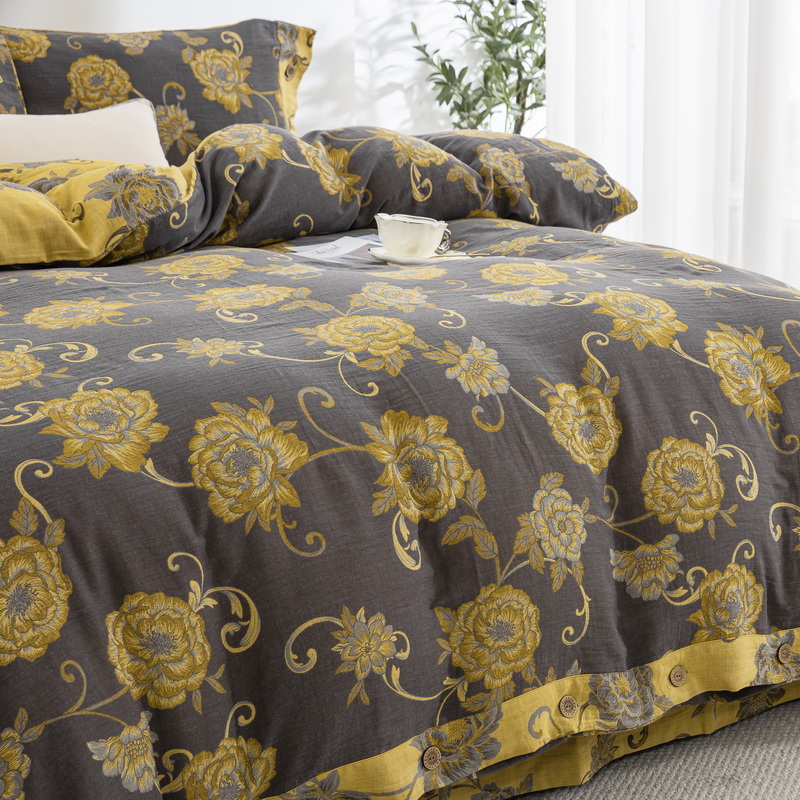 鲁爱 2025新款全棉色织双层纱纽扣款四件套 一路生花-黑金