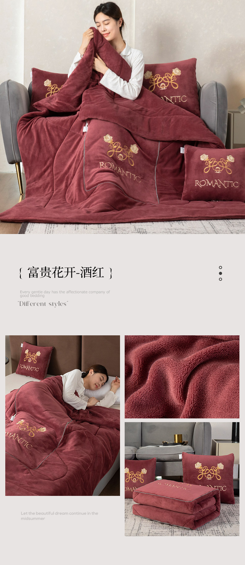 商品名称:雷人家纺 2023新款富贵花开牛奶绒刺绣多功能抱枕被 富贵花开-酒红