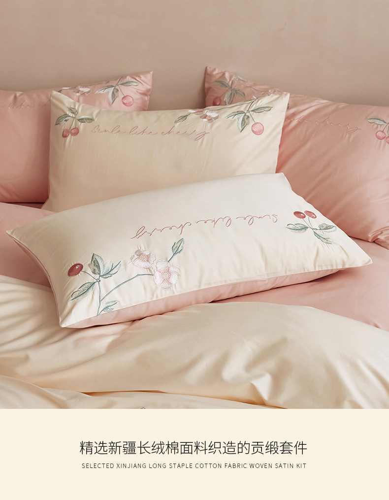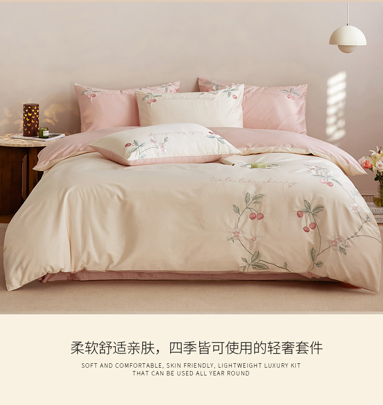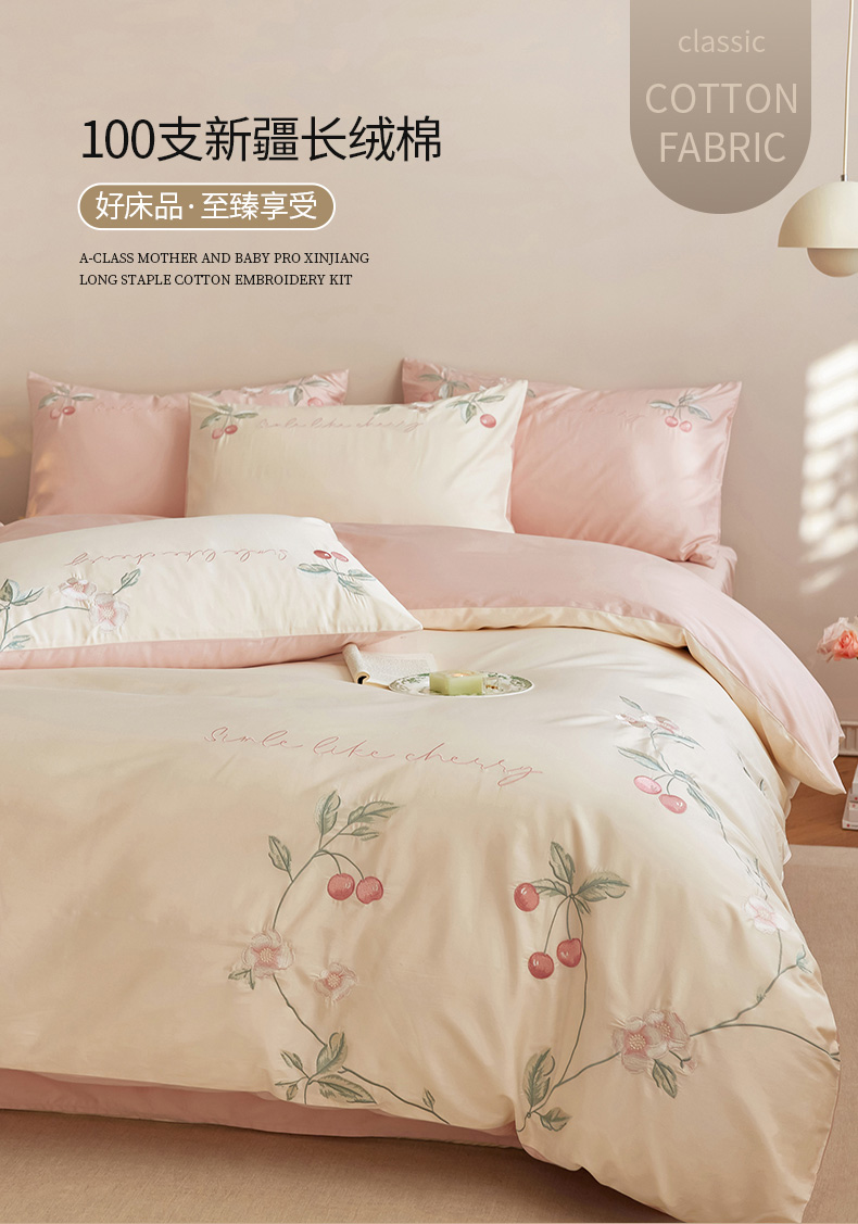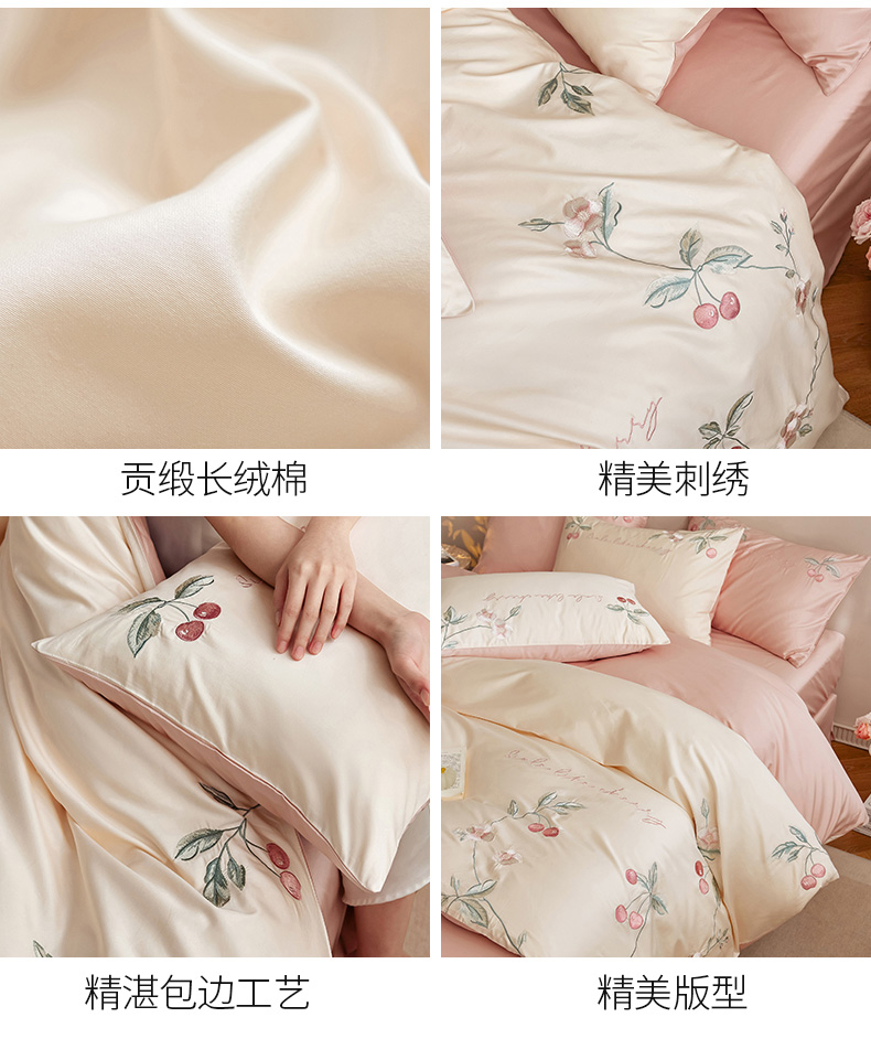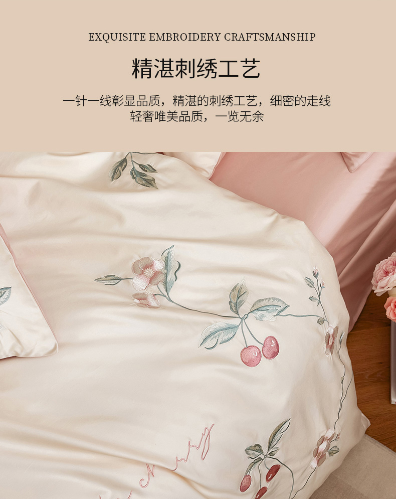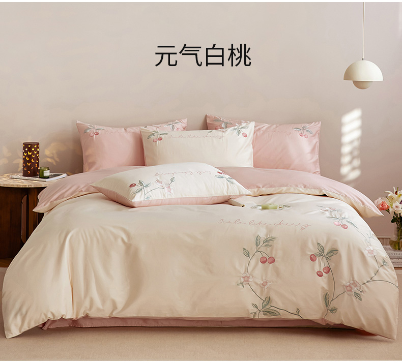 商品名称:爱缦 2025新款100支新疆长绒棉刺绣四件套-时光系列 时光-元气白桃