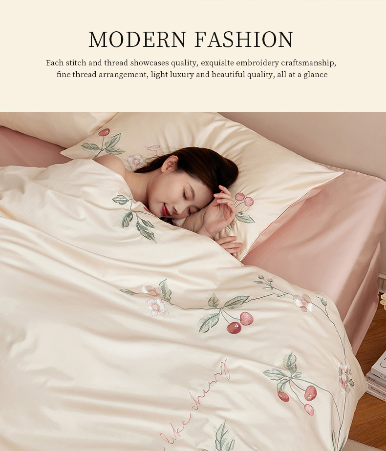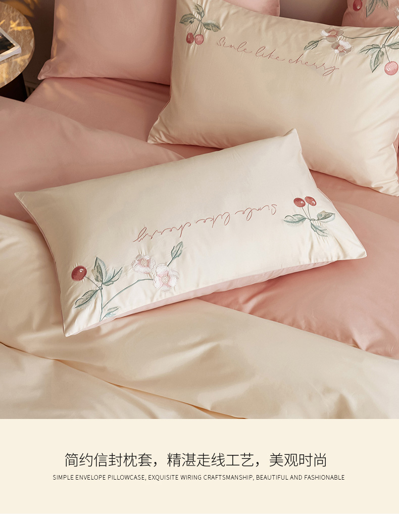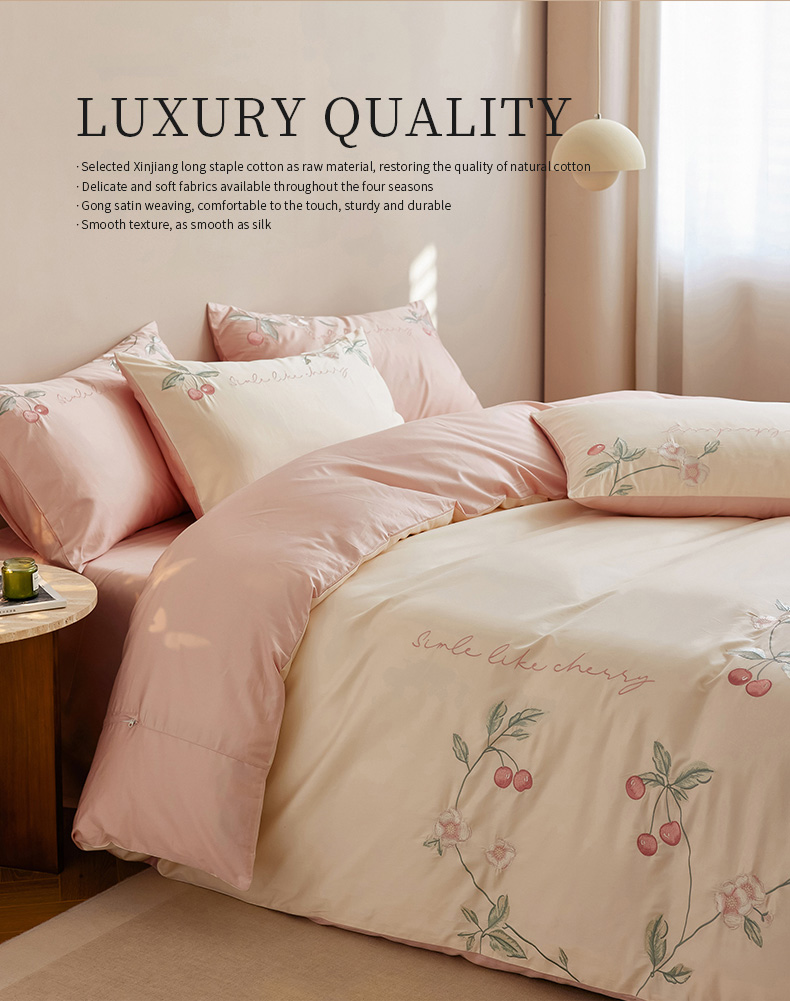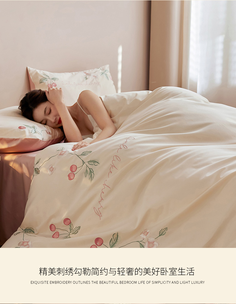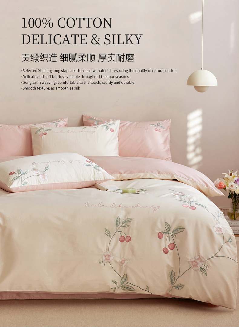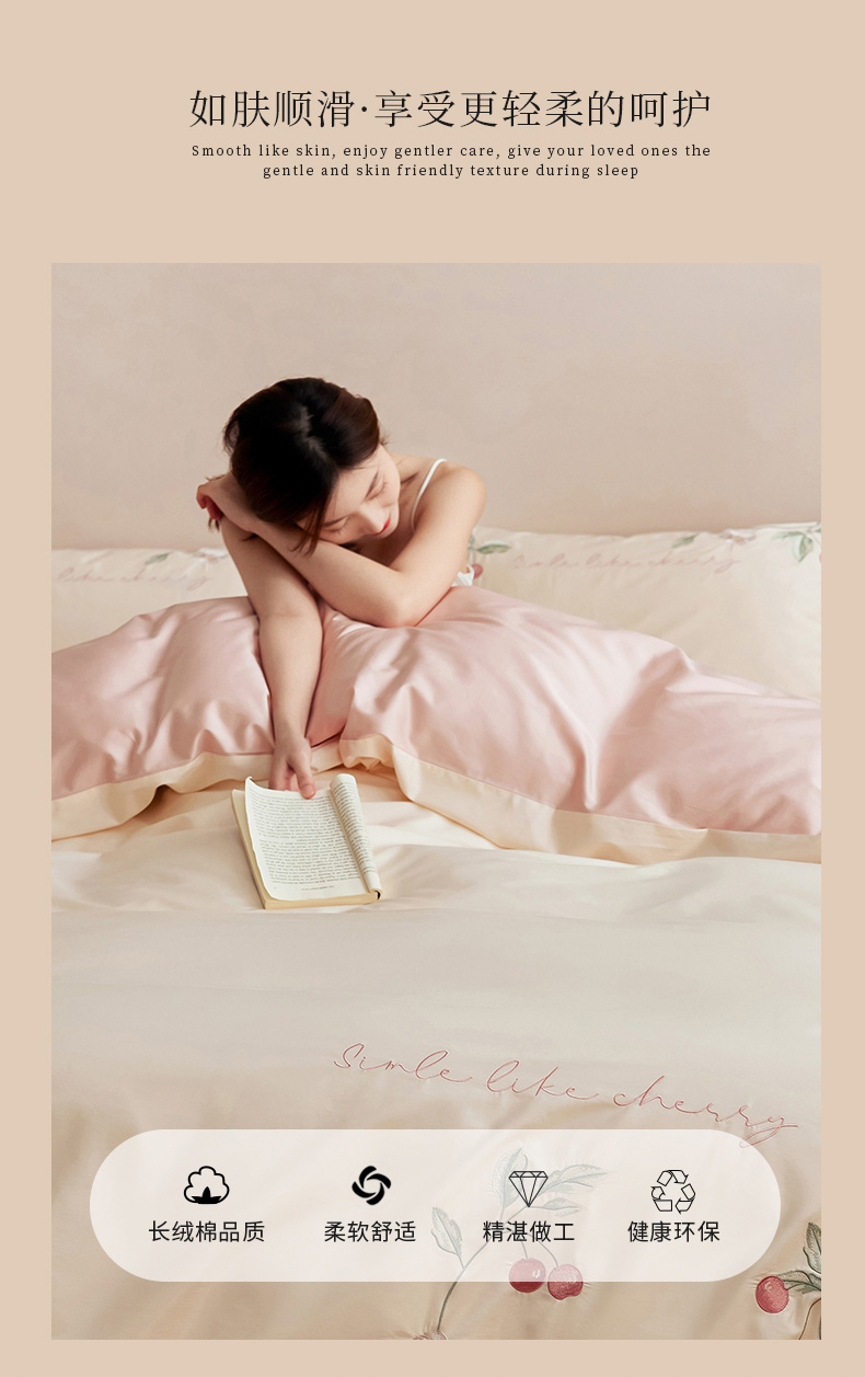 商品名称:爱缦 2025新款100支新疆长绒棉刺绣四件套-时光系列 时光-元气白桃