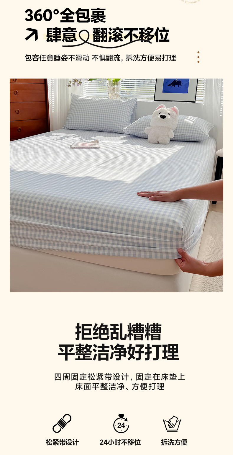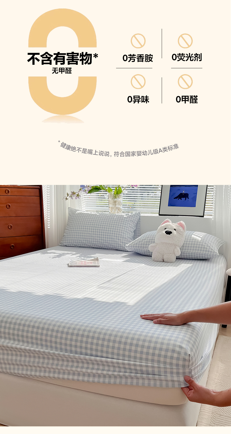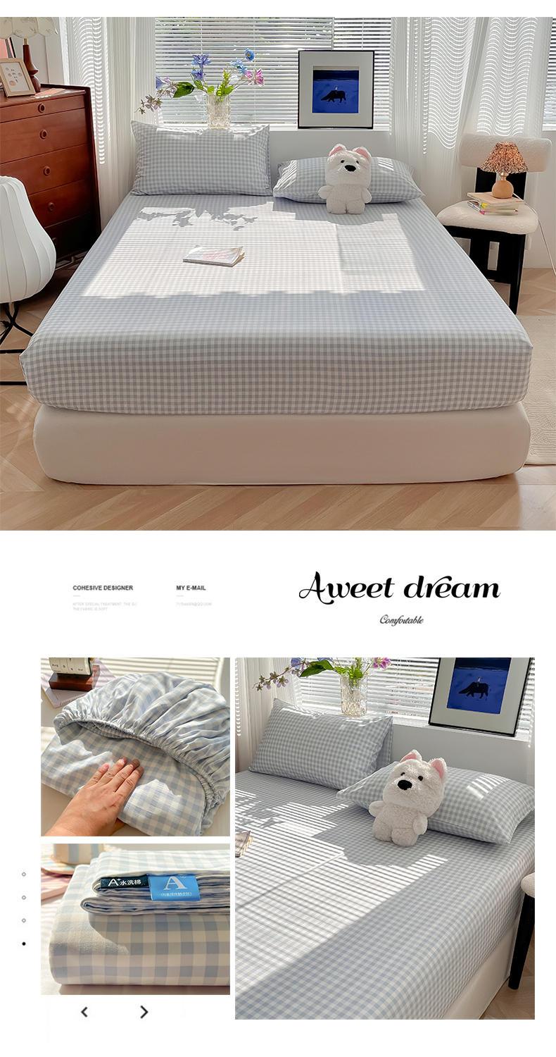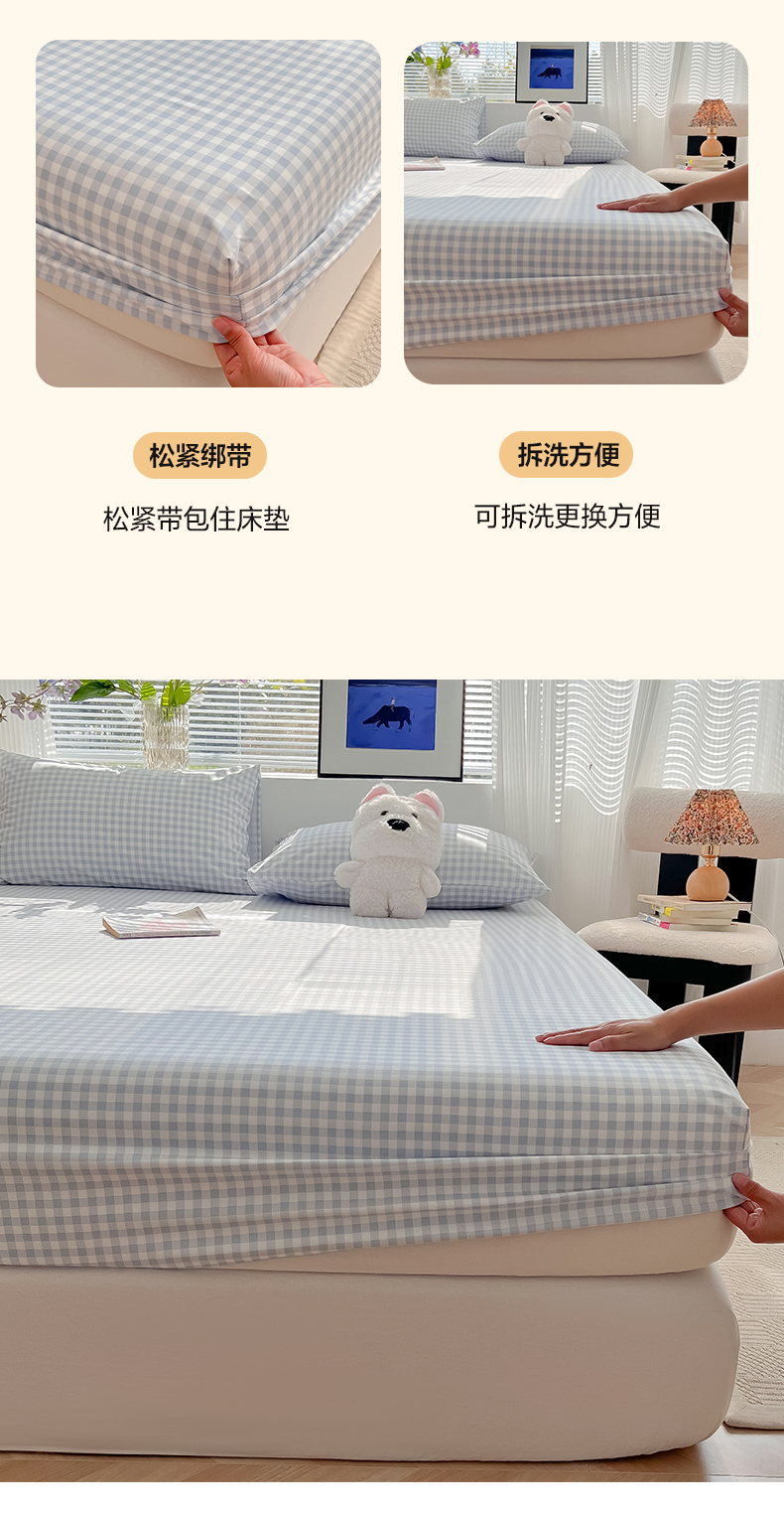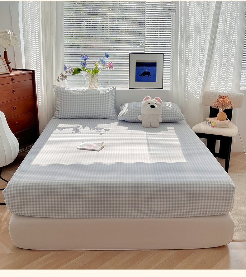 韩巢家纺 2025新款A类纯色格子水洗棉床笠单件床罩床套 浅蓝格