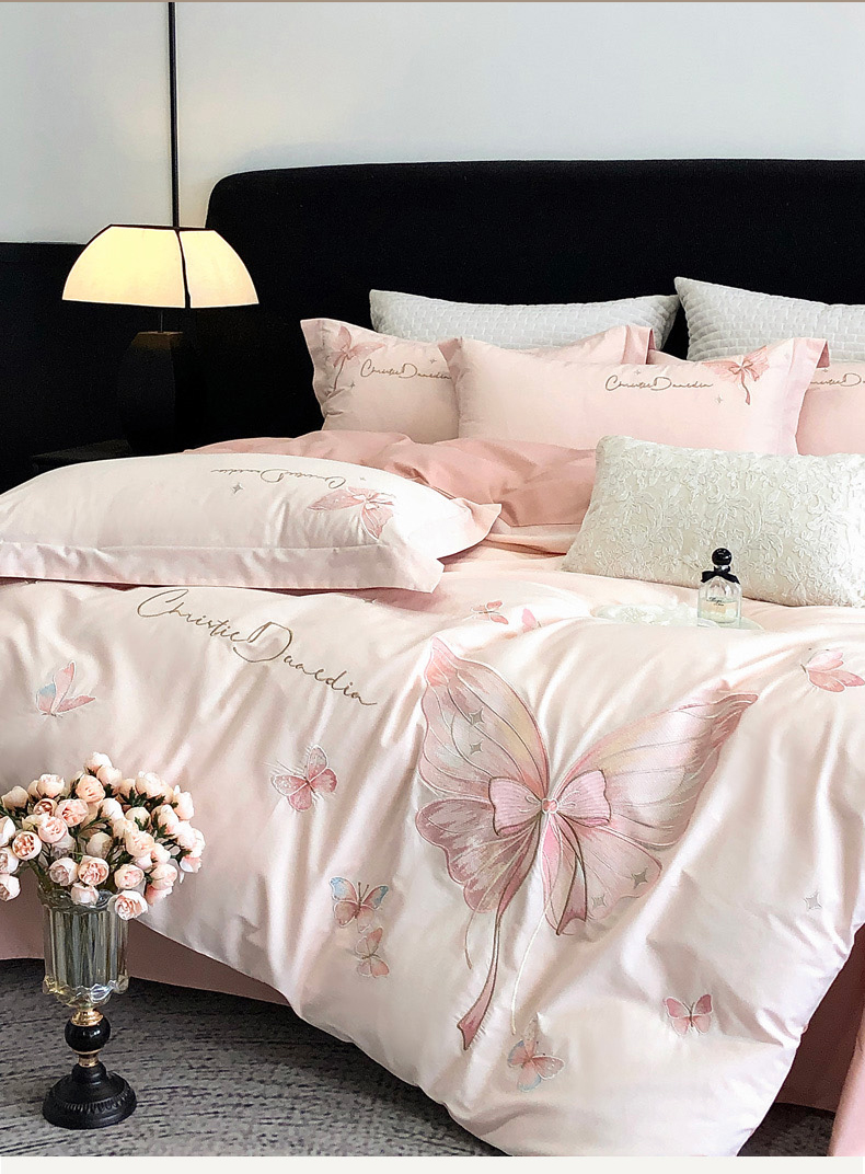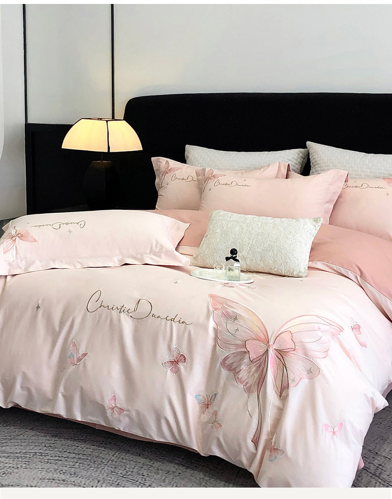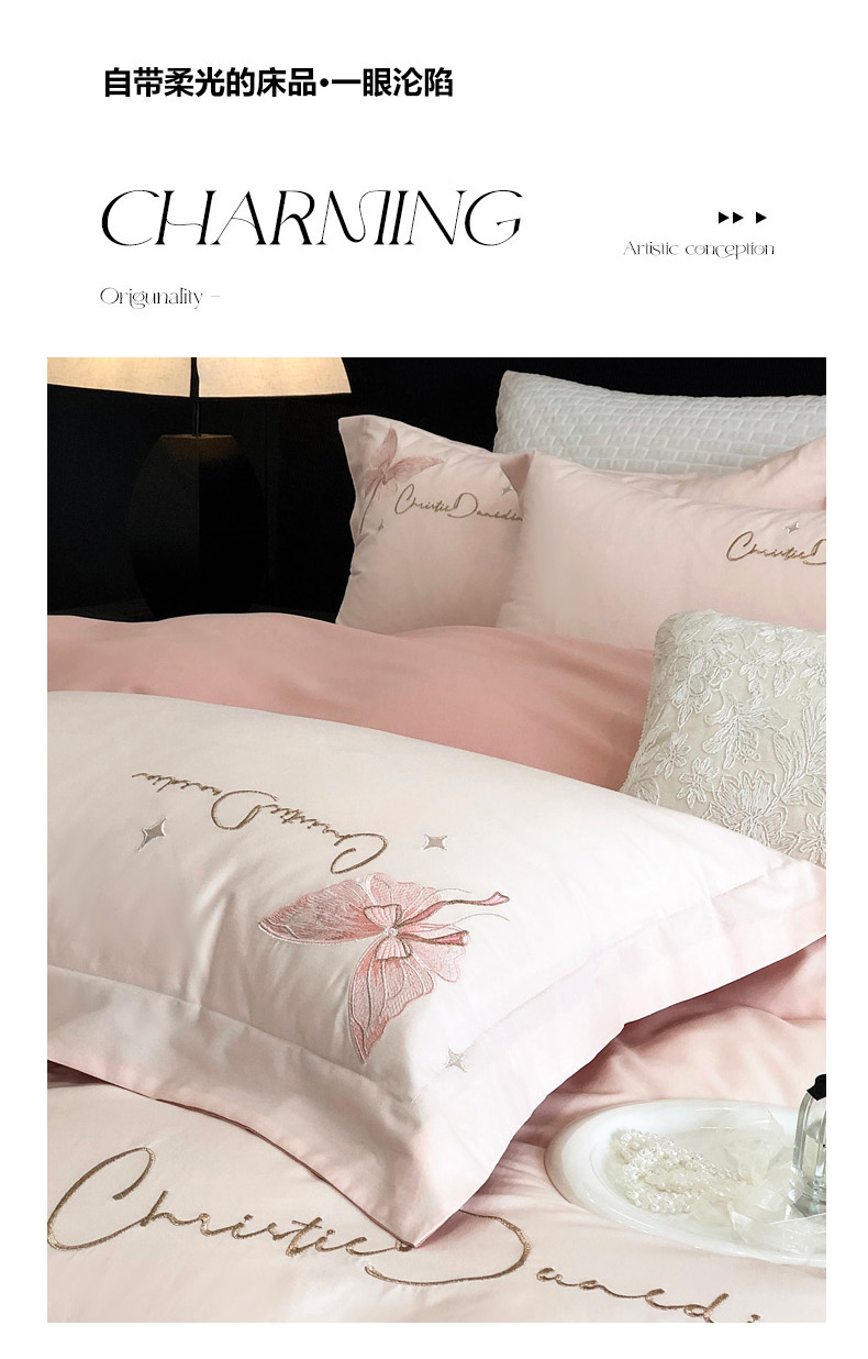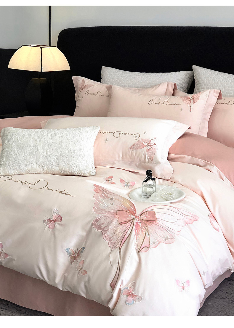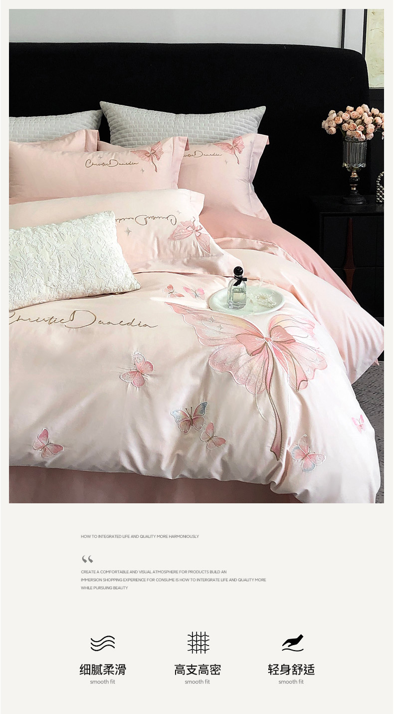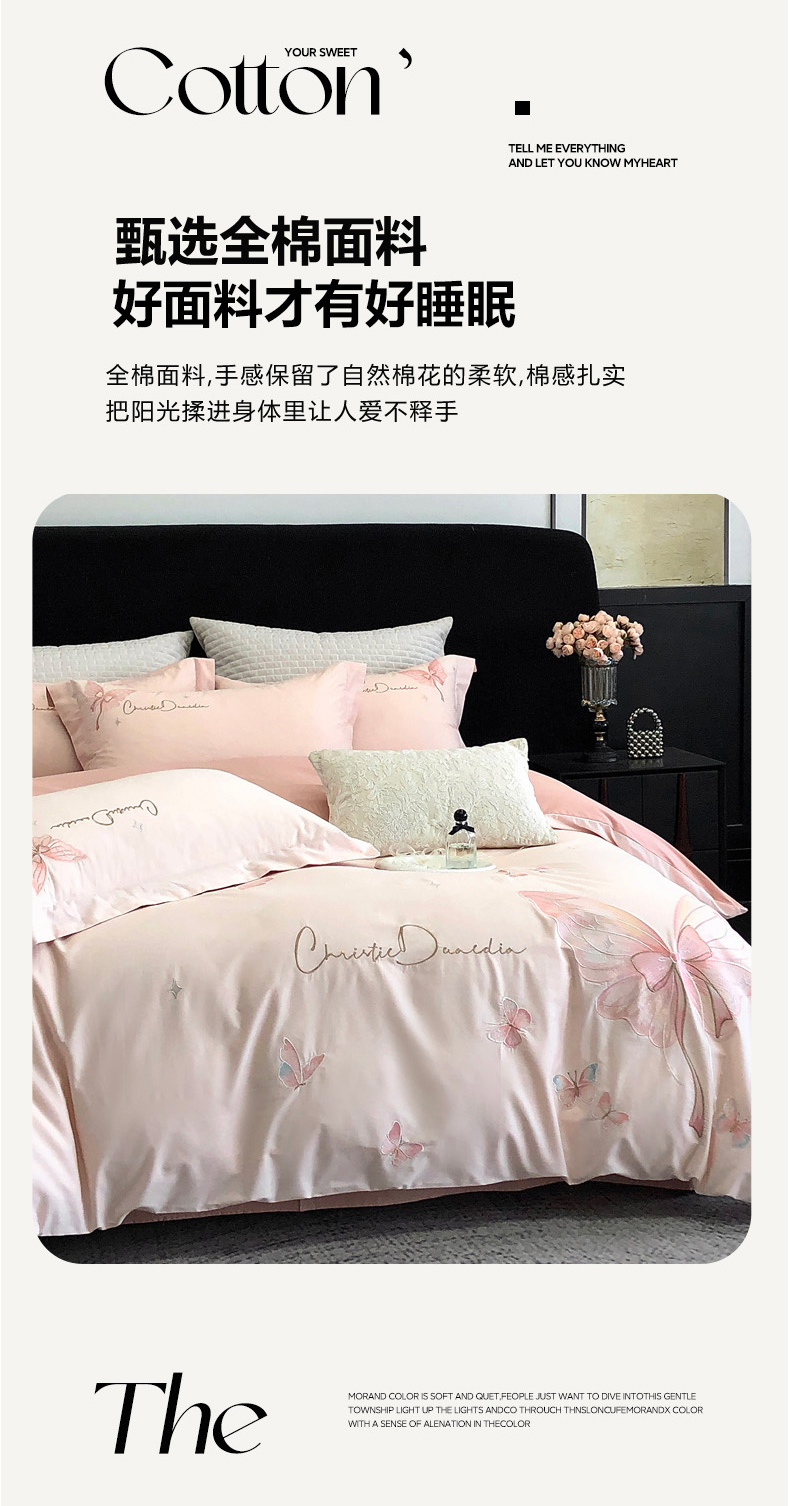 万盛家纺2025新款全棉时尚刺绣花四件套--蝴蝶系列 玫瑰粉-泡沫粉
