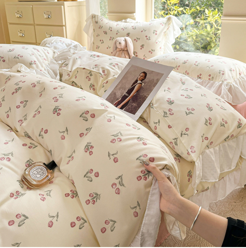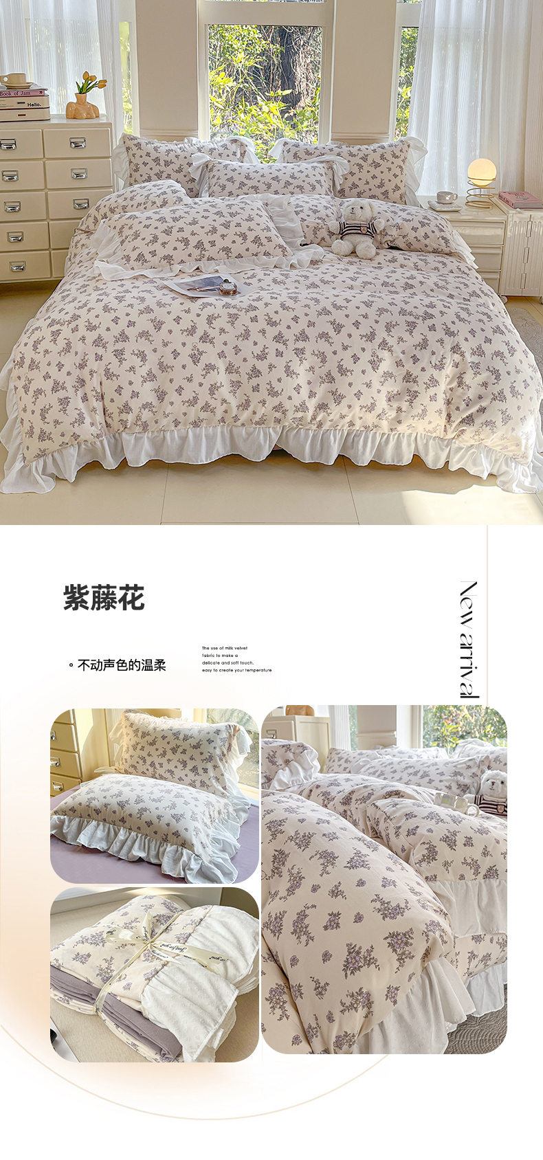 当前位置: 91家纺网 > 商品网购 > 床品套件 > 四件套 > 全棉普通四件套 > 慕希2025新款有氧针织棉双层纱韩版提花大花边公主风印花四件套 紫藤花