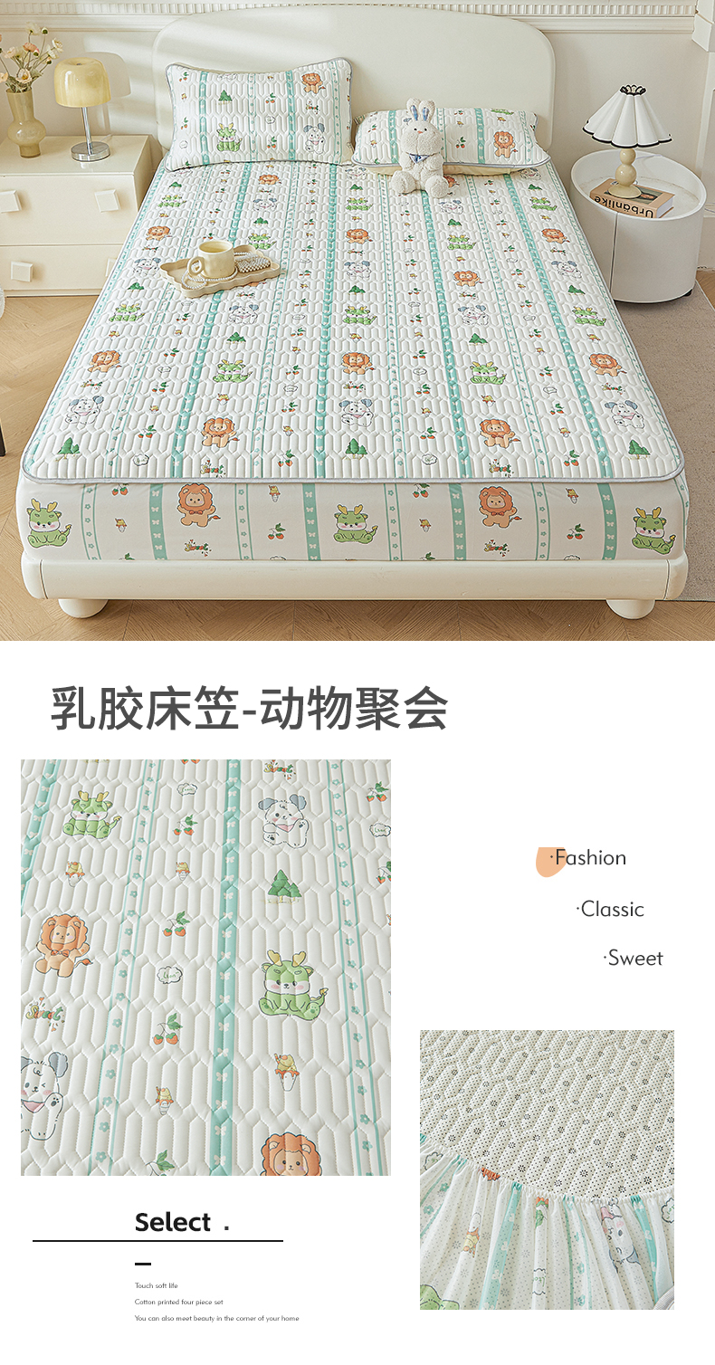 雯豆2025夏季新品0.4乳胶凉席床笠款三件套凉感丝印花纯色床罩 乳胶床笠-动物聚会