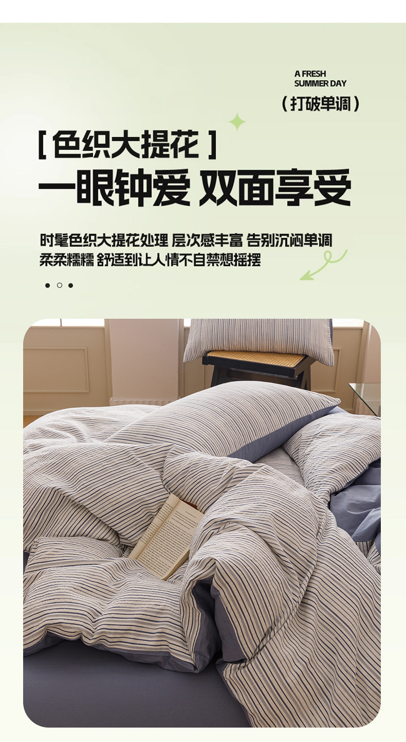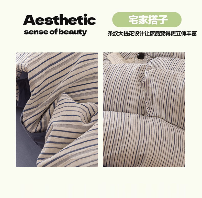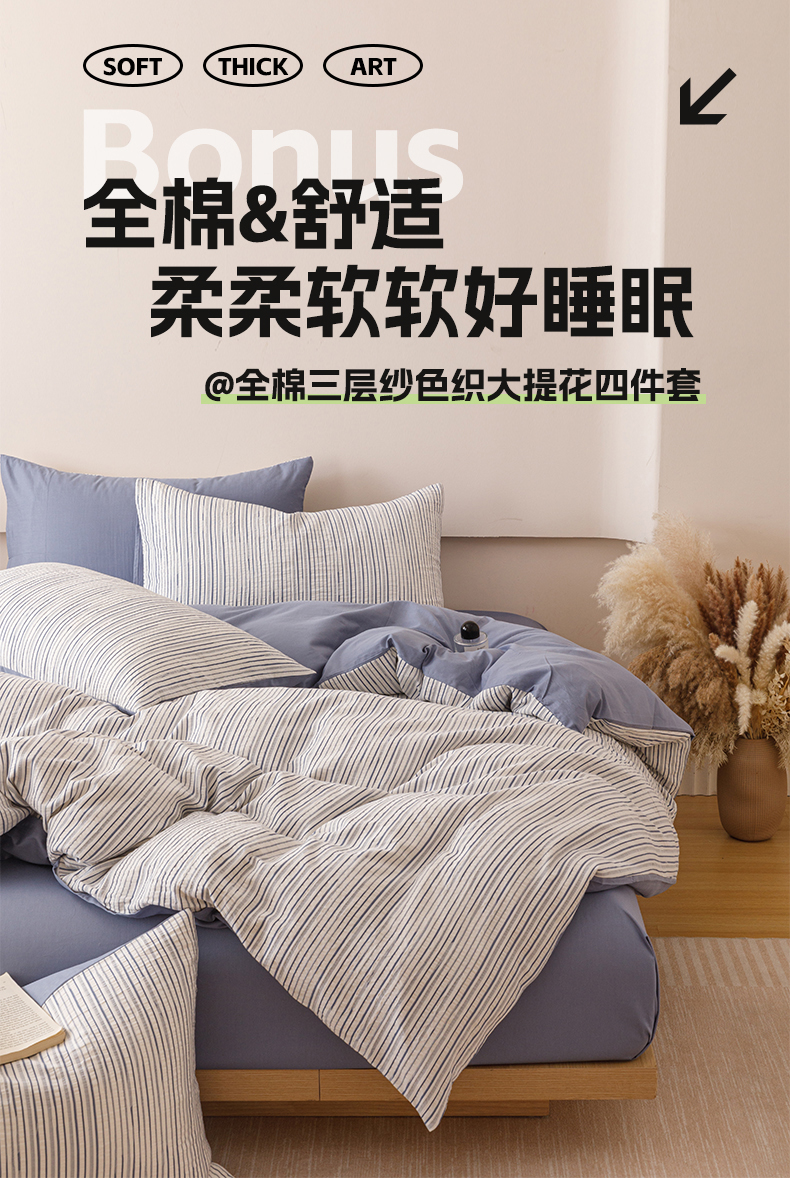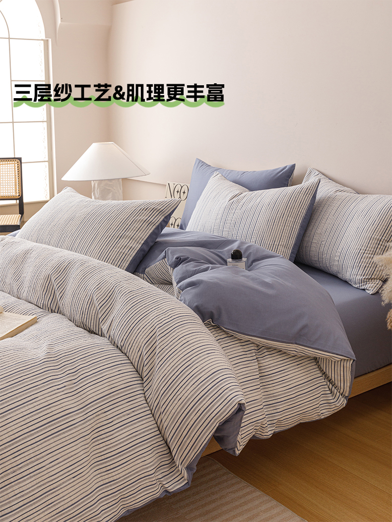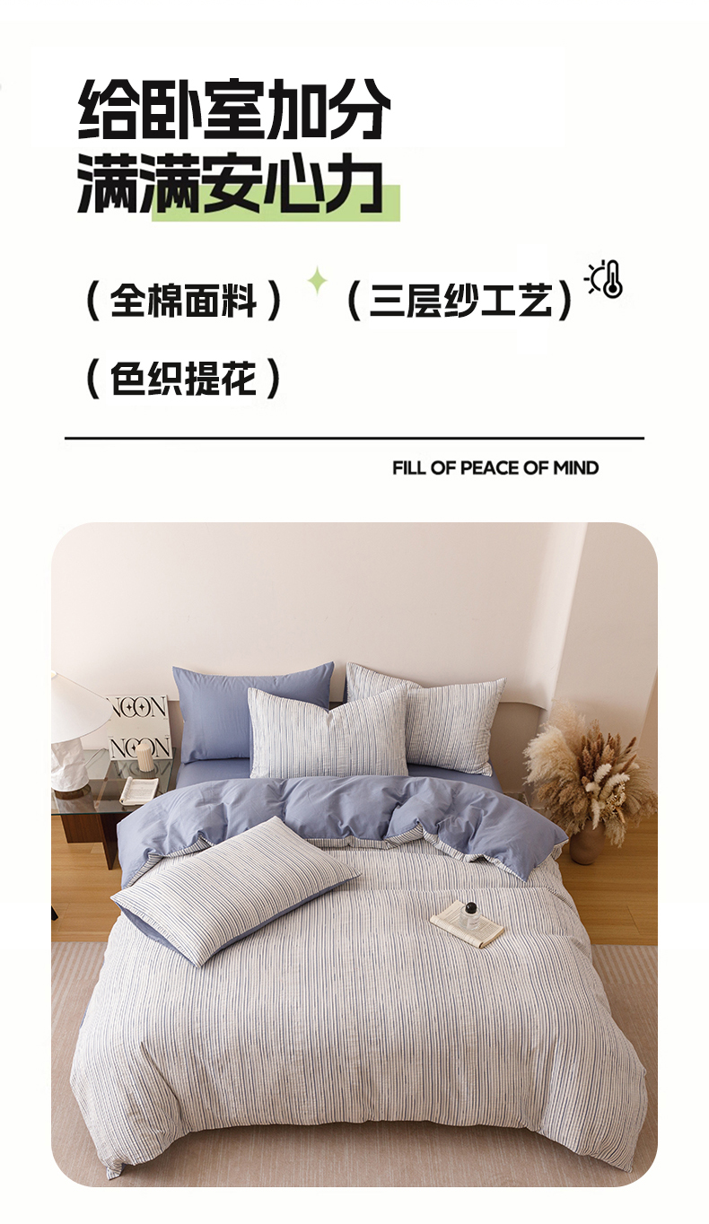 (总)忆生活家纺 2025新款全棉三层纱色织大提花条纹款四件套,初恋-樱花粉,初恋-宝石蓝,初恋-抹茶绿,初恋-奶咖色,初恋-太空灰