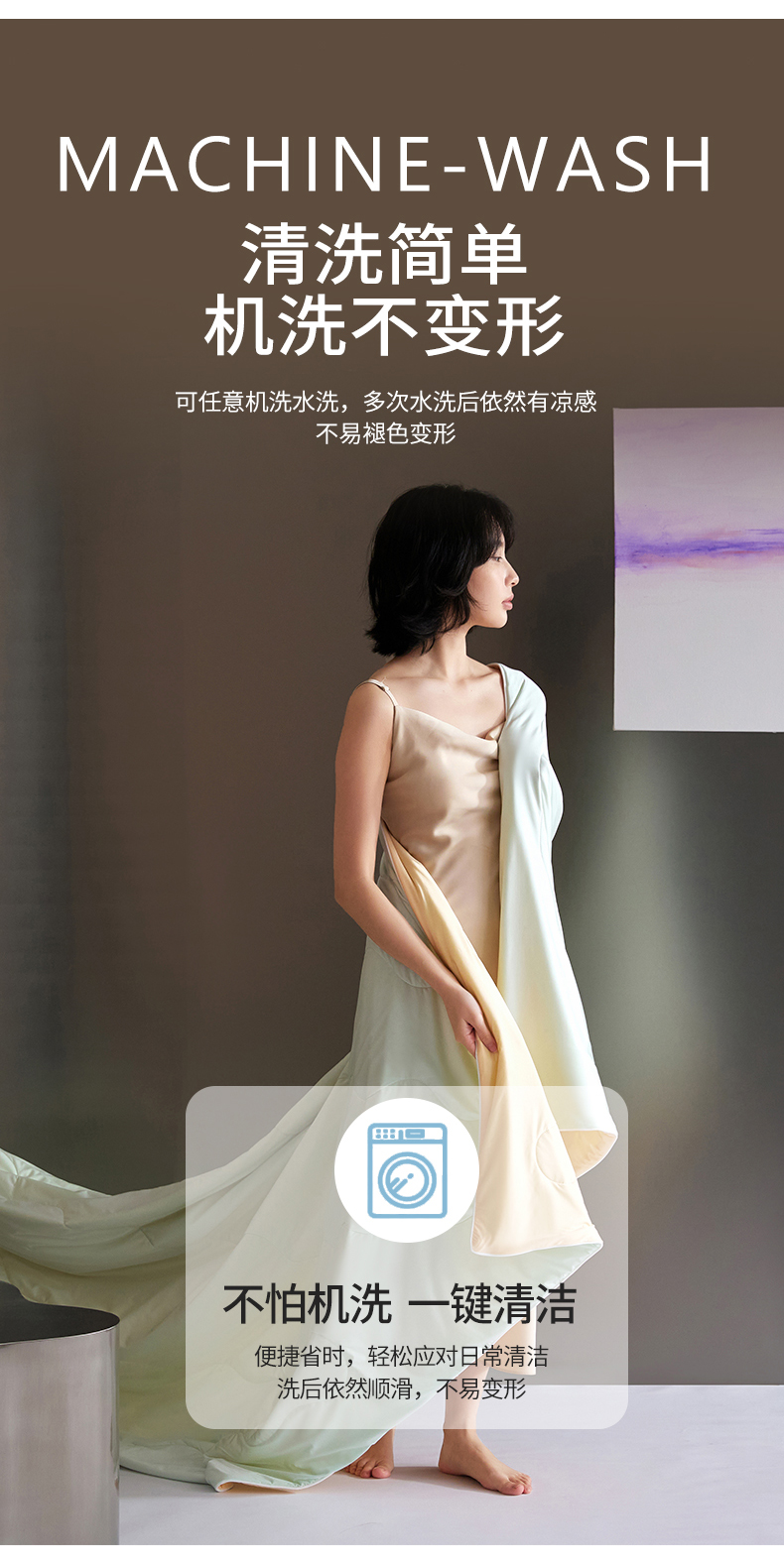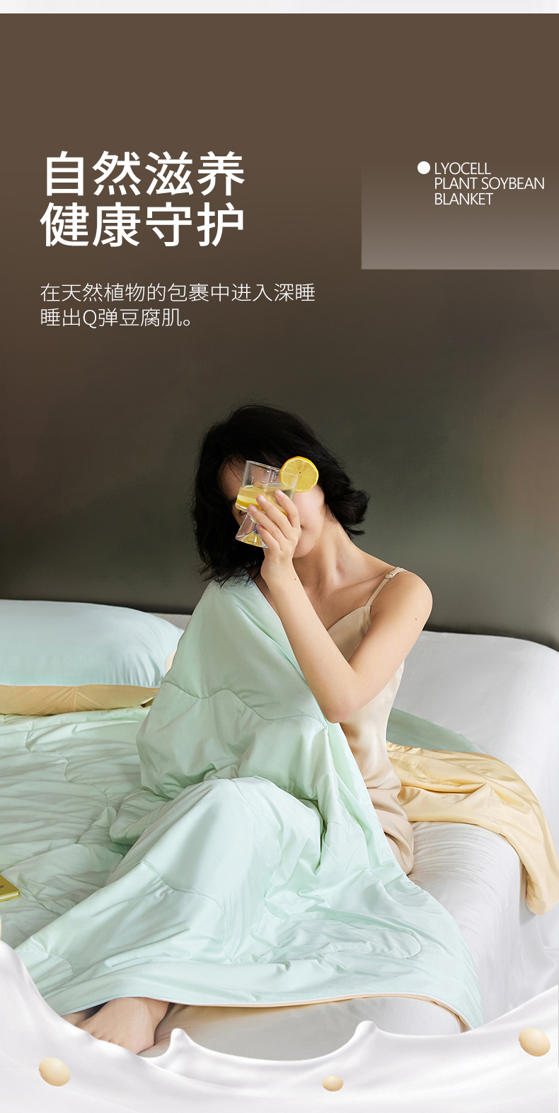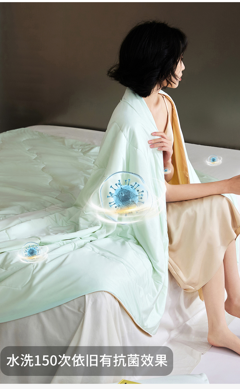 商品名称:头等舱 2025新款锦氨(165克)水光亮面锦A类55莱赛尔植物大豆7A抗菌夏凉被夏被(模特图) 天青色+暖黄