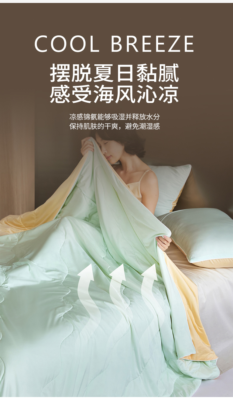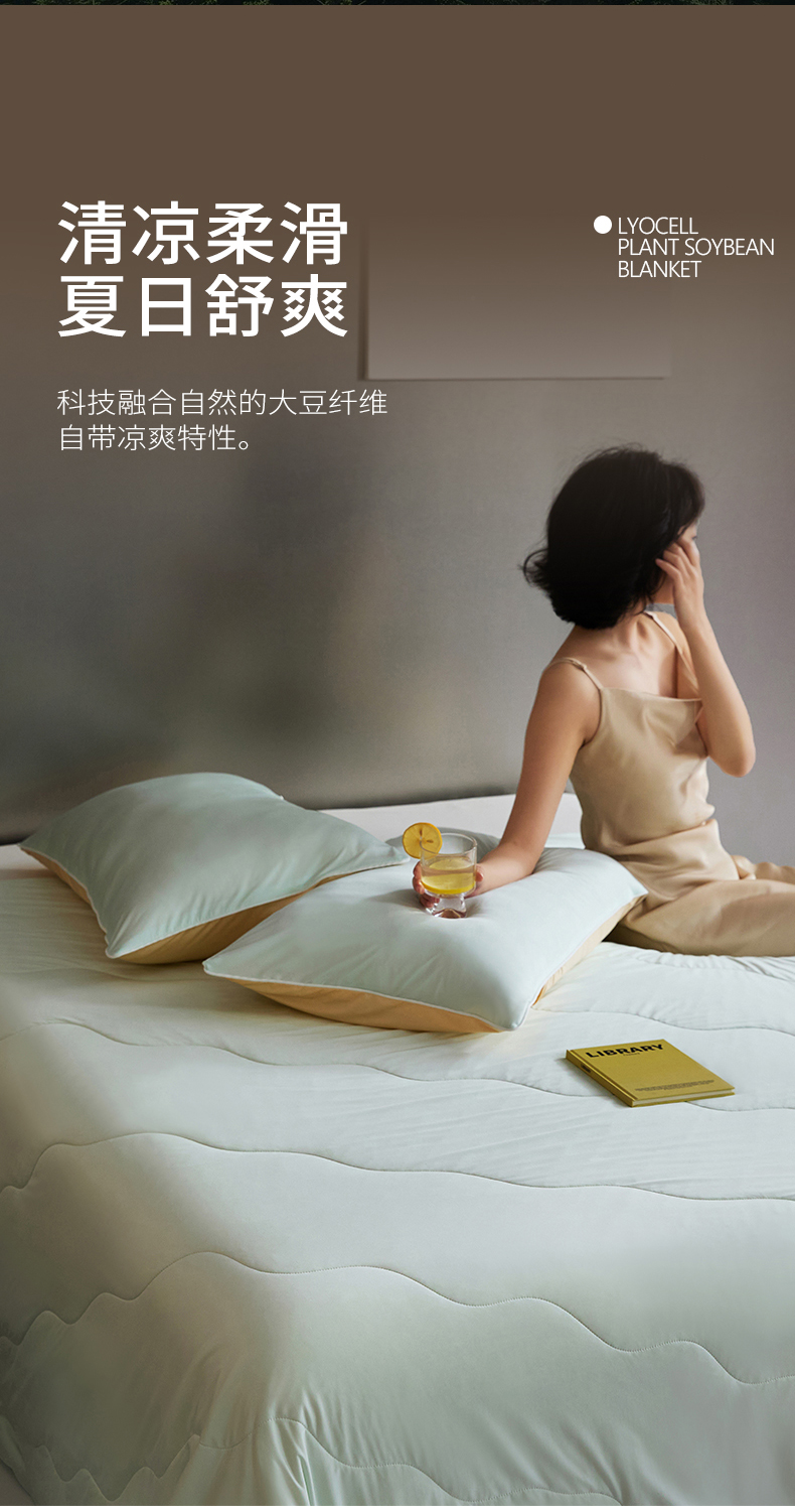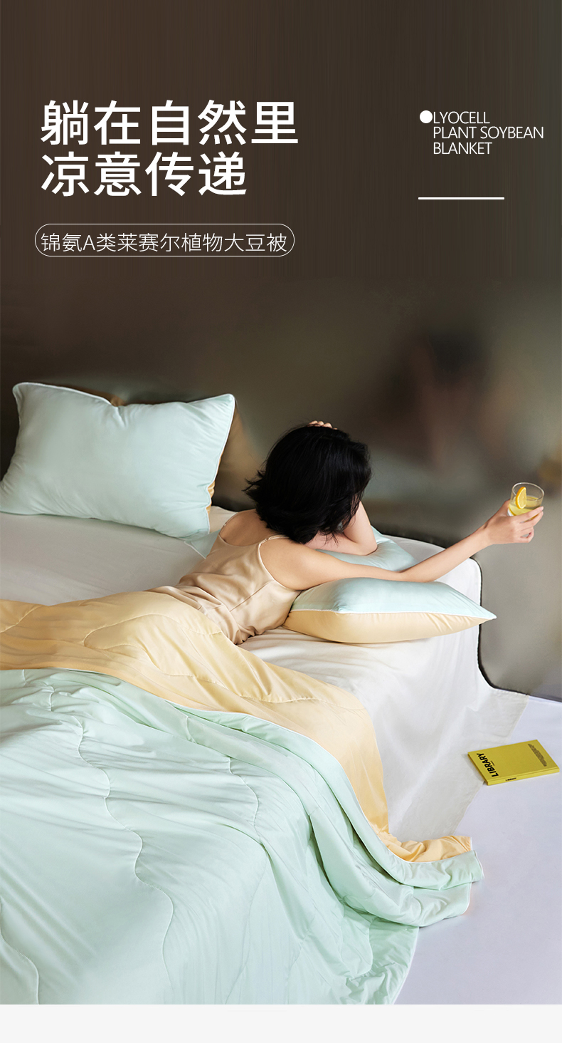被子 > 夏被 > 头等舱 2025新款锦氨(165克)水光亮面锦A类55莱赛尔植物大豆7A抗菌夏凉被夏被(模特图) 天青色+暖黄