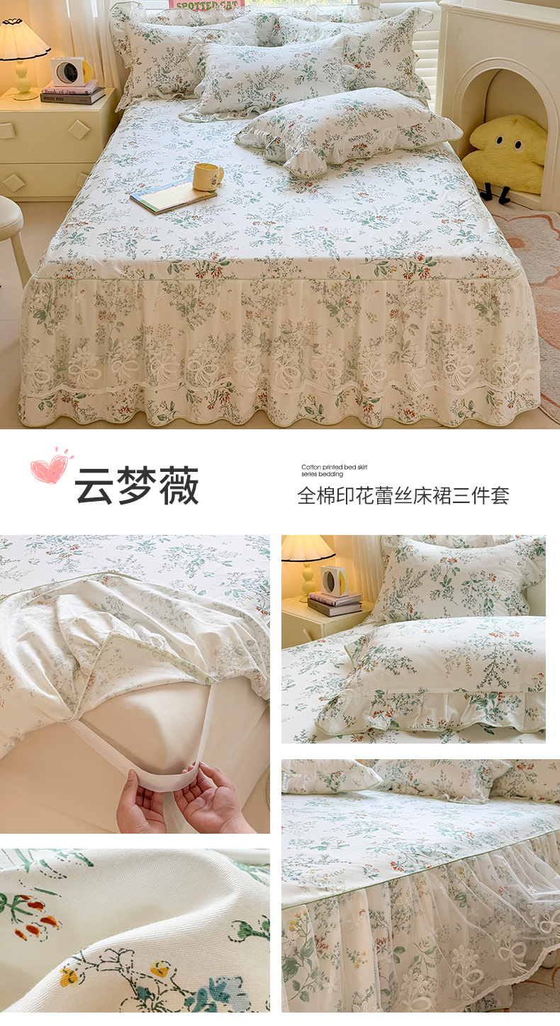 当前位置: 91家纺网 > 商品网购 > 床品套件 > 四件套 > 全棉普通四件套 > 宜凡家纺 2025新款全棉蕾丝花边床裙三件套 云梦薇