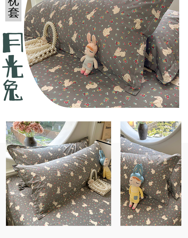 商品名称:百寐 2025新款13372全棉纯棉印花双人枕套+同款床单 月光兔