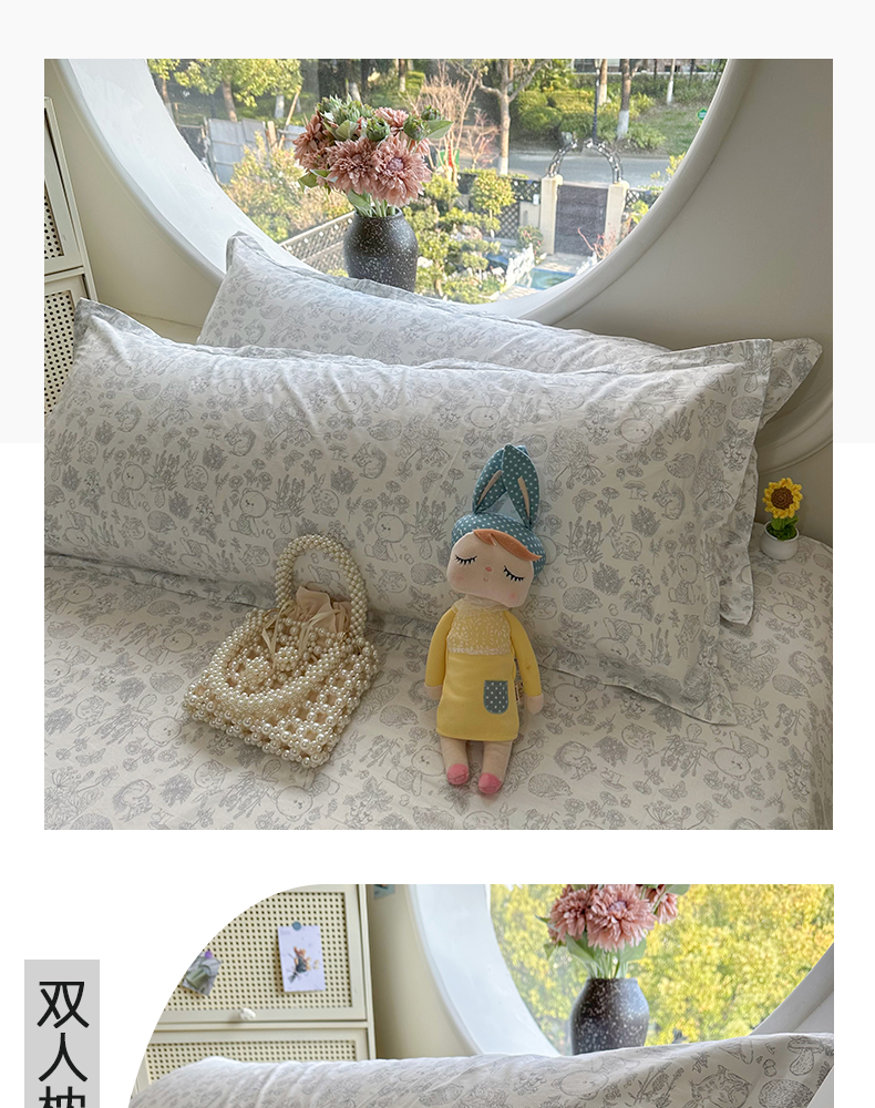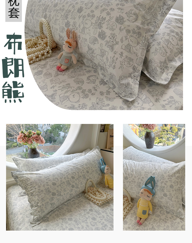 百寐 2025新款13372全棉纯棉印花双人枕套+同款床单 月光兔