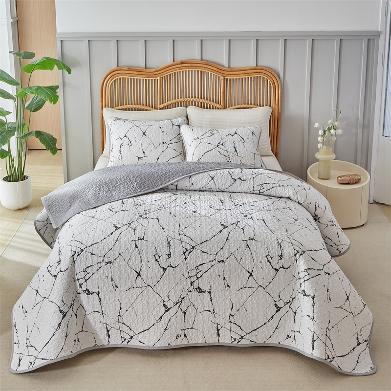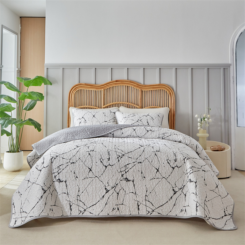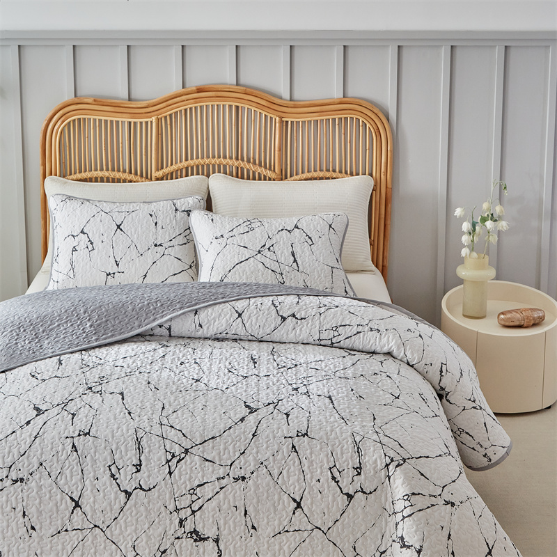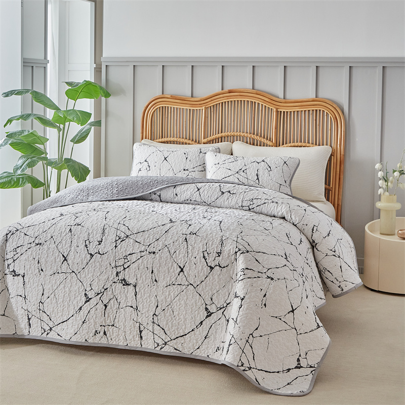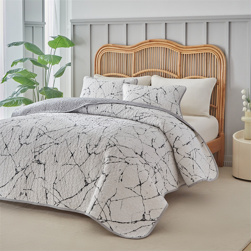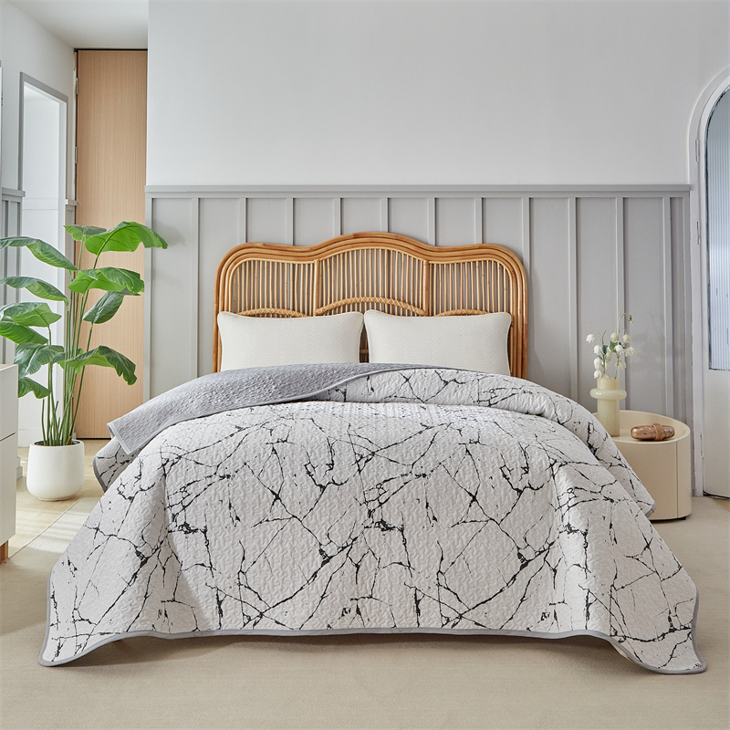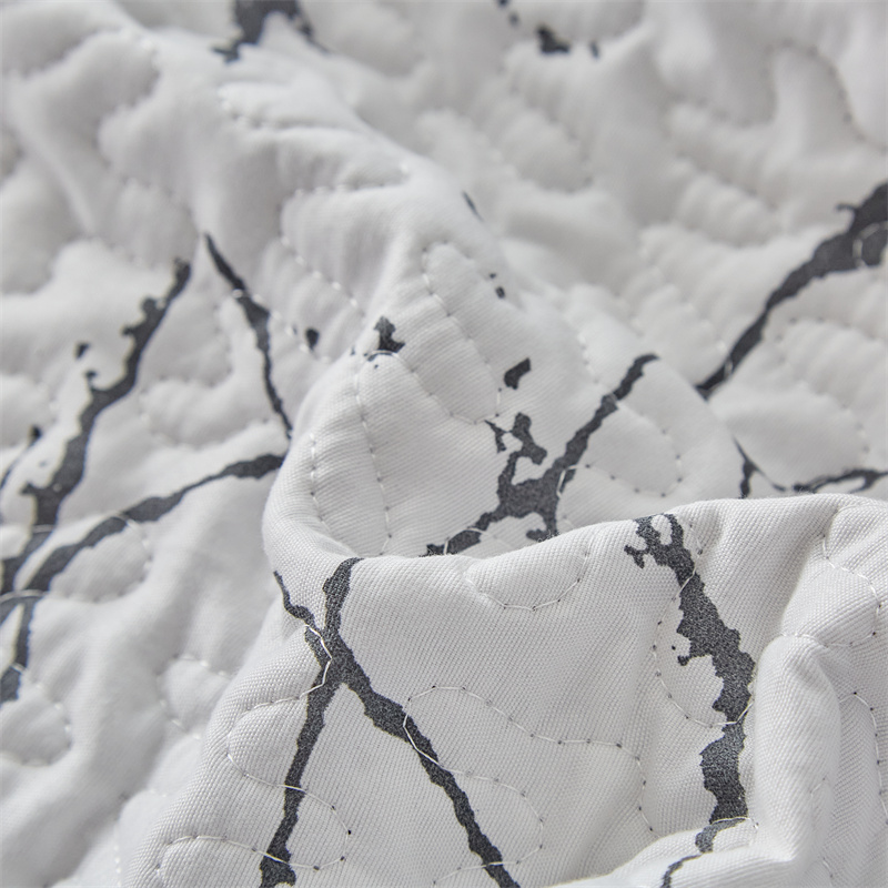 温宁家纺 2025新款跨境双面化纤水洗棉传统印花夹棉四季床盖 抽象黑白