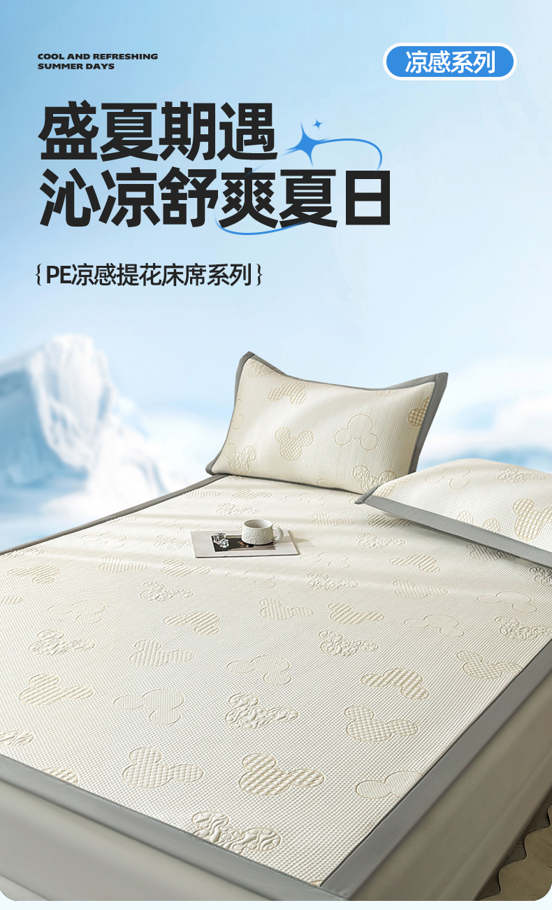 雯豆家纺 2025新款PE高分子凉感提花凉席三件套绑带款席子平铺席 米奇宝-绑带款