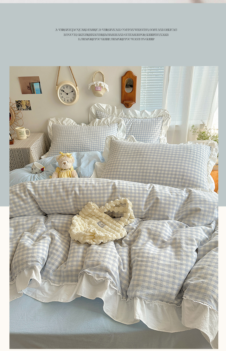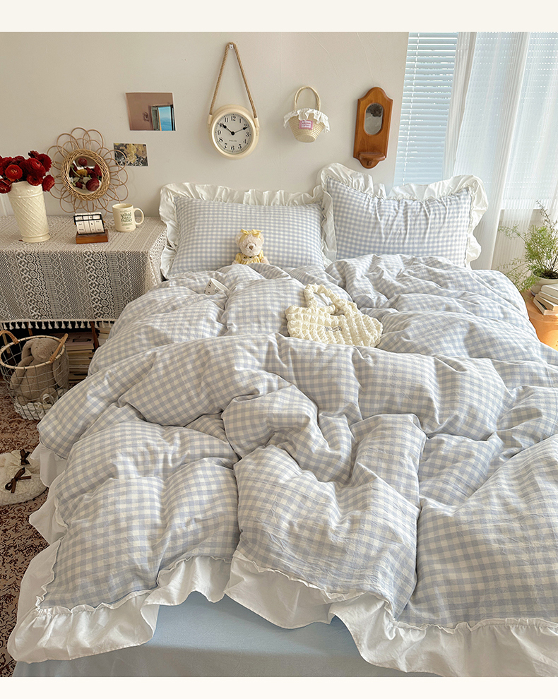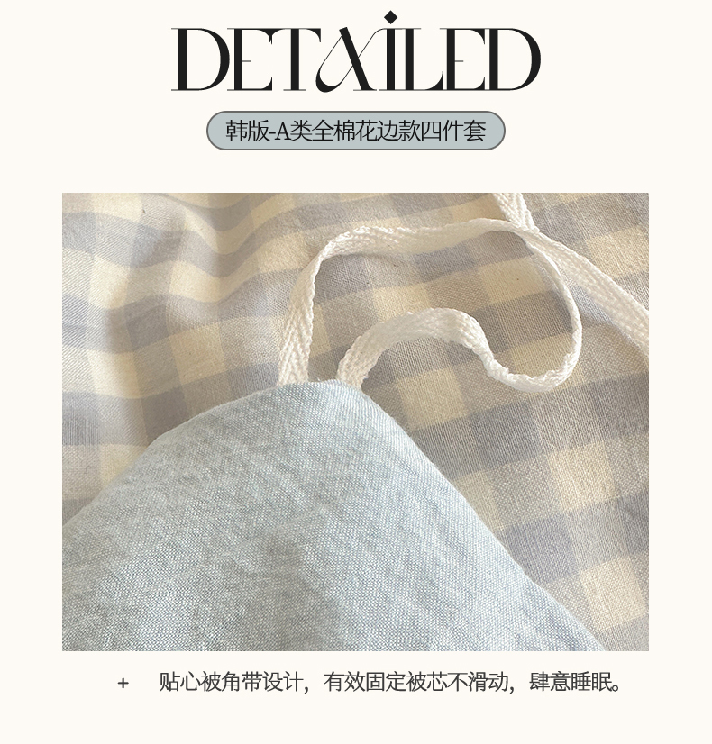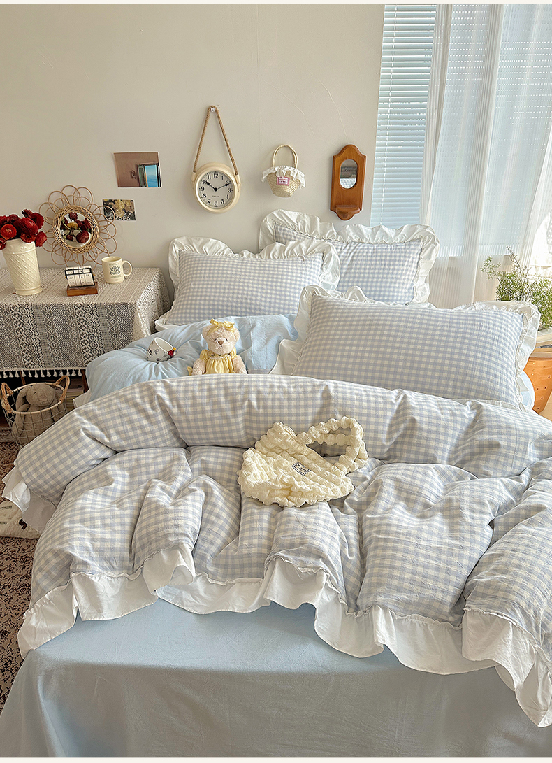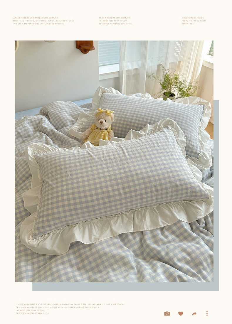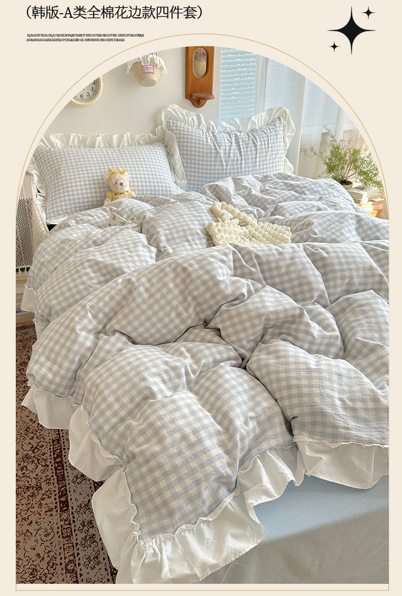 (总)有间小屋 2025新款A类ins韩系全棉水洗棉花边款四件套,花边黑小格,花边粉小格,花边红小格,花边黄小格,花边兰小格