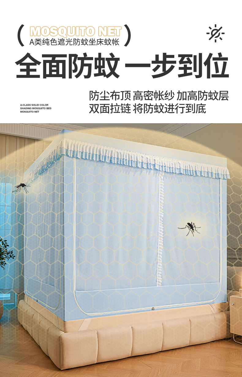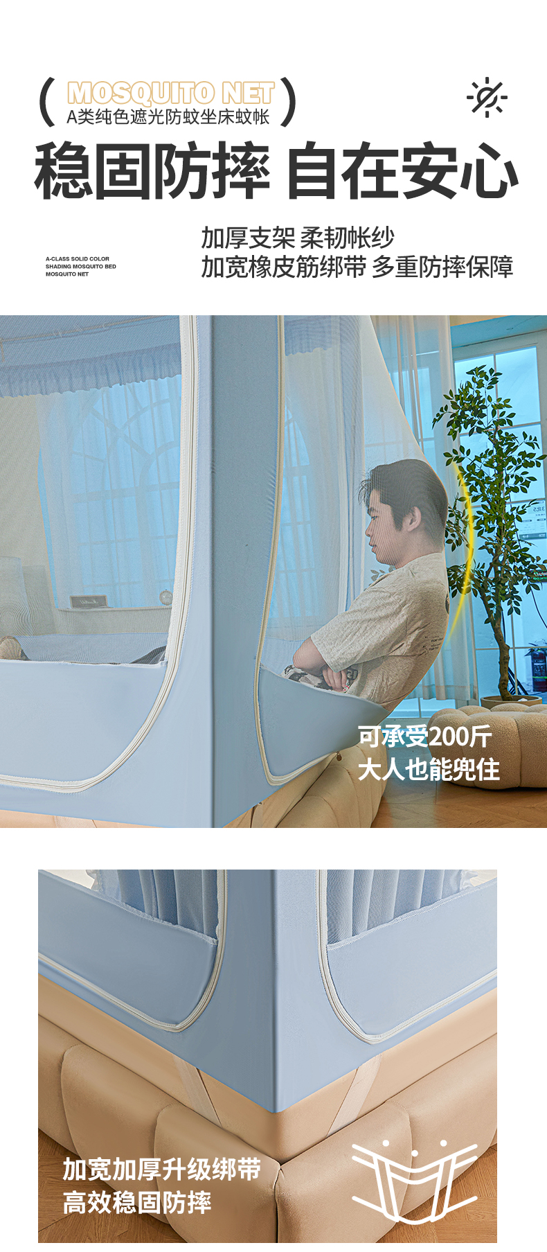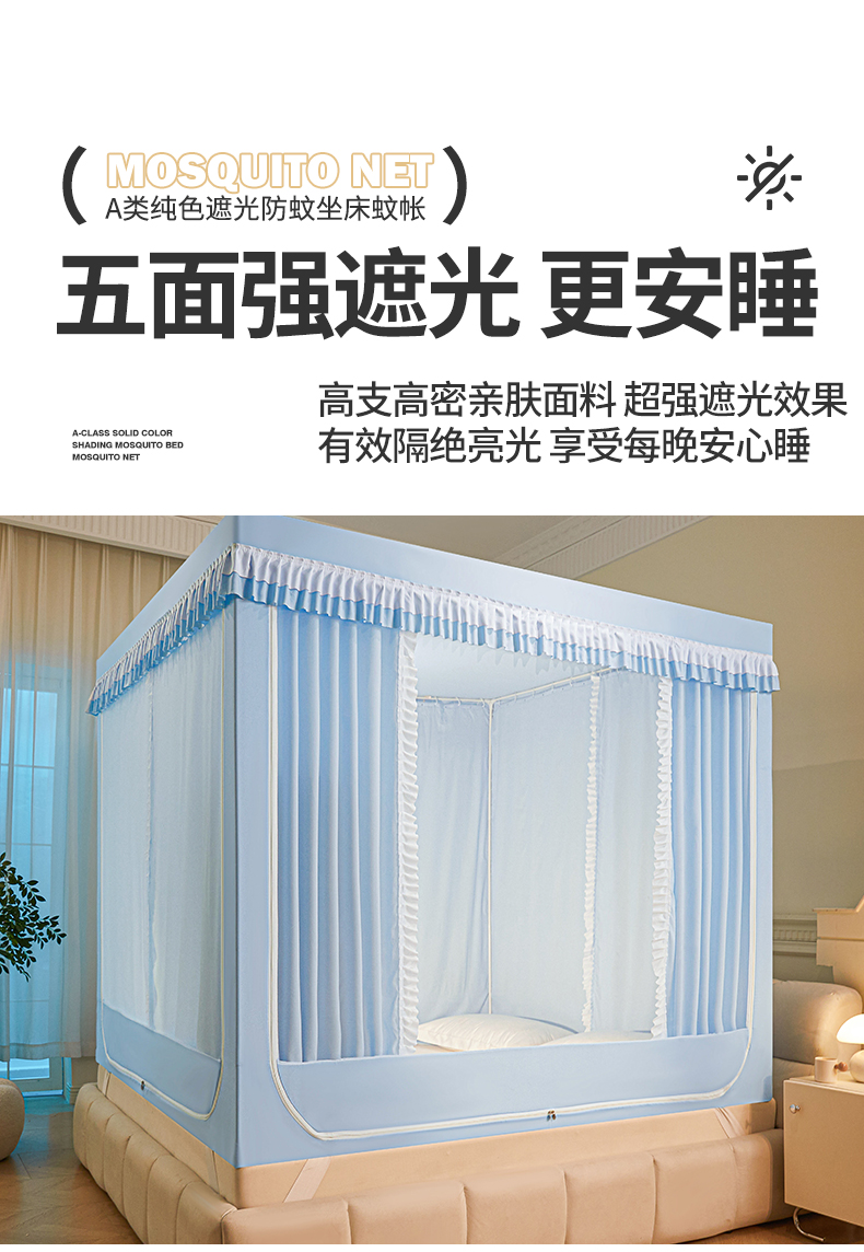 当前位置: 91家纺网 > 商品网购 > 床上用品 > 蚊帐 > 坐床式蚊帐 > 浪幔纱蚊帐 2025新款A类遮光防摔蚊帐坐床拉链全底回底纯色加厚支架 舒雅蓝【全底带帘款】