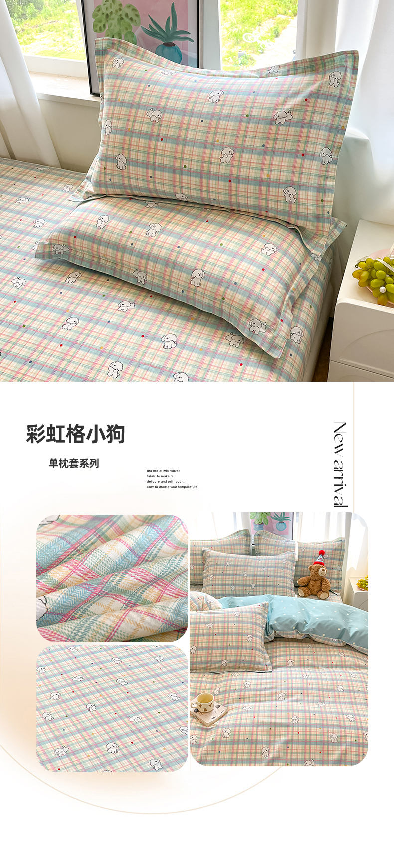 商品名称:2025新款全棉印花小清新单品系列-单枕套彩虹格小狗