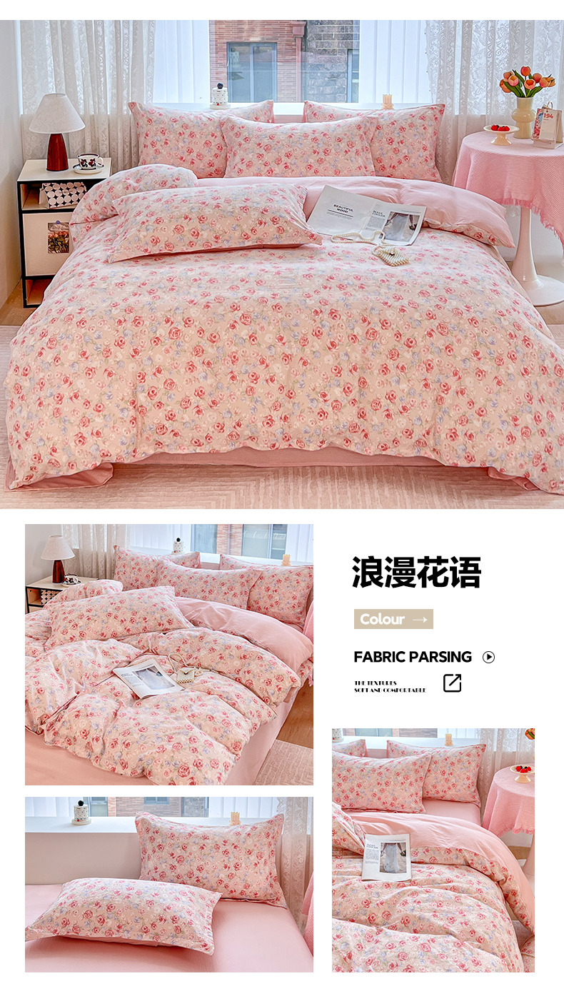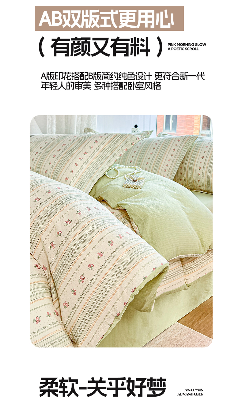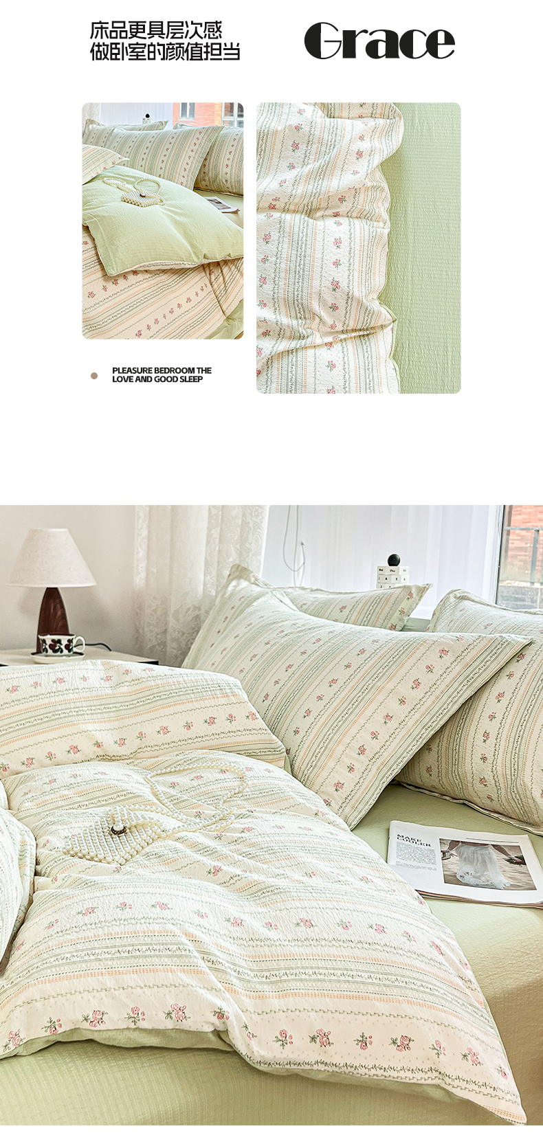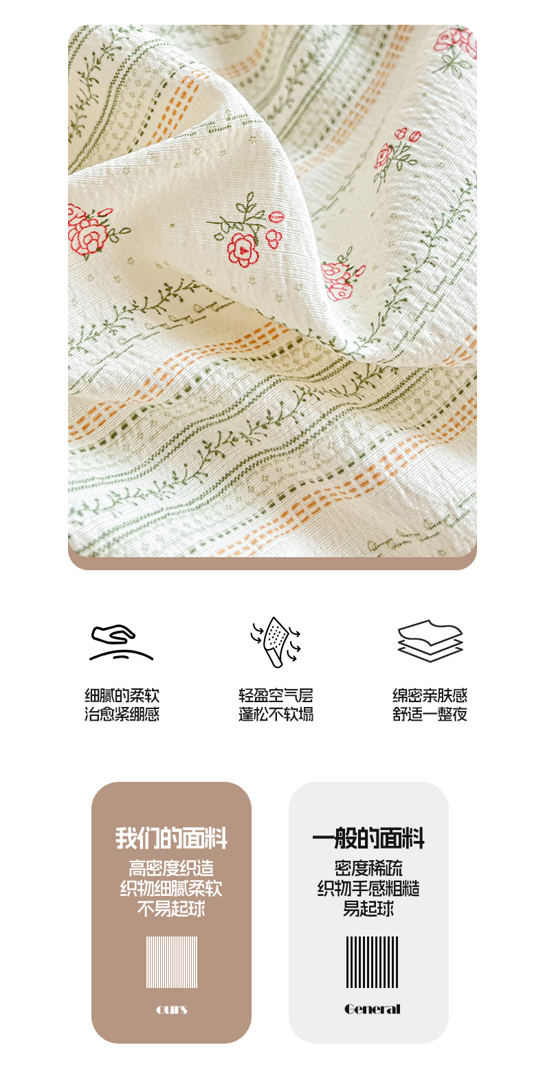 商品名称:麦田家纺 2025新款A类云感木棉皱皱双层纱印花四件套 花颜