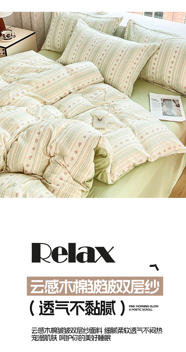 麦田家纺 2025新款A类云感木棉皱皱双层纱印花四件套 花颜