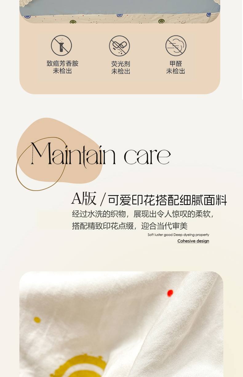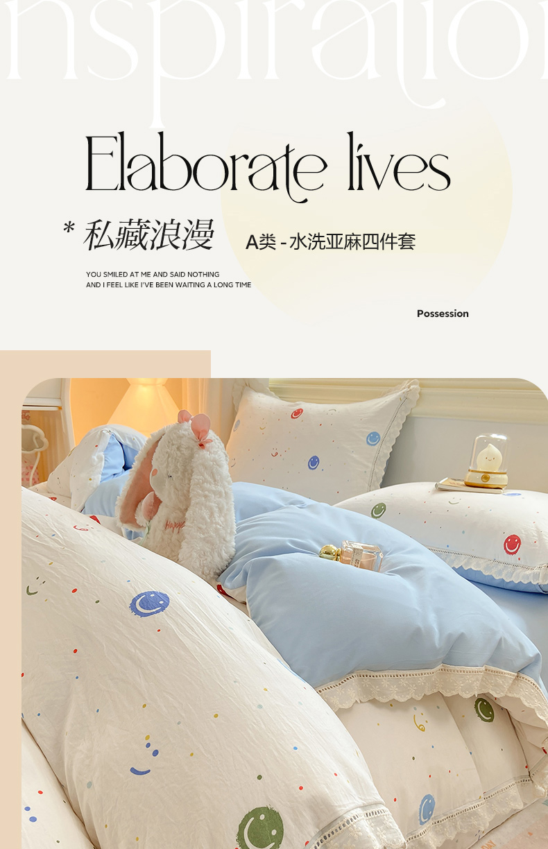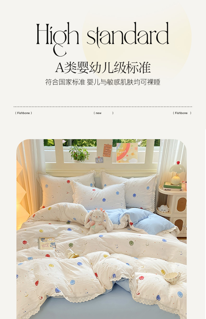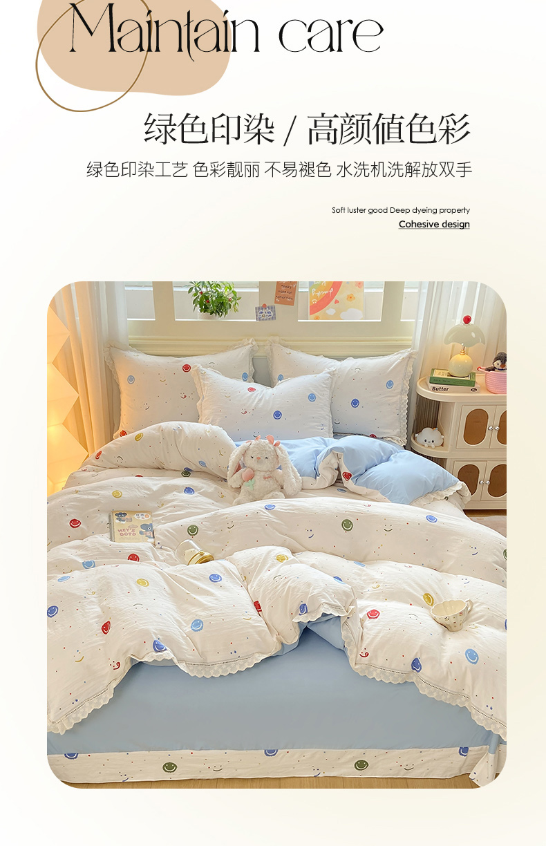 大麦家纺 25年新款高克重印花水洗棉花边四件套 开心笑脸