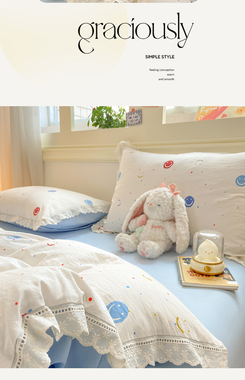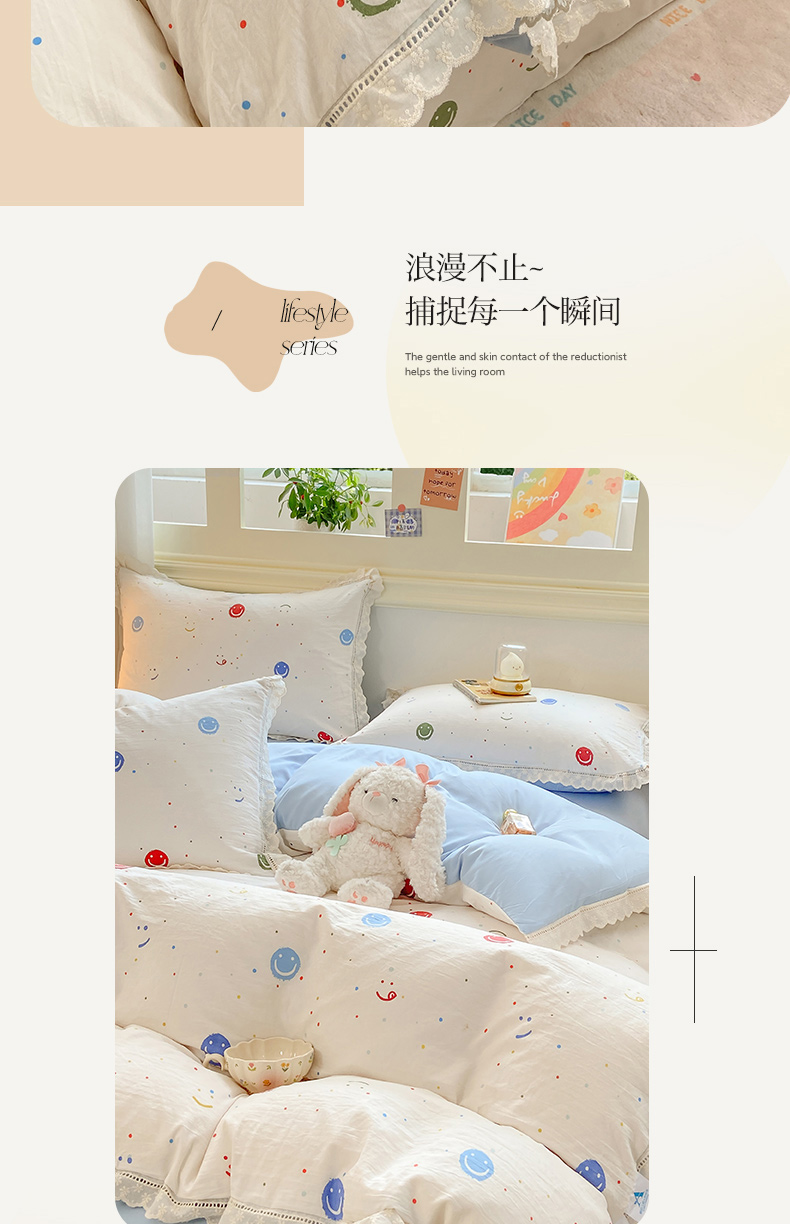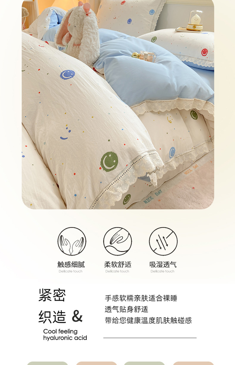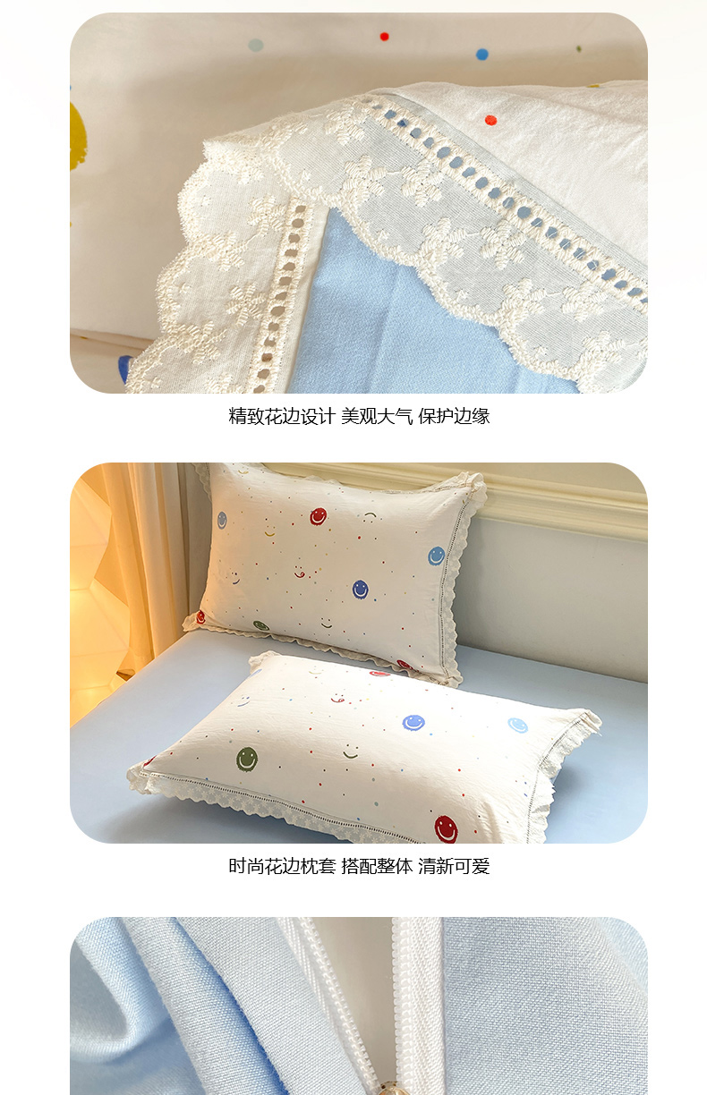 商品名称:大麦家纺 25年新款高克重印花水洗棉花边四件套 开心笑脸