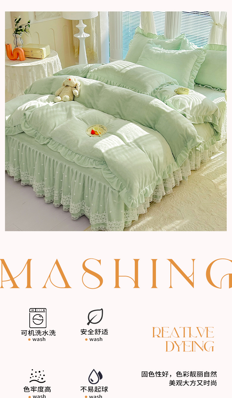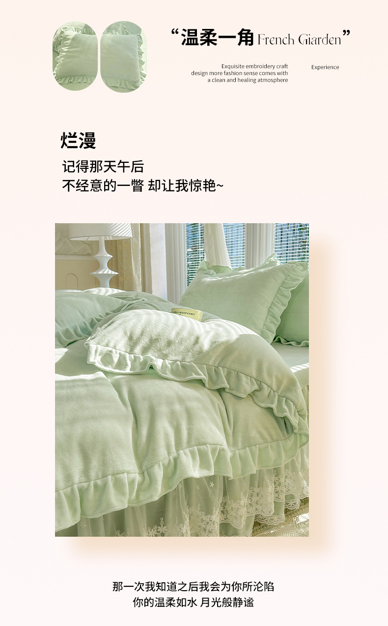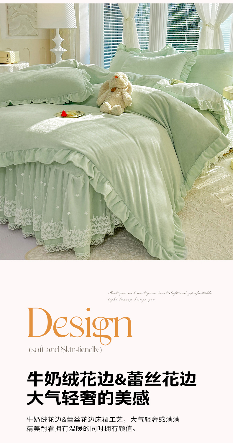 商品名称:唐人居 2025新款加厚牛奶绒蕾丝花边床裙款四件套--爱丽丝系列 爱丽丝-豆绿