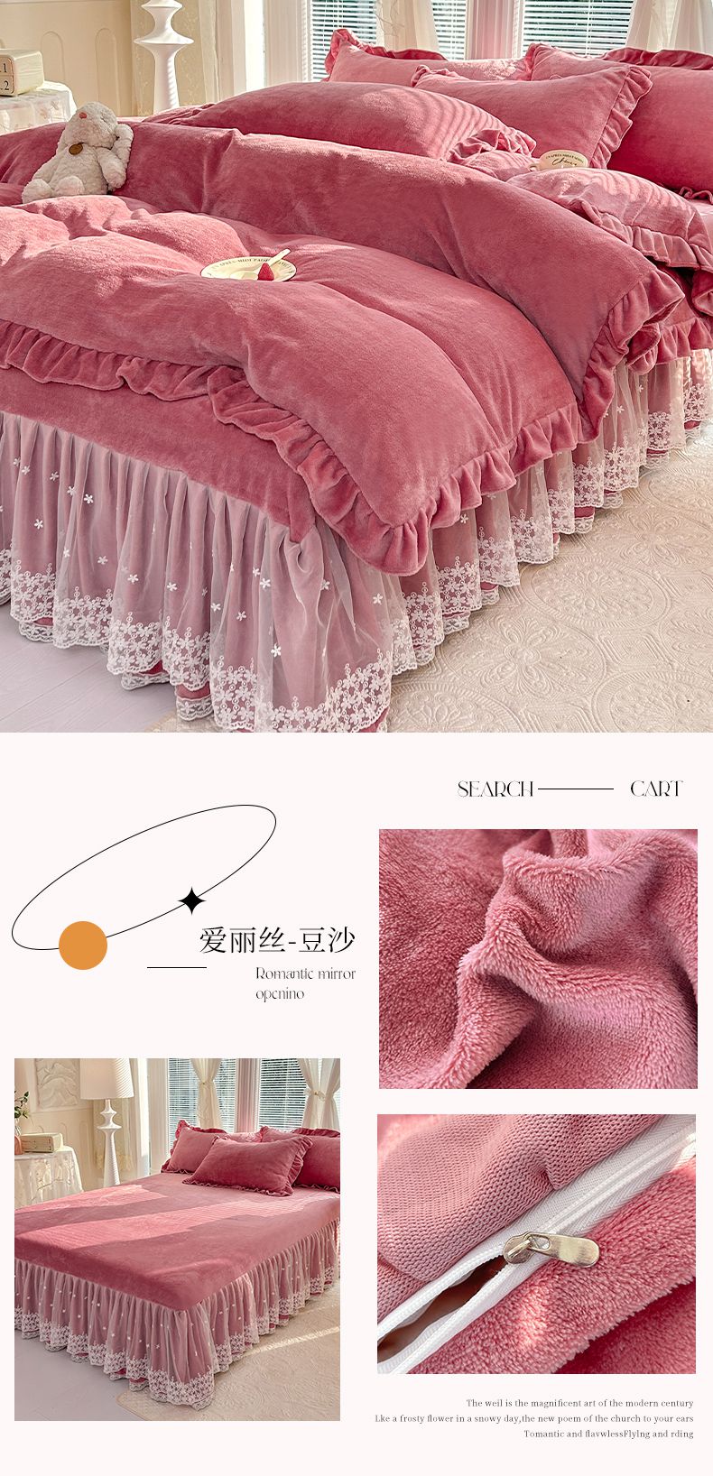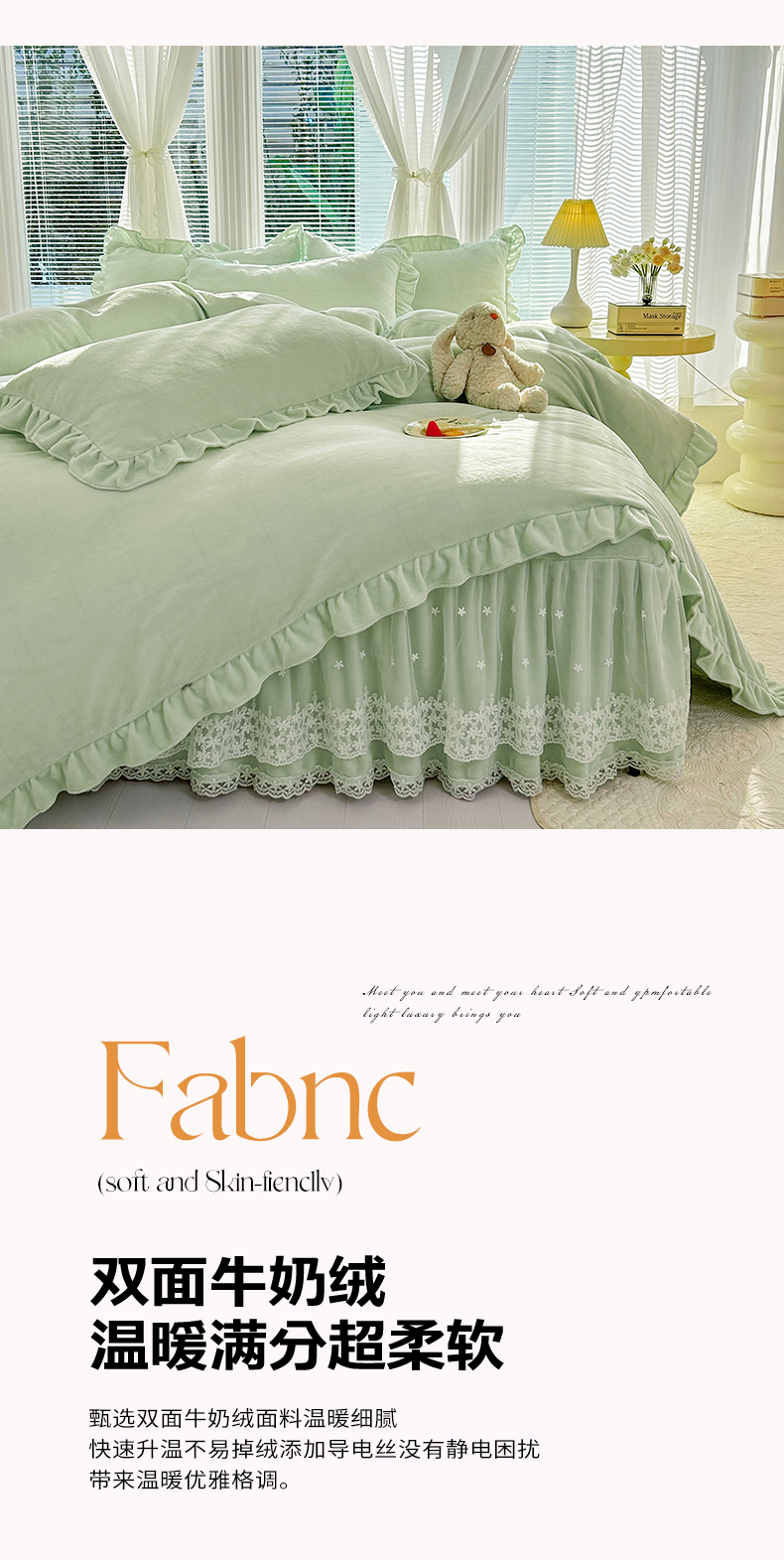 唐人居 2025新款加厚牛奶绒蕾丝花边床裙款四件套--爱丽丝系列 爱丽丝-豆绿