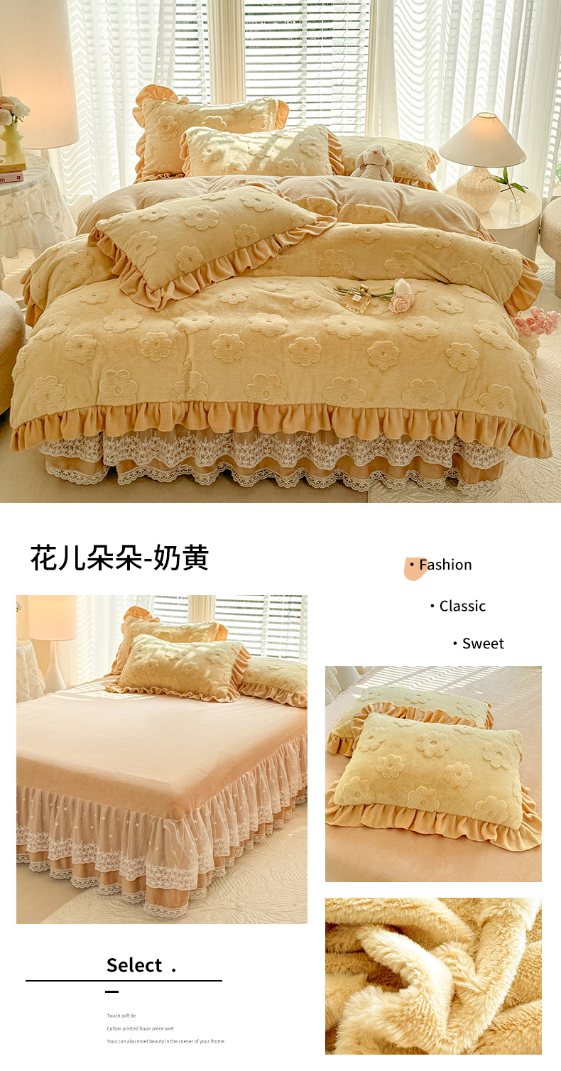 商品名称:唐人居 2025新款雕花花边兔毛绒床裙四件套 花儿朵朵-浅绿