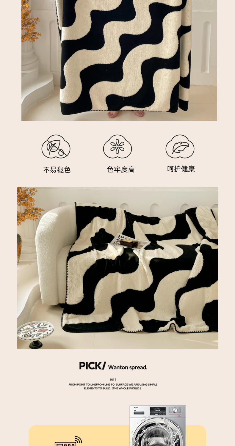 (总)晚爱家纺(原晚安家居) 2025新款跨境多功能盖毯沙发毯双面印花舒棉绒毛毯,波浪纹,黑蝴蝶,蝴蝶树,节节高,山茶花,四叶草,小布布,小熊猫