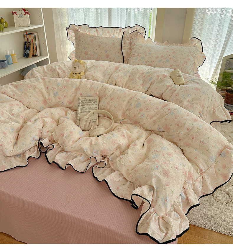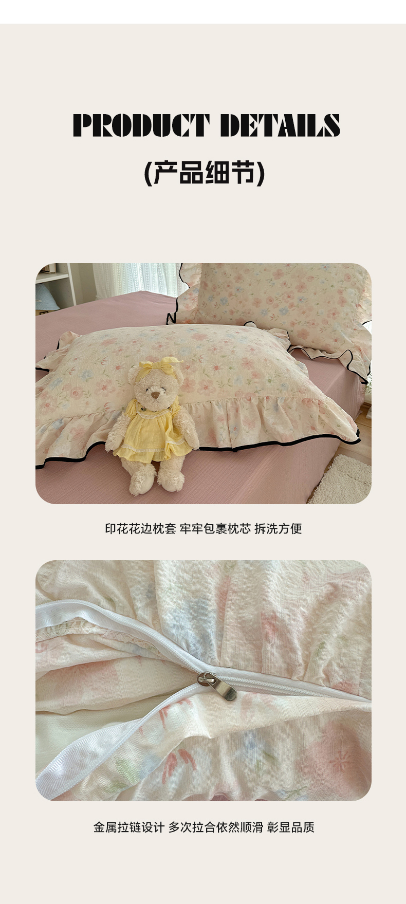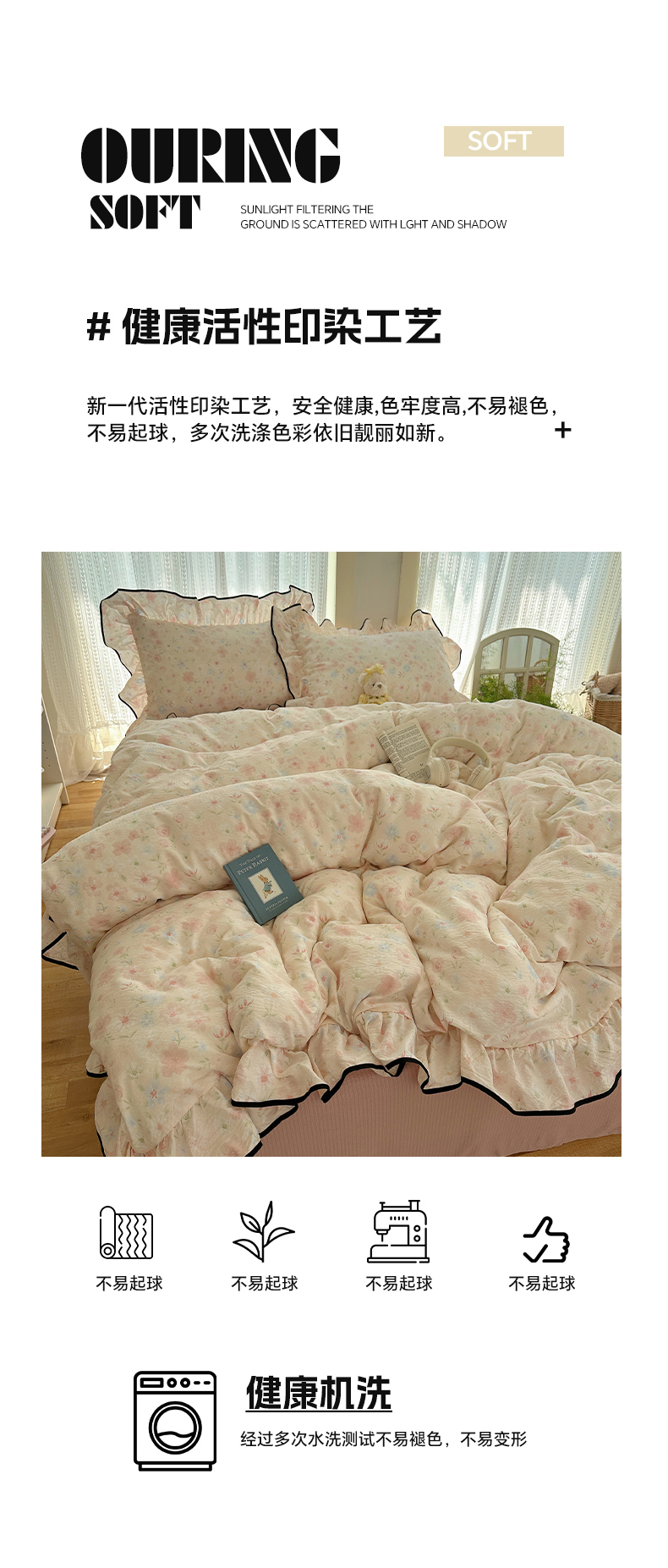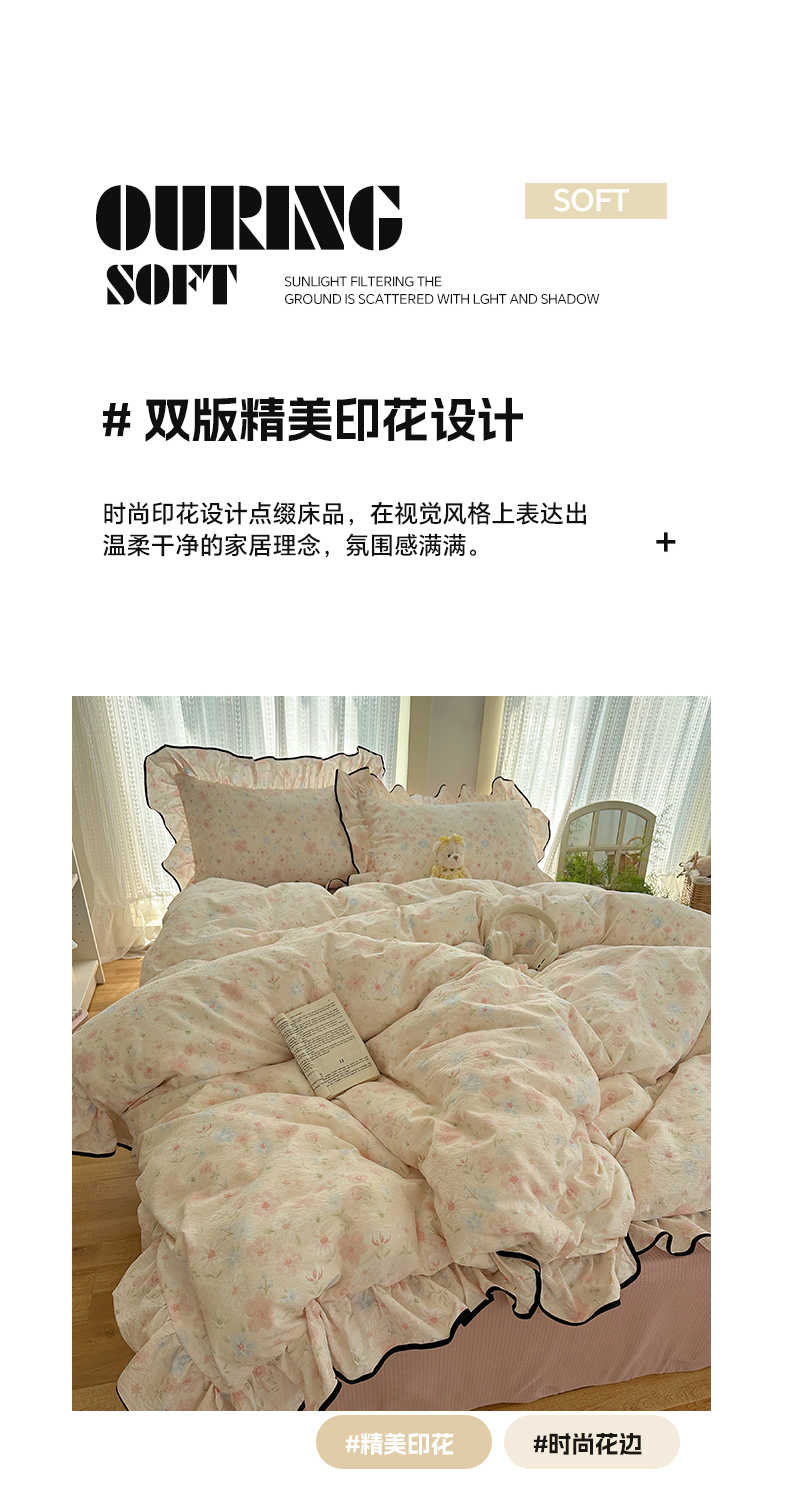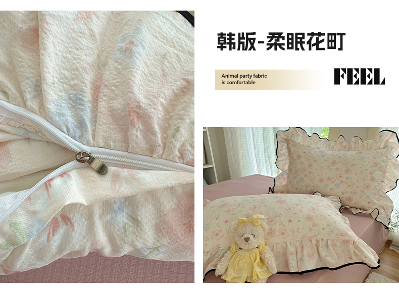 商品名称:红嘴企鹅 2025新款韩版双拼花边四件套 韩版-柔眠花町