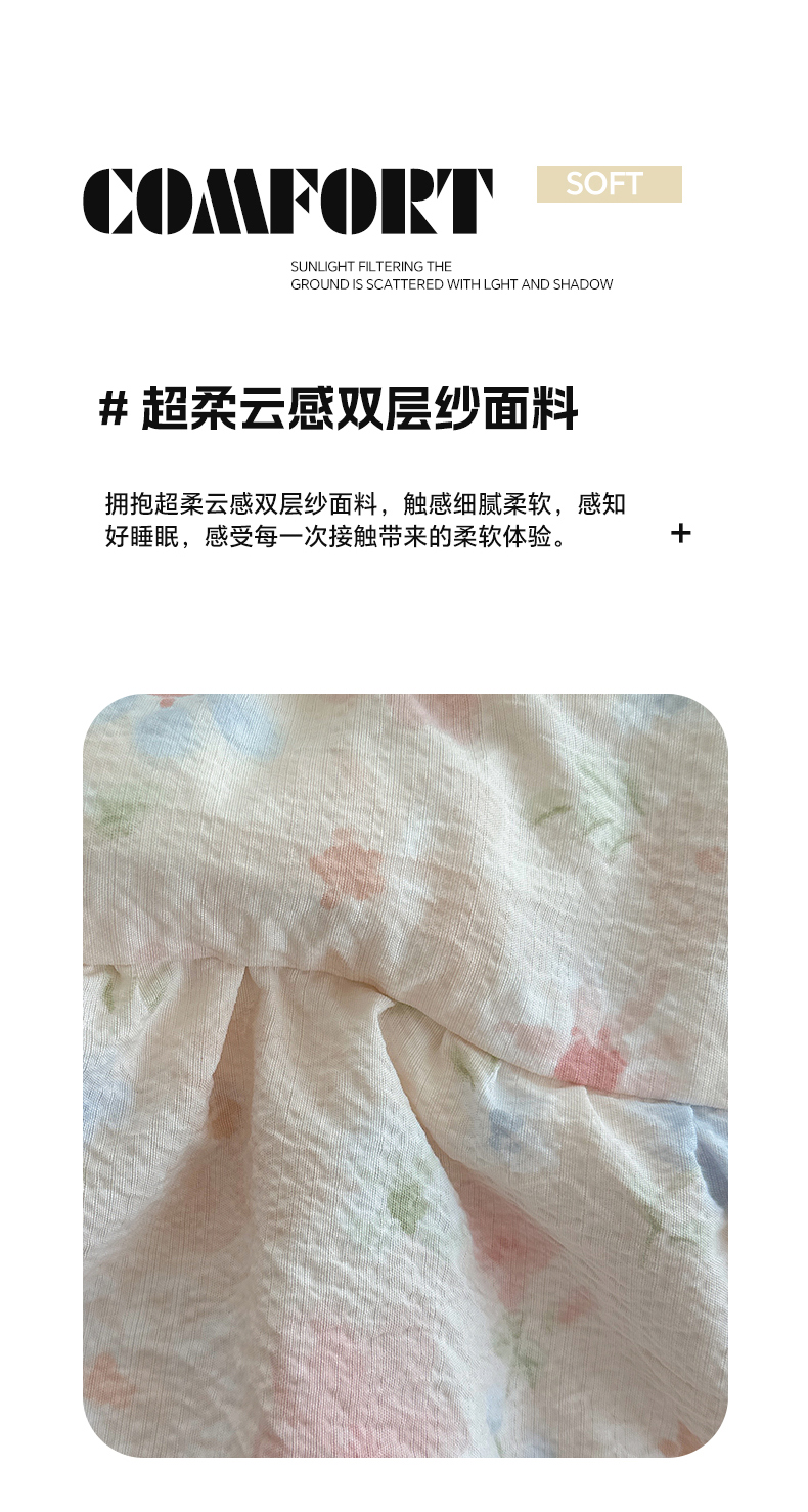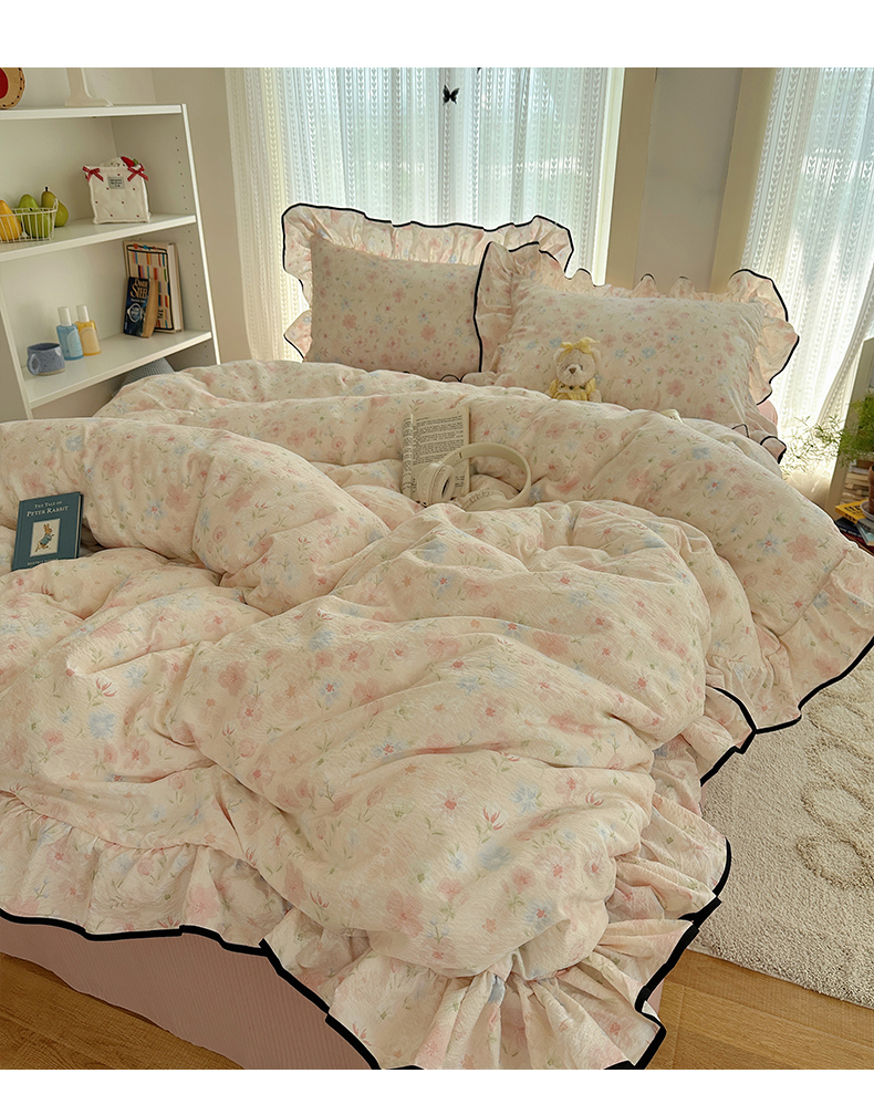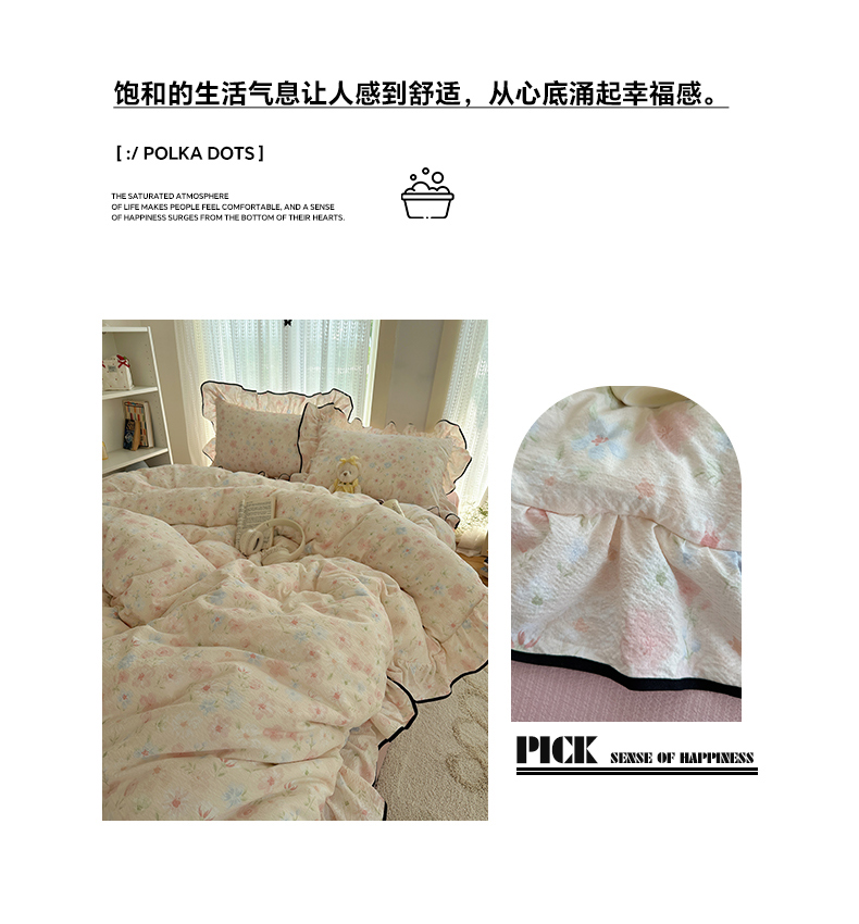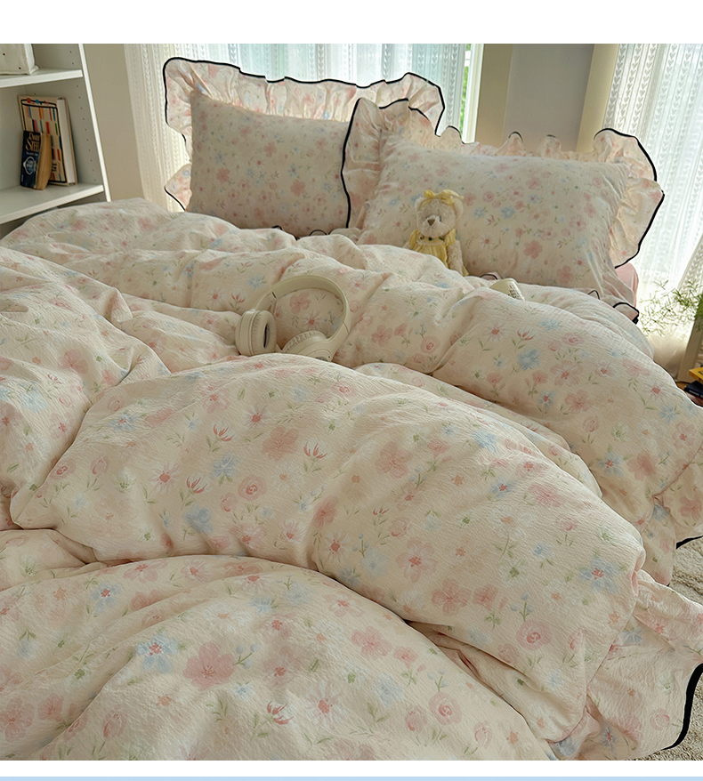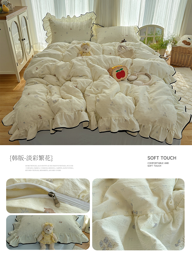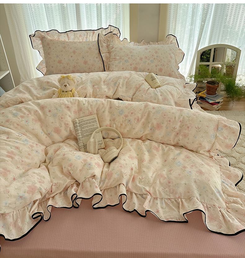 商品名称:红嘴企鹅 2025新款韩版双拼花边四件套 韩版-柔眠花町