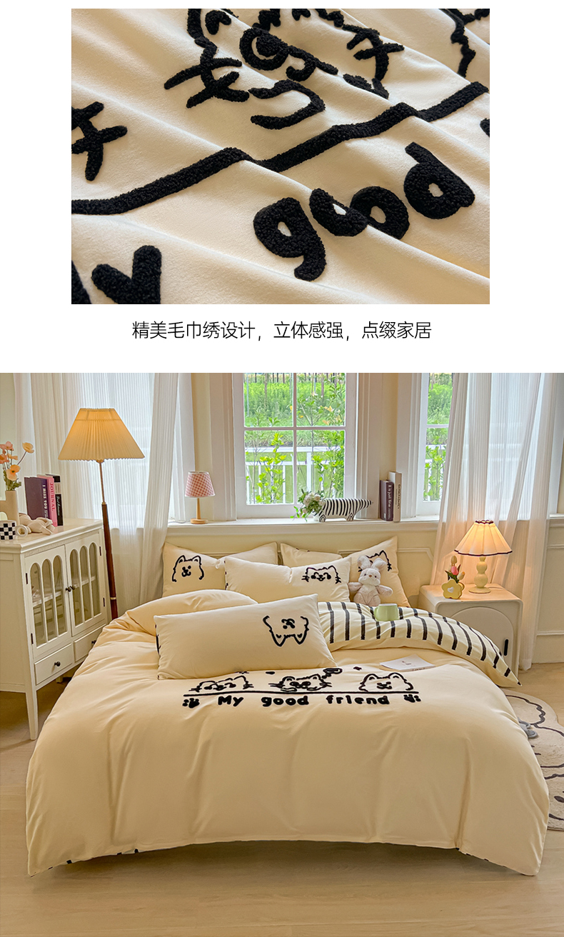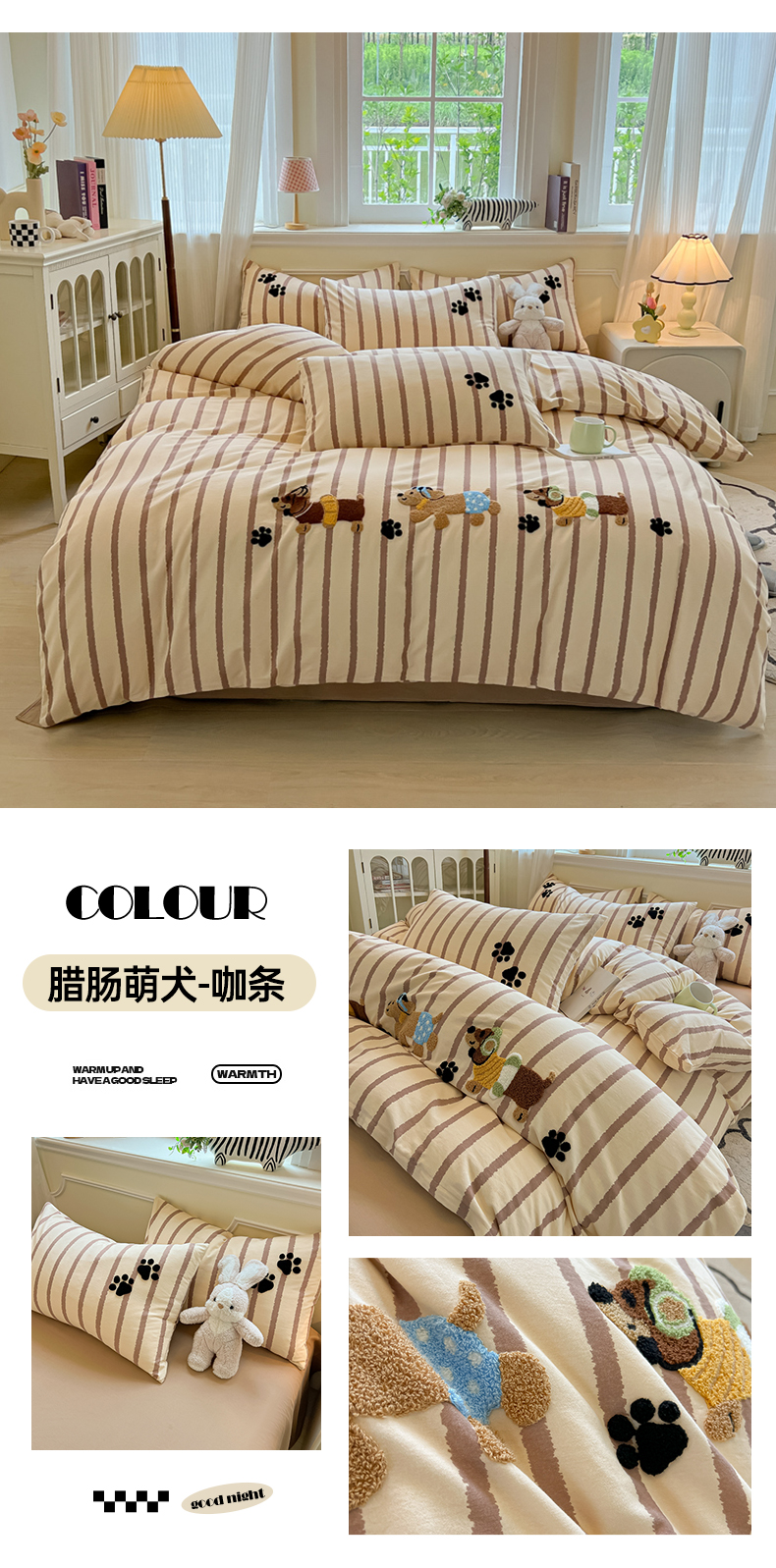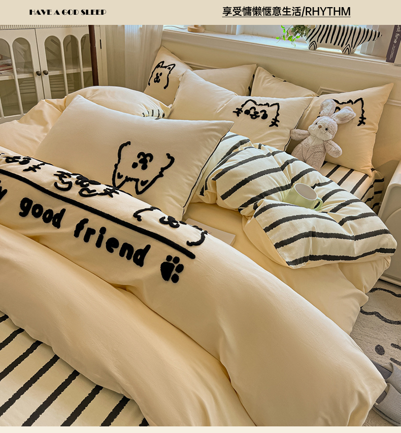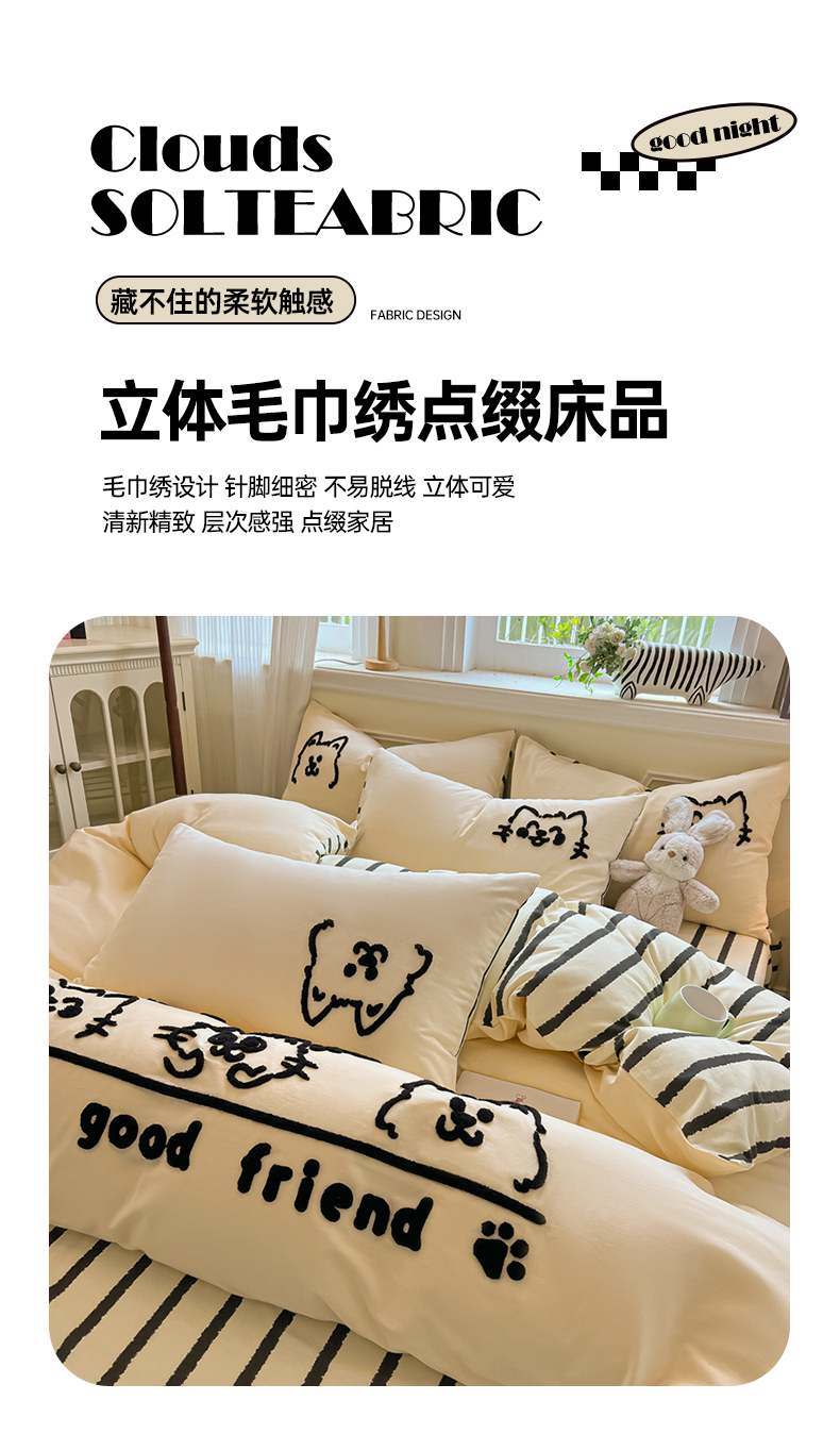 当前位置: 91家纺网 > 商品网购 > 床品套件 > 四件套 > 全棉普通四件套 > 多乐家纺 2025新款全棉纯棉磨毛毛巾绣四件套 腊肠萌犬—黑条
