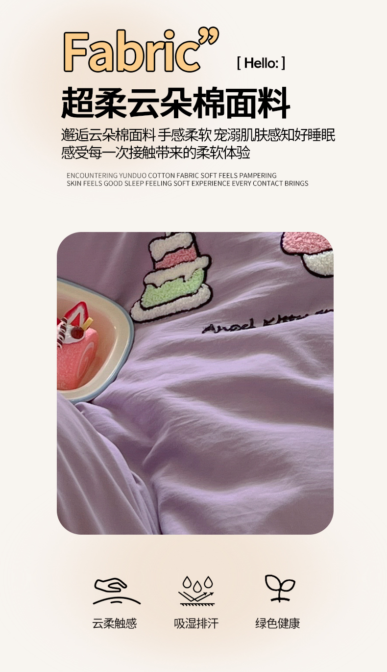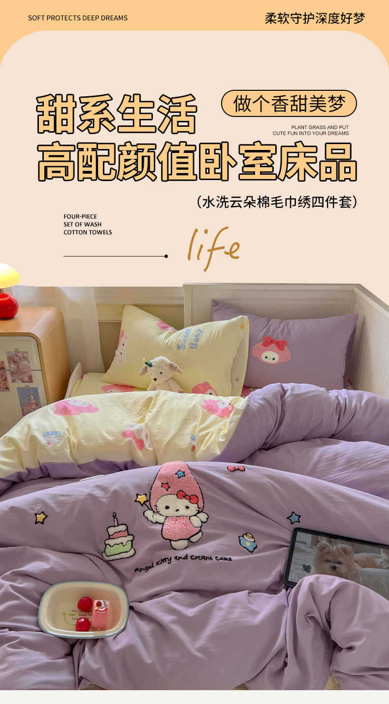 当前位置: 91家纺网 > 商品网购 > 床品套件 > 四件套 > 毛巾绣四件套 > 三元色 2025新款110克水洗云朵棉毛巾绣四件套 蛋糕kt紫